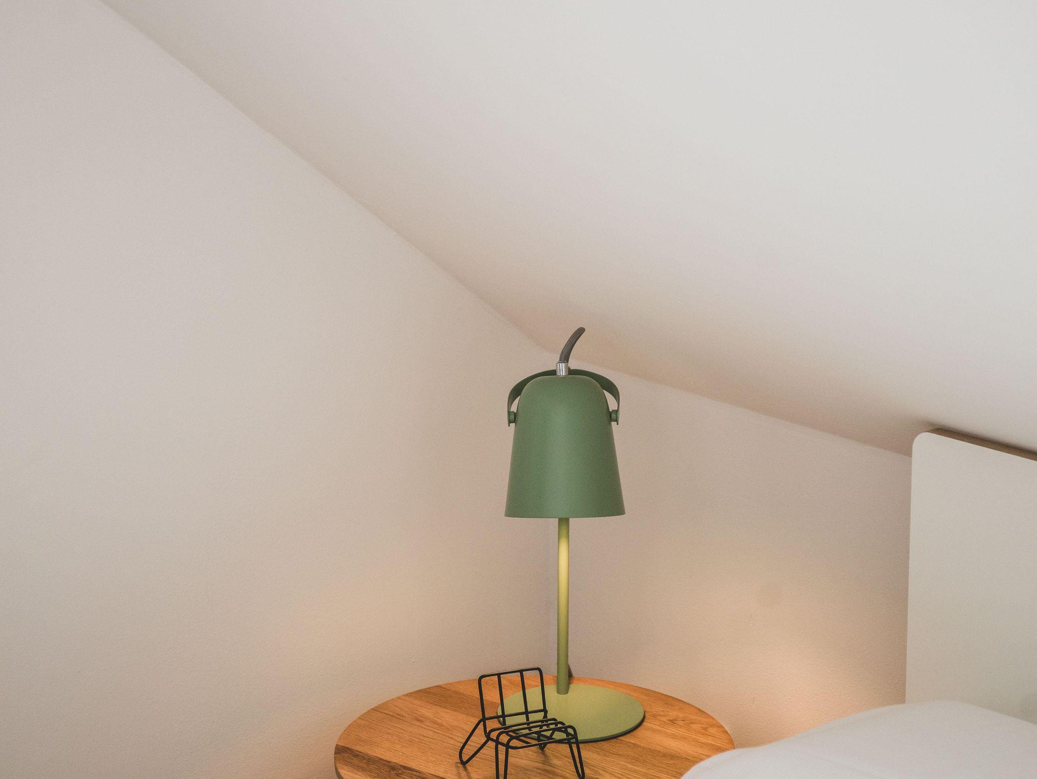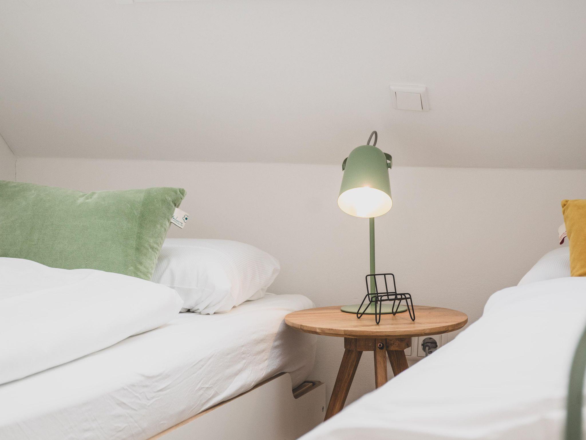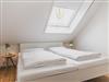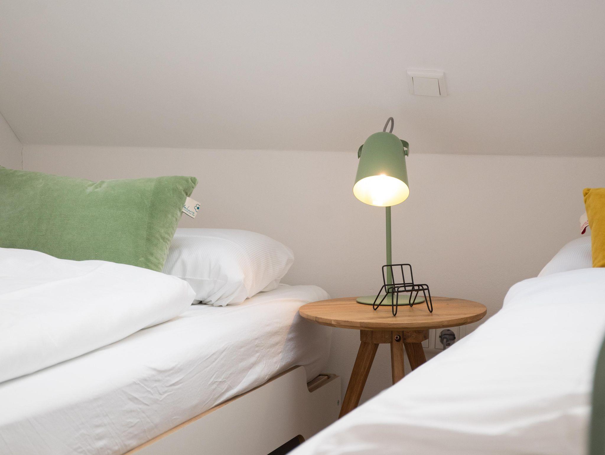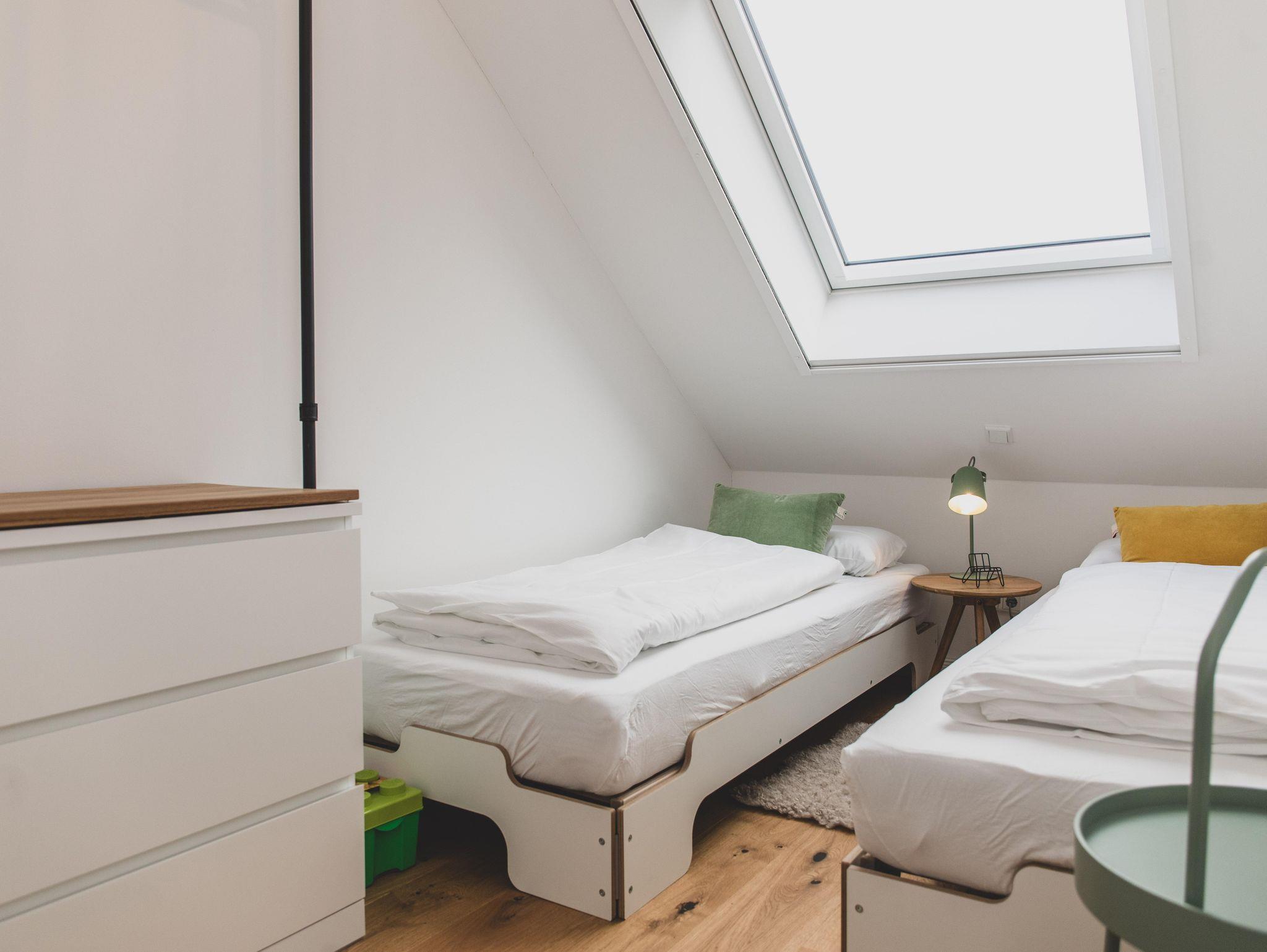 Im Obergeschoß verfügt die Wohnung über zwei gemütliche Schlafzimmer – einmal mit Doppelbett und einmal mit zwei separaten Betten. Je nach Bedarf können diese aber nebeneinandergestellt werden. Beide Schlafzimmer bieten selbstverständlich genug Platz für die Garderobe. Unter den gemütlichen Schrägen kann man entspannt träumen und Kraft für den nächsten Tag tanken. Damit man dabei nicht gestört wird, verfügen die Dachfenster über einen Insektenschutz und Verdunklungsmöglichkeiten.