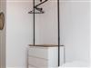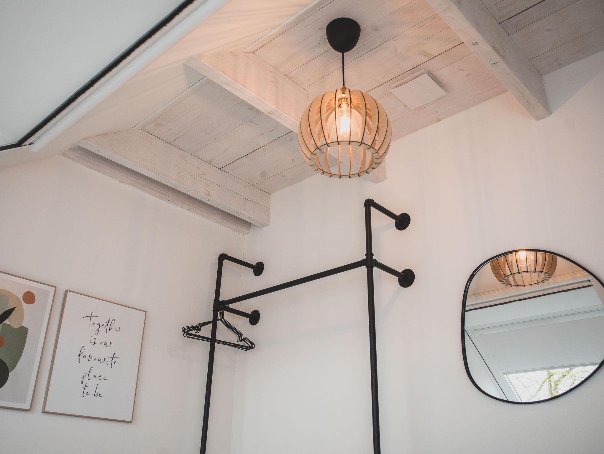 Außerdem befindet sich im OG natürlich noch das Badezimmer mit bodentiefer Dusche. Sowohl das Badezimmer als auch der Flur bieten genug Ablagefläche in Form von wunderschön geschreinerten Maßanfertigungen. Damit es im Badezimmer keinen Stau gibt, findet man im Flur und im Schlafzimmer auch noch praktische Spiegel mit Ablagen.