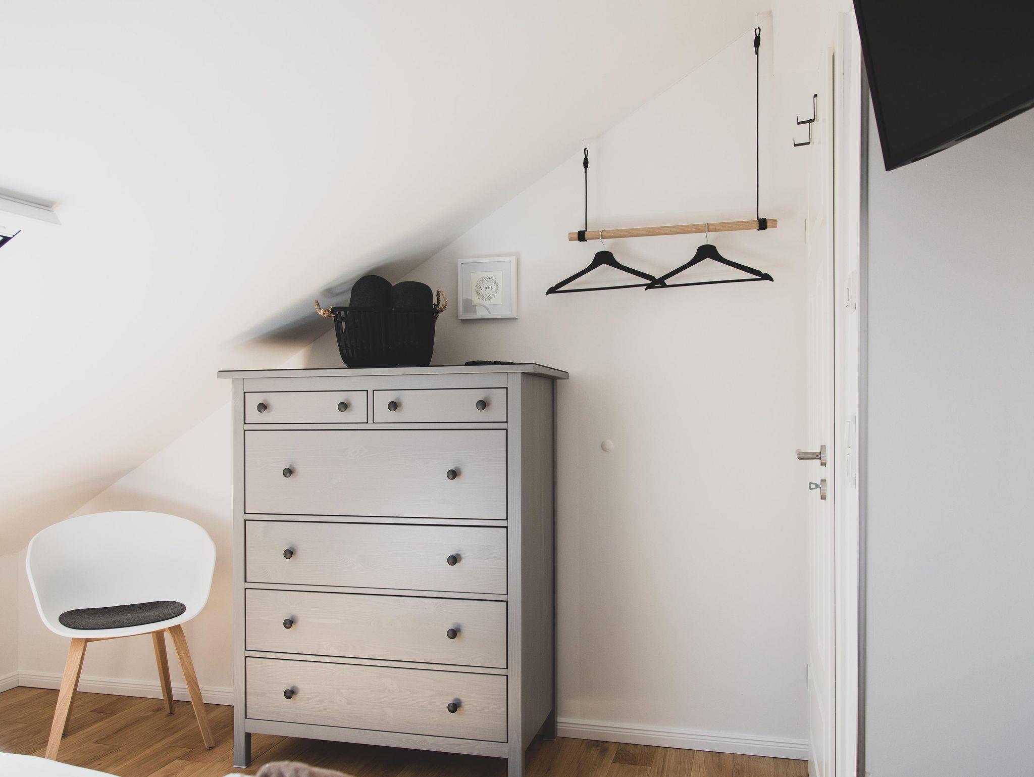 Im Obergeschoss befinden sich drei Zimmer, zwei Zimmer davon sind zur Gartenseite mit Deichblick ausgerichtet. Eines davon mit einem Doppelbett, ein weiteres mit zwei Einzelbetten, die sich jedoch auch mit wenigen Handgriffen in ein Doppelbett oder ein Bett (Stapelbett) verwandeln lassen.