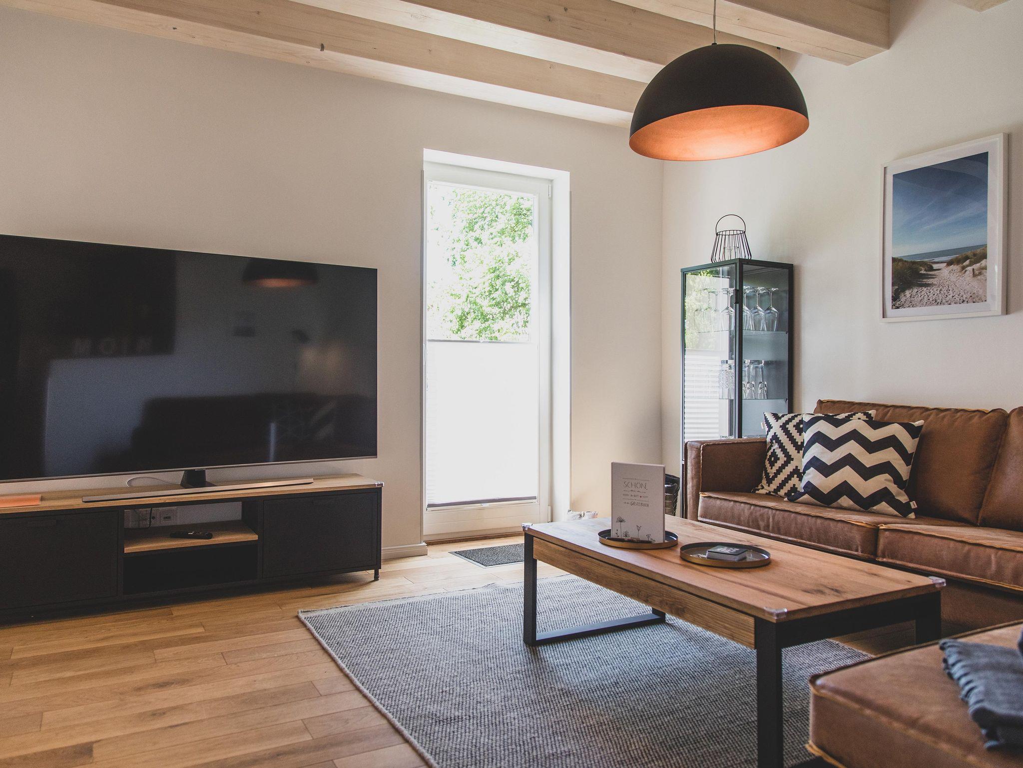 Kochliebhaber über eine voll ausgestattete Küche, einen großen Essbereich und einen gemütlichen Wohnbereich mit einem 75 Zoll Fernseher sowie einer Sonos Musikbox freuen. Auch befindet sich hier ein Gäste WC und ein großzügiger Abstellraum.