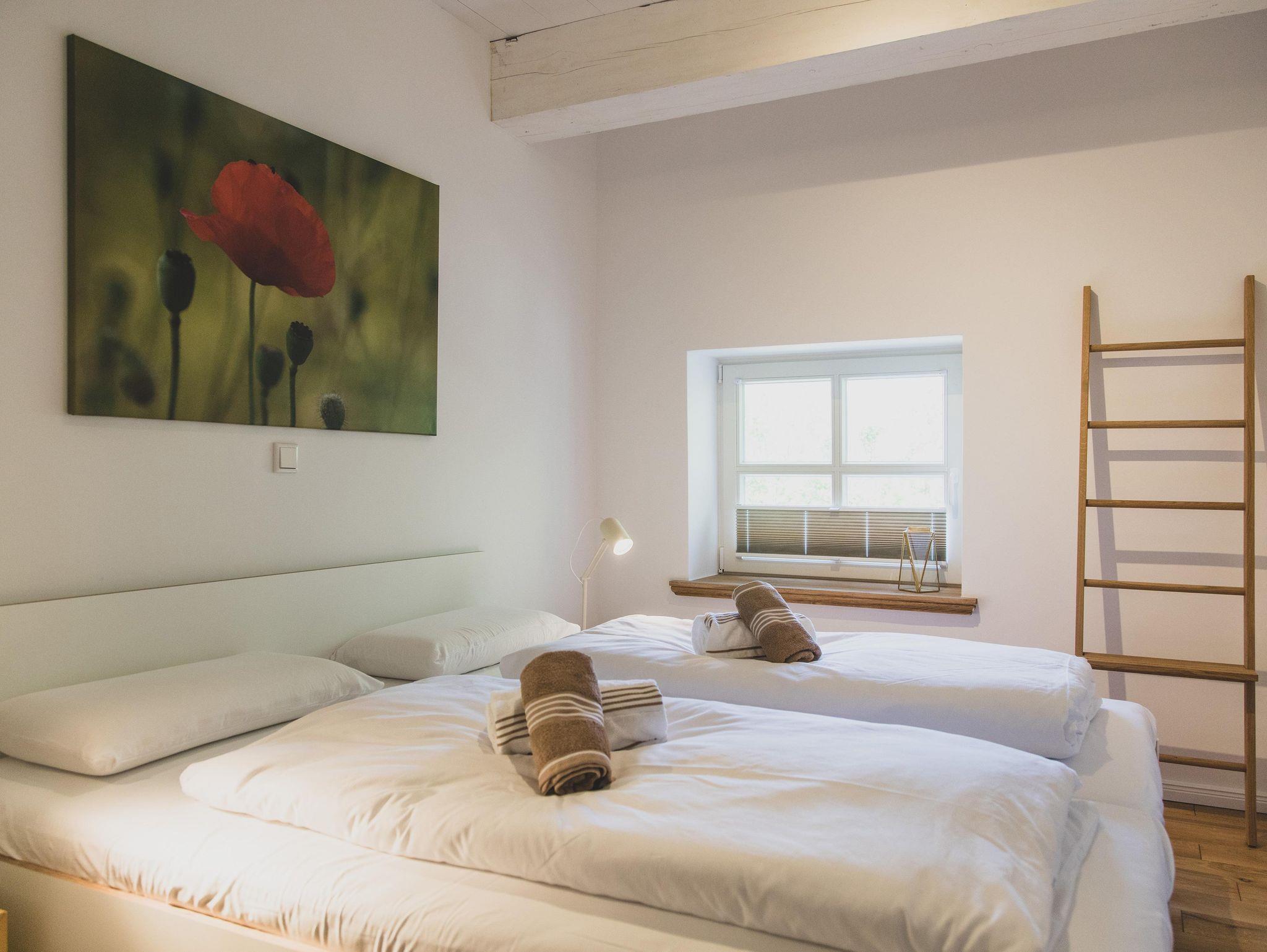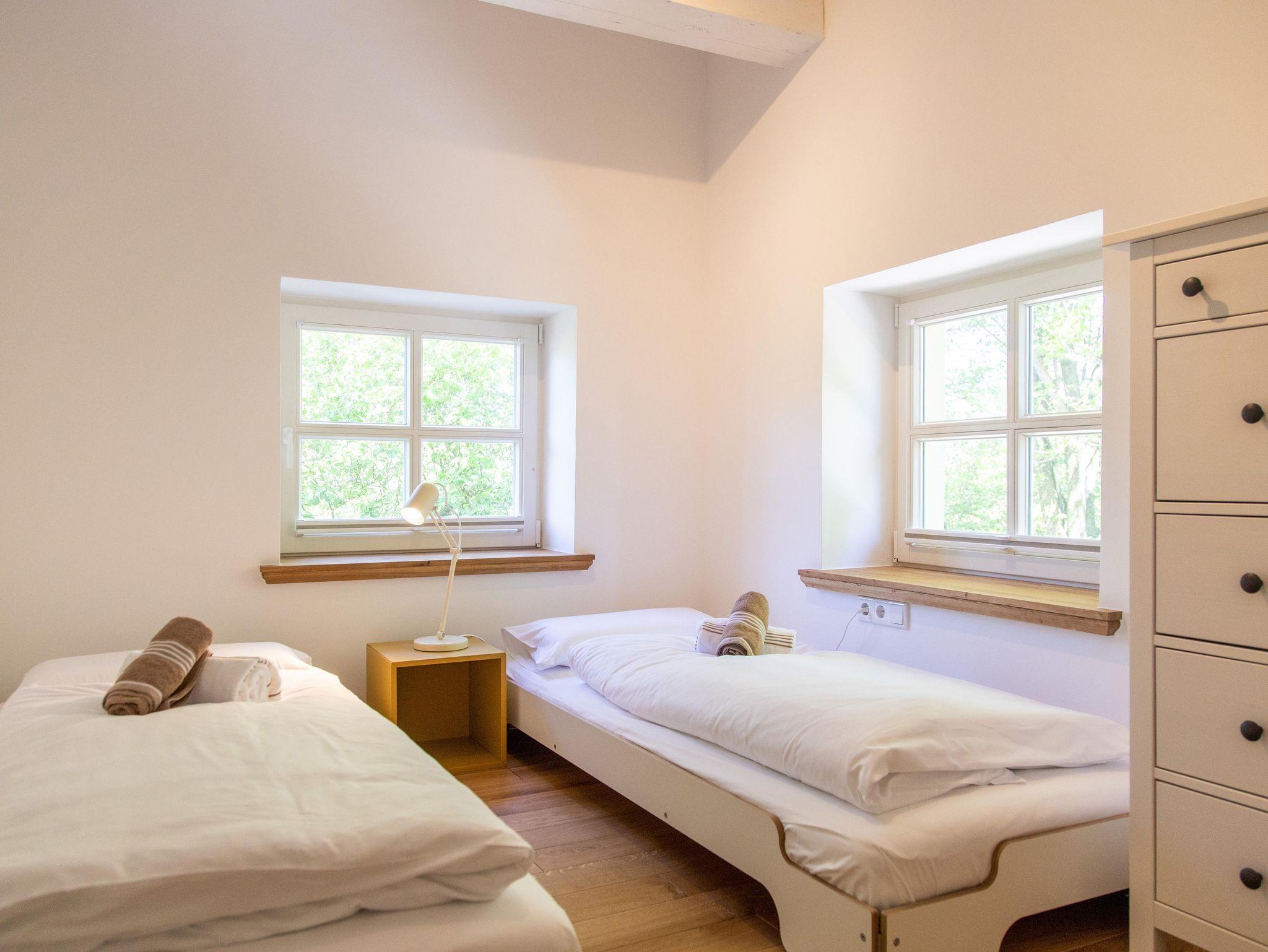Schlafzimmer 1 bietet ein Doppelbett mit Blick in den Obstgarten. Schlafzimmer 2 ist ein schöner heller Raum mit zwei Einzelbetten und Blick in den Park mit Feuerstelle.