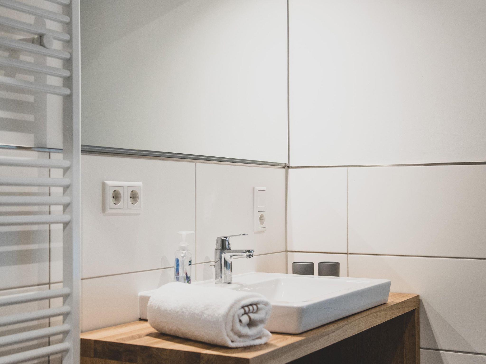 Ein helles Badezimmer mit Fenster, Fußbodenheizung und bodentiefer Dusche lädt nach einer Radtour oder einem Spaziergang an der Nordsee zur Entspannung ein.