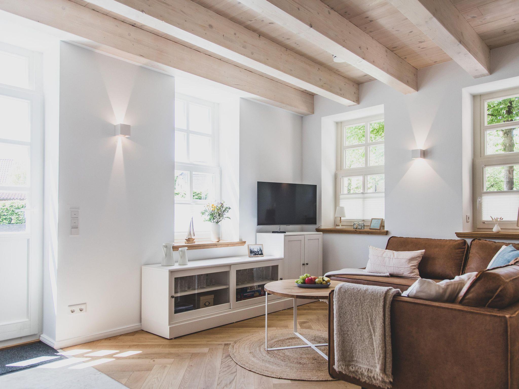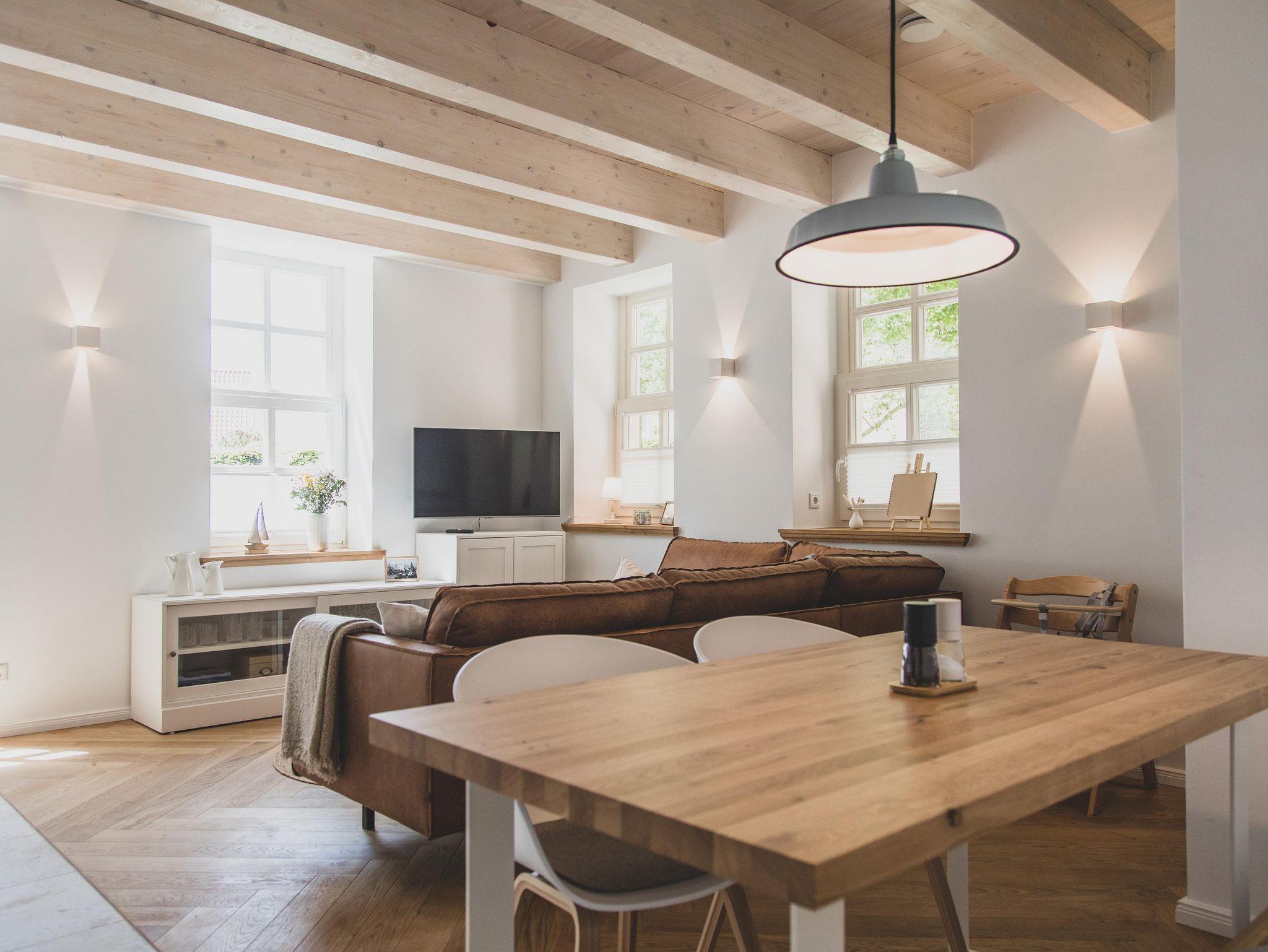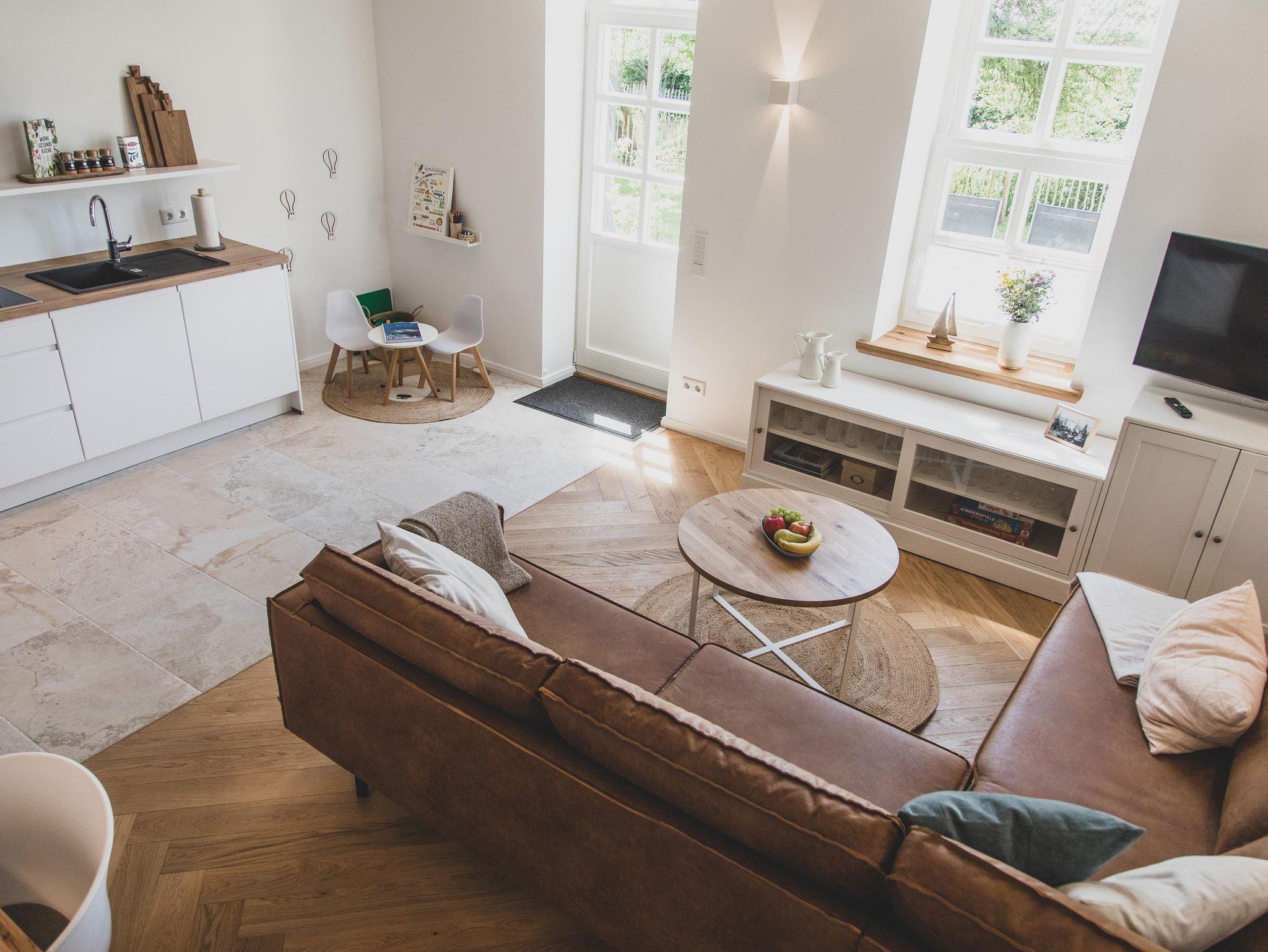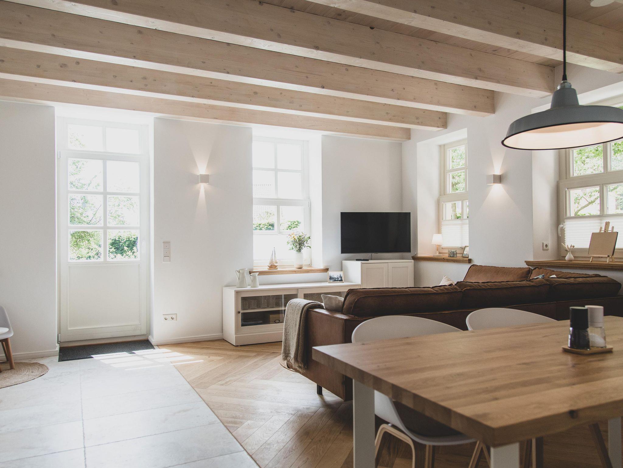 Unsere Wohnungen im Vorderhaus des Ferienhofs verfügen über hohe Decken mit durchgehend erhaltenen alten Deckenbalken. Die historischen Blockrahmenfenster und Fensterläden wurden in Handarbeit neu erstellt und runden den Anblick des denkmalgeschützten Gulfhofs ab. Im ehemaligen Scheunentrakt befinden sich durch bodentiefe Fenster helle und großzügig geschnittene Wohnungen. Alle Ferienwohnungen sind individuell, modern und mit viel Liebe zum Detail eingerichtet und bieten von der Terrasse einen erholsamen Blick auf die Grünflächen mit altem Baumbestand.