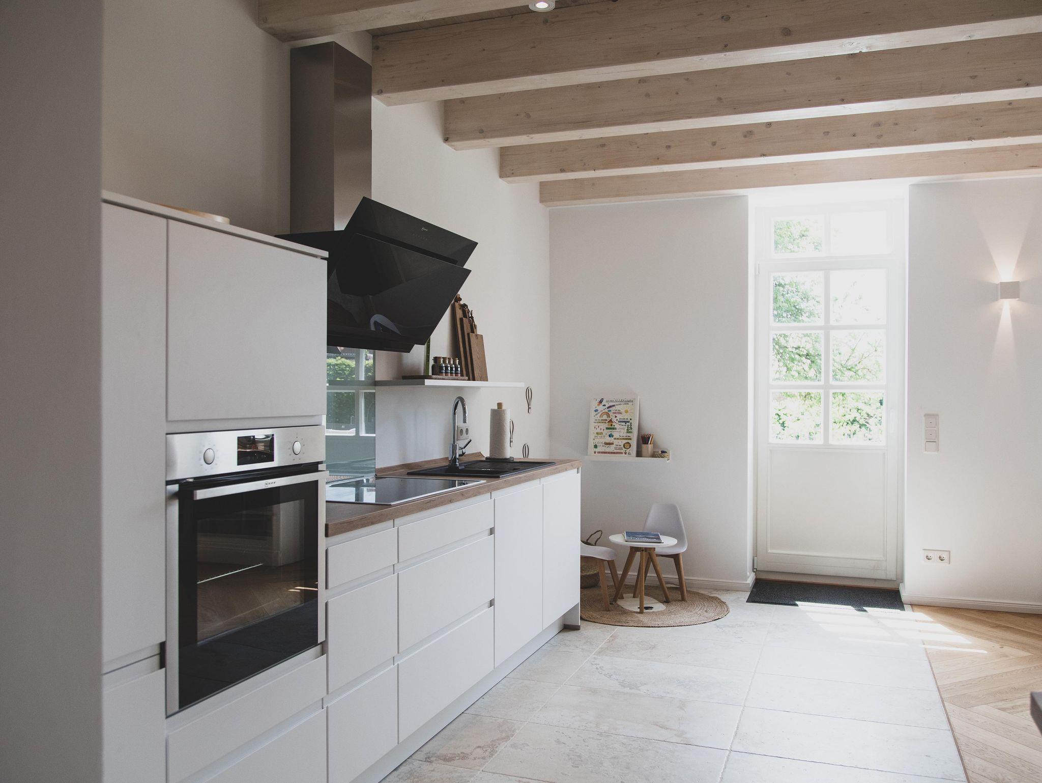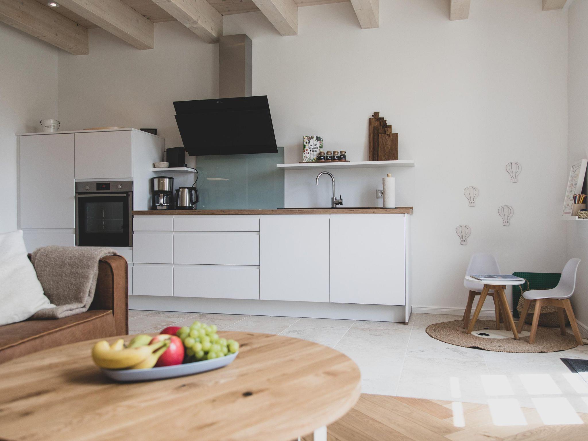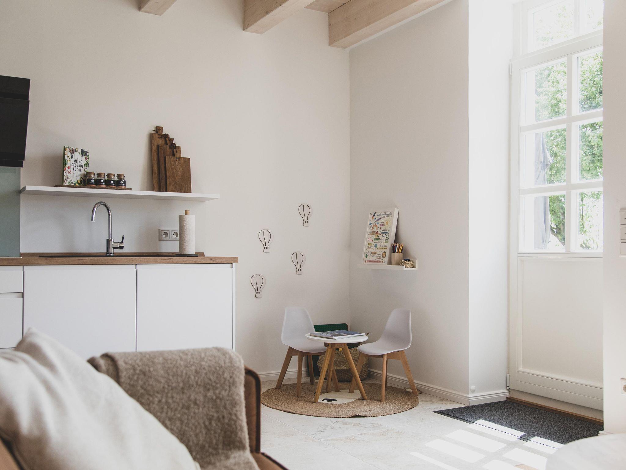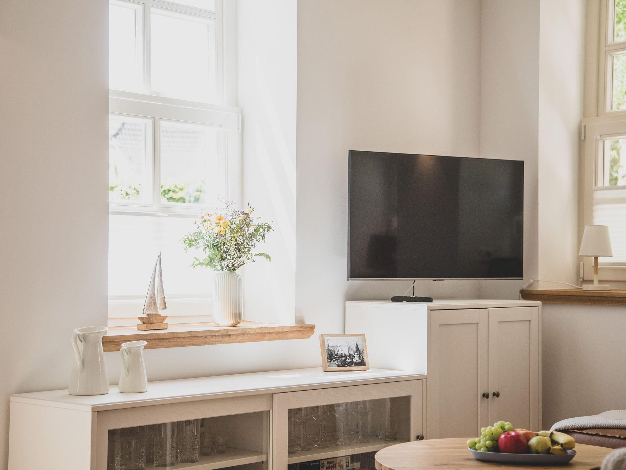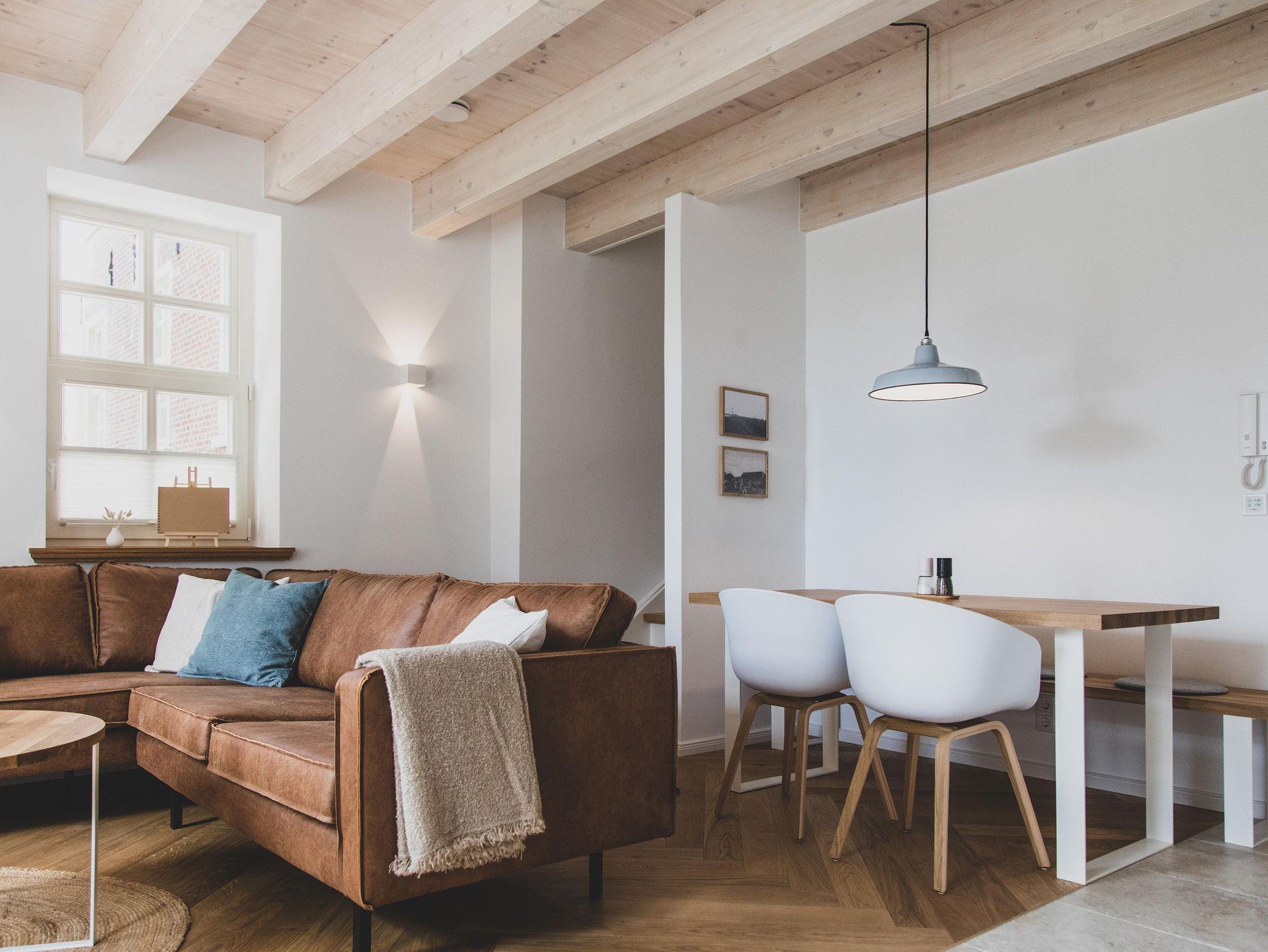 Unsere Wohnungen im Vorderhaus des Ferienhofs verfügen über hohe Decken mit durchgehend erhaltenen alten Deckenbalken. Die historischen Blockrahmenfenster und Fensterläden wurden in Handarbeit neu erstellt und runden den Anblick des denkmalgeschützten Gulfhofs ab. Im ehemaligen Scheunentrakt befinden sich durch bodentiefe Fenster helle und großzügig geschnittene Wohnungen. Alle Ferienwohnungen sind individuell, modern und mit viel Liebe zum Detail eingerichtet und bieten von der Terrasse einen erholsamen Blick auf die Grünflächen mit altem Baumbestand.