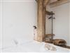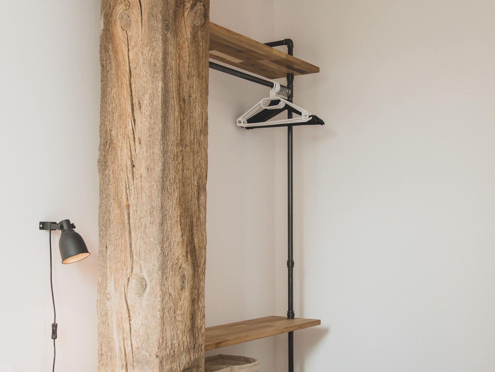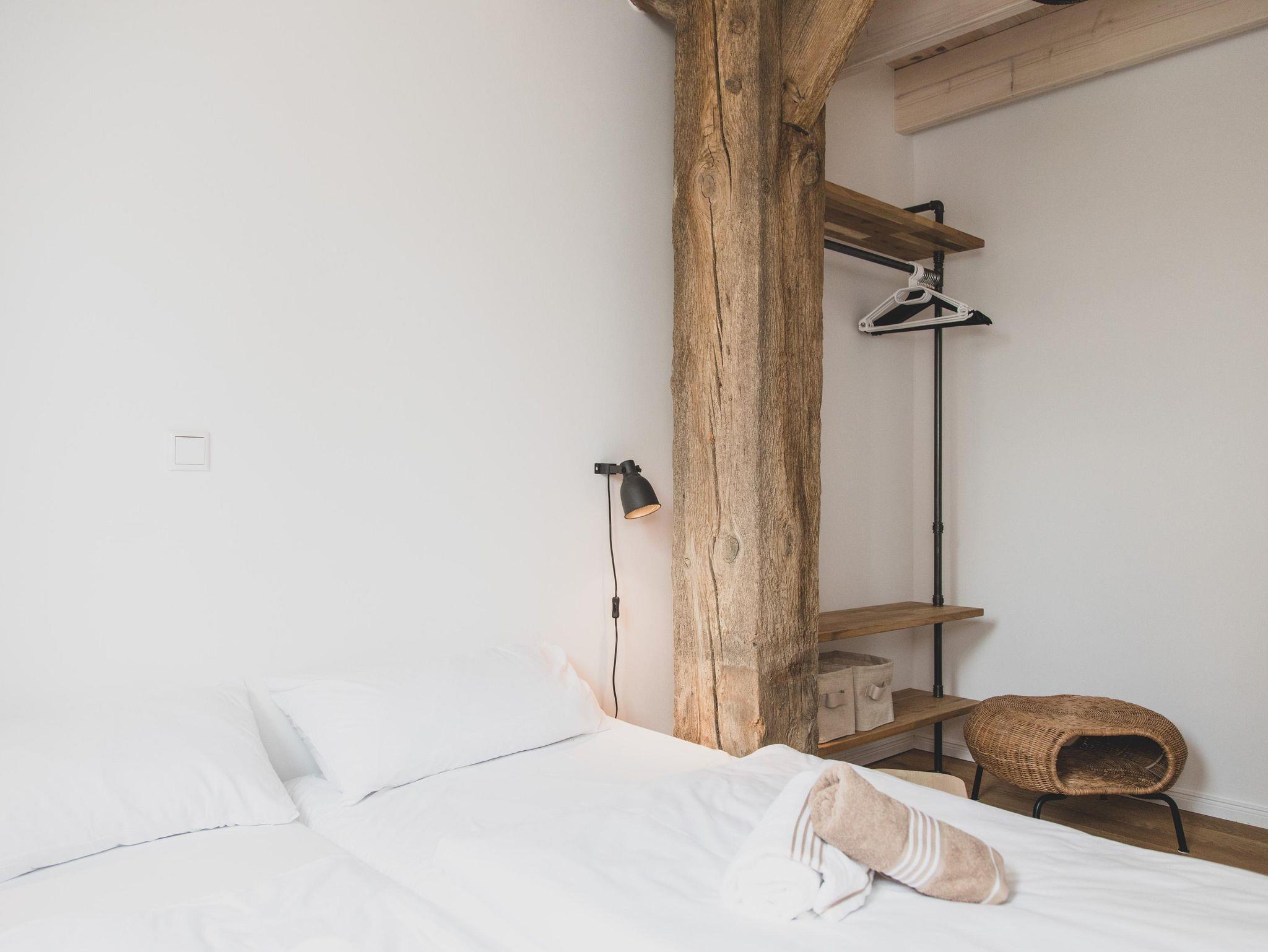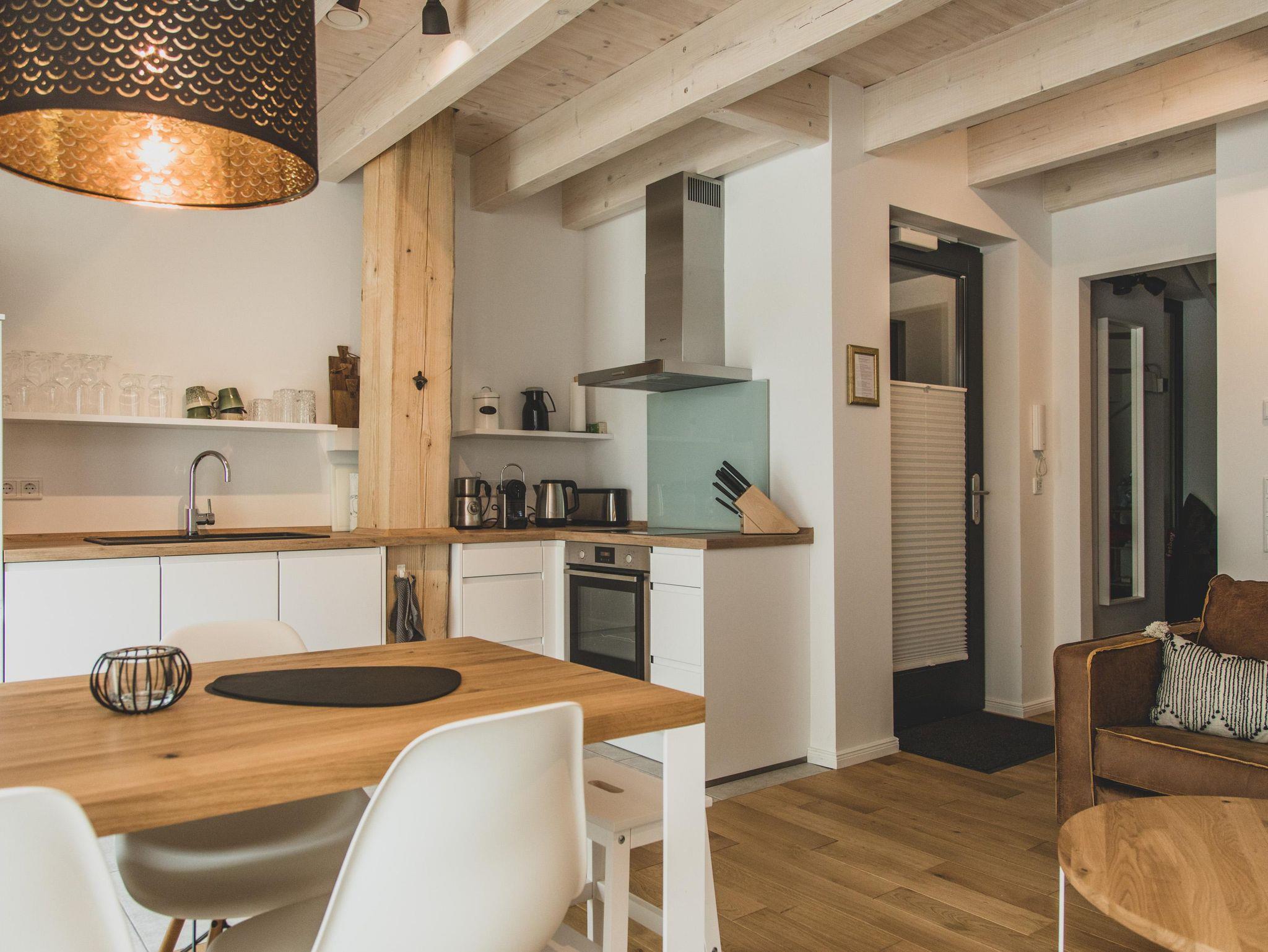 Ein denkmalgeschützter Träger des Ständerfachwerks, der auf beiden Wohnebenen sichtbar ist, verleiht der Wohnung besonderen Flair.