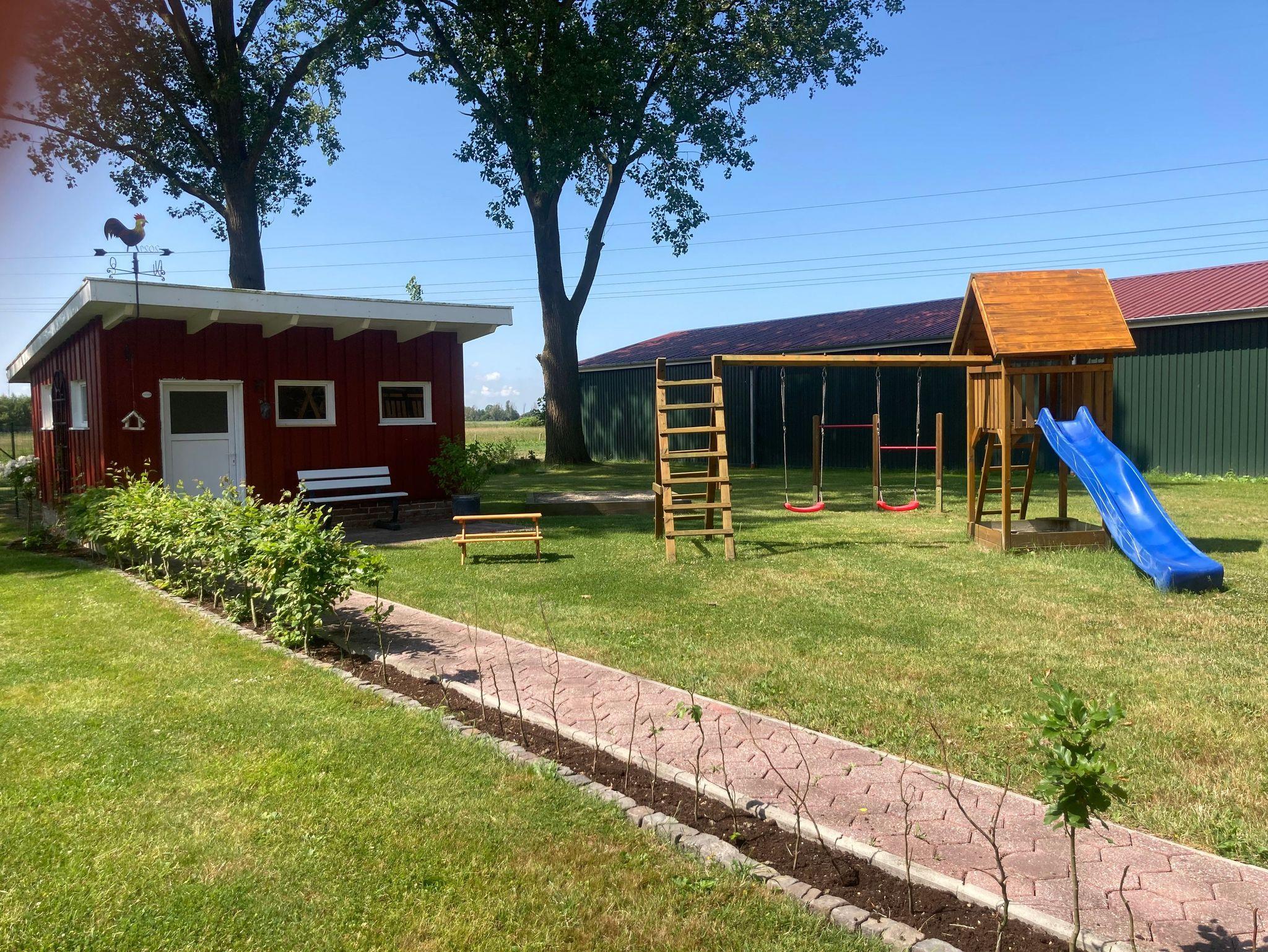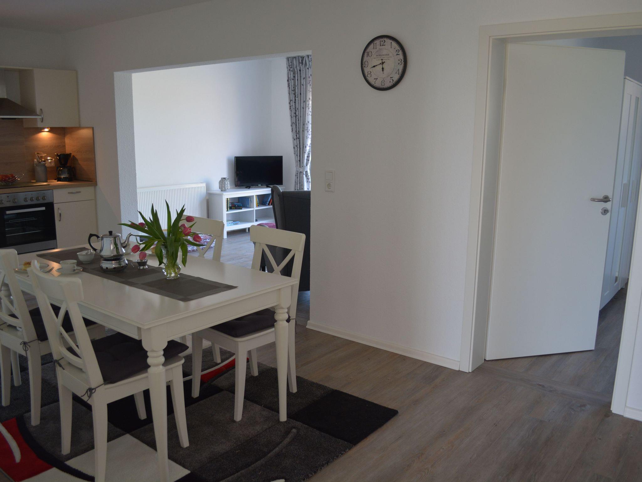 Umgeben von wunderschöner Natur und ruhig gelegen, befindet sich diese erst 2021 fertiggestellte großzügige Ferienwohnung. Das barrierefreie Erdgeschoss mit seinem lichtdurchfluteten Flur verfügt über ein gemütliches Schlafzimmer mit Doppelbett (1,80 m x 2,00 m) und großem Kleiderschrank sowie einem großzügigen Wohnzimmer mit Sitzgarnitur und Flat- TV. Das Bad mit Fenster ist mit einer Fußbodenerwärmung, Handtuchtrockner, Waschtischanlage, ebenerdiger Dusche und einem WC ausgestattet. Die helle Küche mit gemütlicher Essecke, Cerankochfeld, Kühlschrank mit Gefrierfach, Backofen, Geschirrspüler, Kaffeekocher, Pad-Maschine, Wasserkocher, Toaster u.v.m. lässt keine Wünsche offen. Von der Küche aus gelangen Sie auf die eigens zur Ferienwohnung gehörenden Terrasse mit Sitzgruppe, Sonnenschirm und eigenem Grill. Von dieser aus haben Sie einen wunderschönen und weiten Ausblick auf die umliegenden Felder und Wiesen und können die herrliche Abendsonne genießen. Über eine breite Treppe gelangen Sie in das Obergeschoss der Ferienwohnung. Hier befindet sich ein weiteres geräumiges Schlafzimmer mit drei einzelnen Betten (0,90m x 2,00 m) sowie einem Kleiderschrank. Im großzügig gestaltete Flurbereich wurde eine gemütliche Lese- bzw. Spielecke eingerichtet. Der Internetzugang ist für unsere Gäste selbstverständlich kostenfrei. Wachmaschine und Wäschetrockner befinden sich ebenfalls in der Anlage und können gegen Gebühr genutzt werden. Handtücher und Bettwäsche werden einmalig gestellt (weitere Wechsel sind selbstverständlich gegen Gebühr möglich). Wir bitten im Interesse unserer allergischen Gäste um Verständnis, dass das Mitbringen von Haustieren nicht gestattet ist. Das Rauchen ist im Außenbereich möglich. Vermietung ausschließlich an Feriengäste, nicht an Firmen.