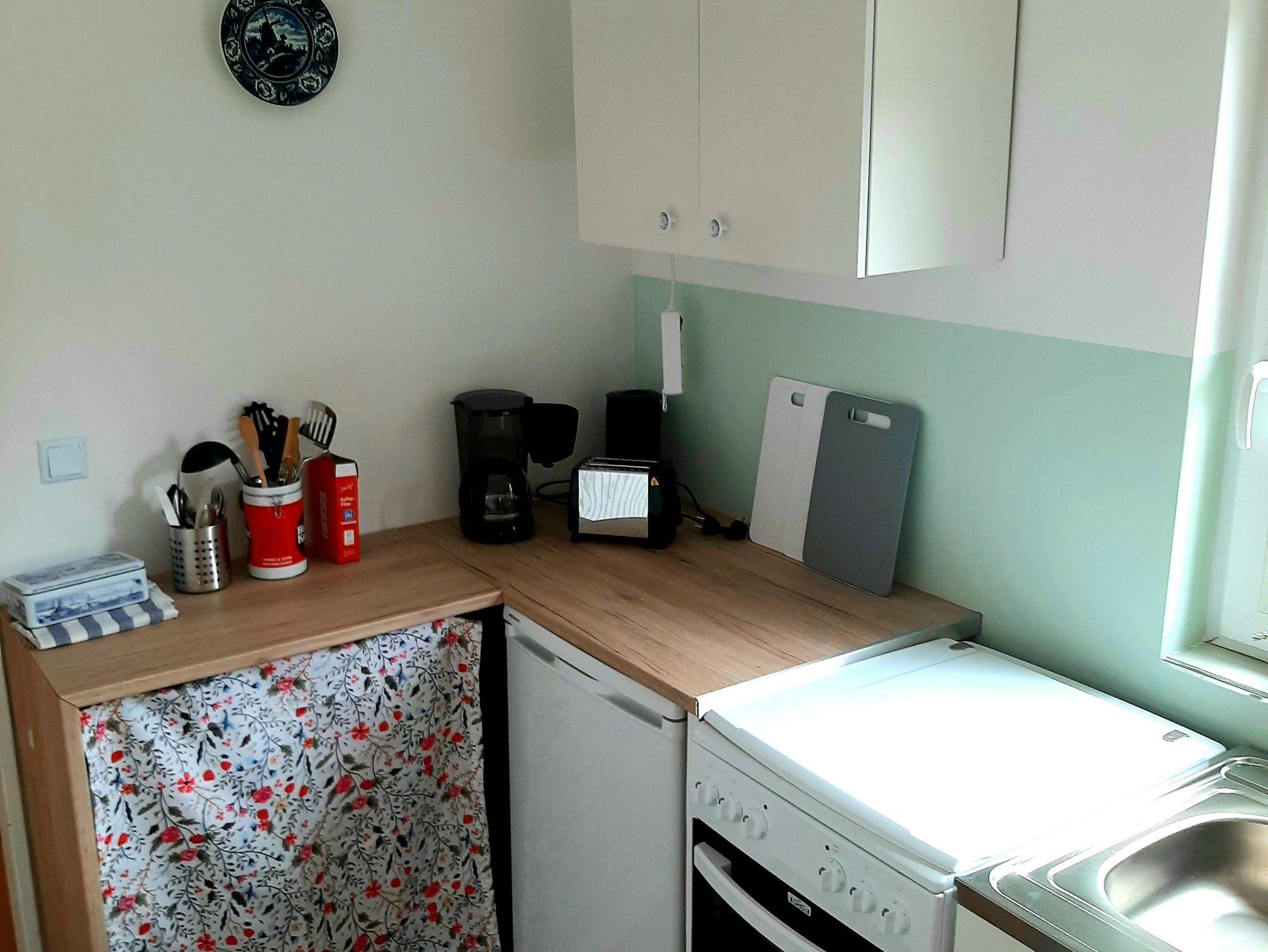 Küche mit Herd/Backofen, Kaffeemaschine, Toaster, Wasserkocher, Kühlschrank (ohne Gefrierfach)