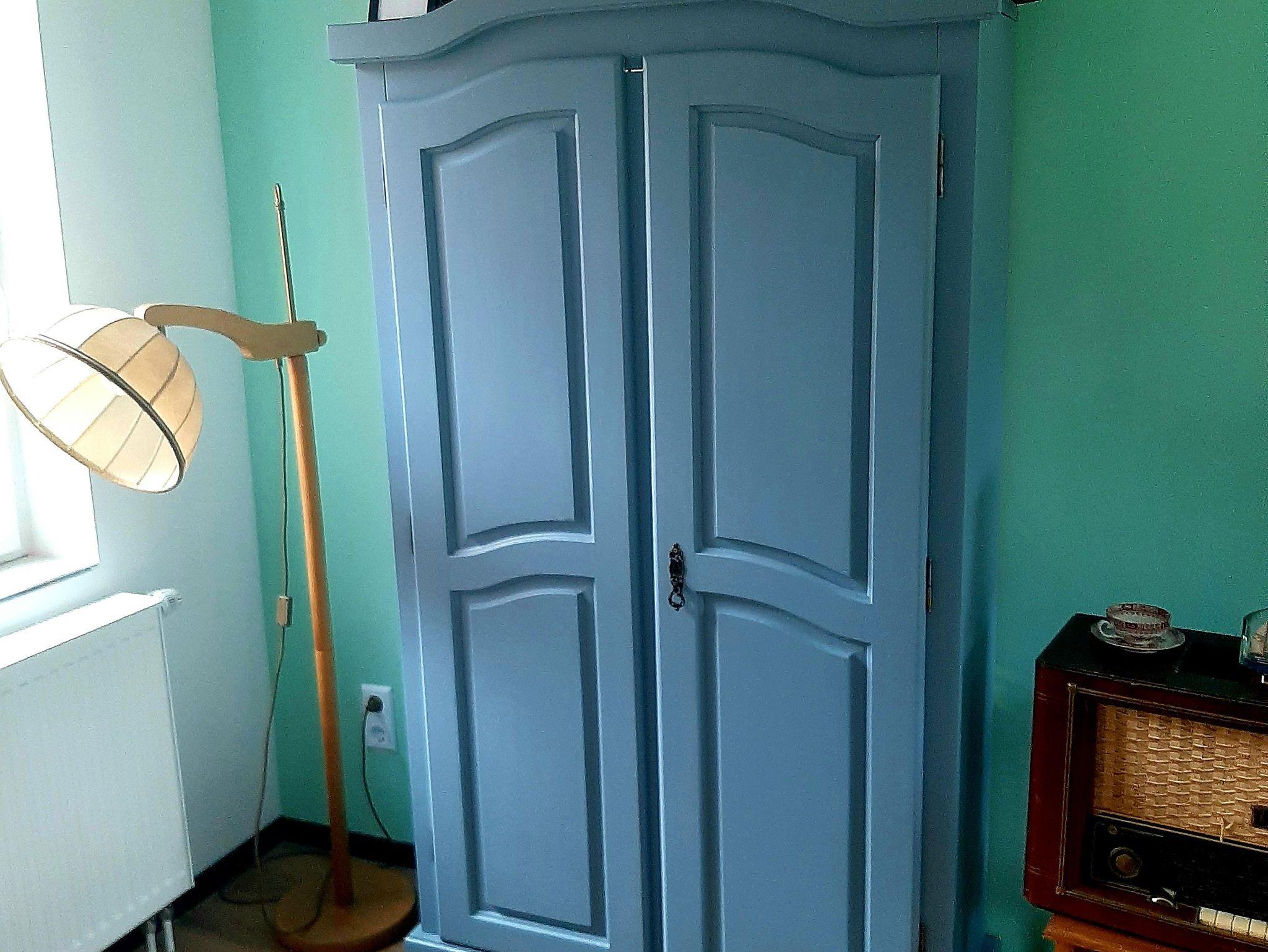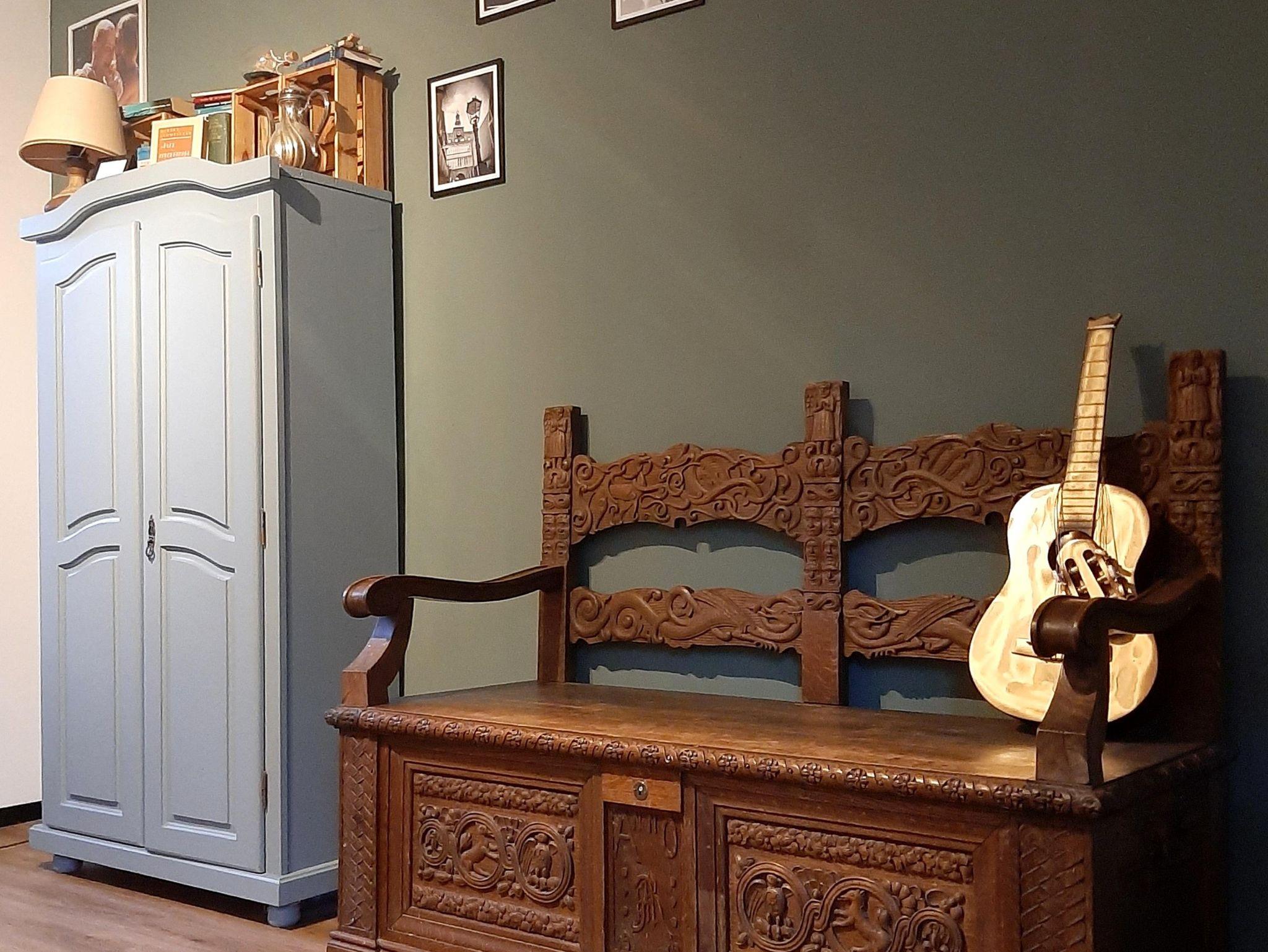 Es verfügt über 1 Schlafzimmer, 1 Wohnzimmer, Küche, Bad. Das Schlafzimmer betritt man durch Die kleinste begehbare Kunstgalerie der Welt, einen umfunktionierten Schrank. (siehe Fotos)