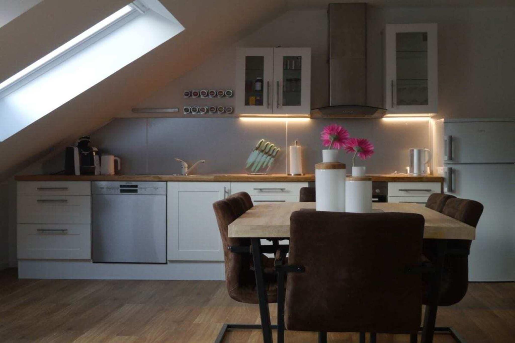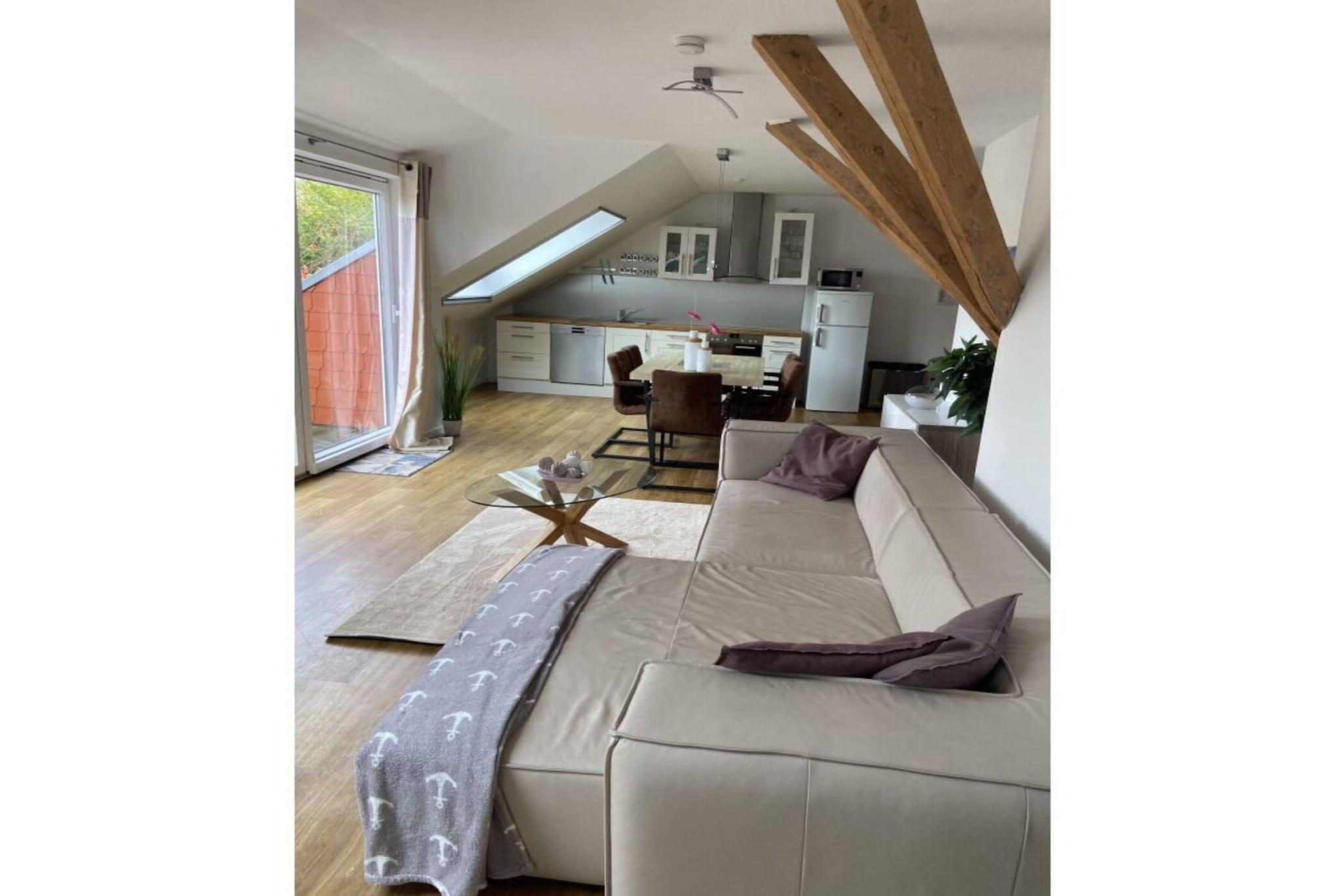 Ferielejligheden er en loftslejlighed (99 m² etageareal), som vil blive integreret i Gulfhof som ny bygning i 2017. Lejligheden blev for nyligt færdigbygget. Du finder en stor stue med et åbent, fuldt udstyret køkken, to soveværelser, et rummeligt brusebadeværelse og et depotrum integreret i lejligheden. Boligarealet er udvidet med en loggia indlejret i taget, hvorfra du kan nyde Østfrislands vidde... Inde i stalden er der flere fællesrum, som er tilgængelige for alle feriegæster i "Uplewarder Grashaus". Dette omfatter et spillelokale og et bordfodboldrum.