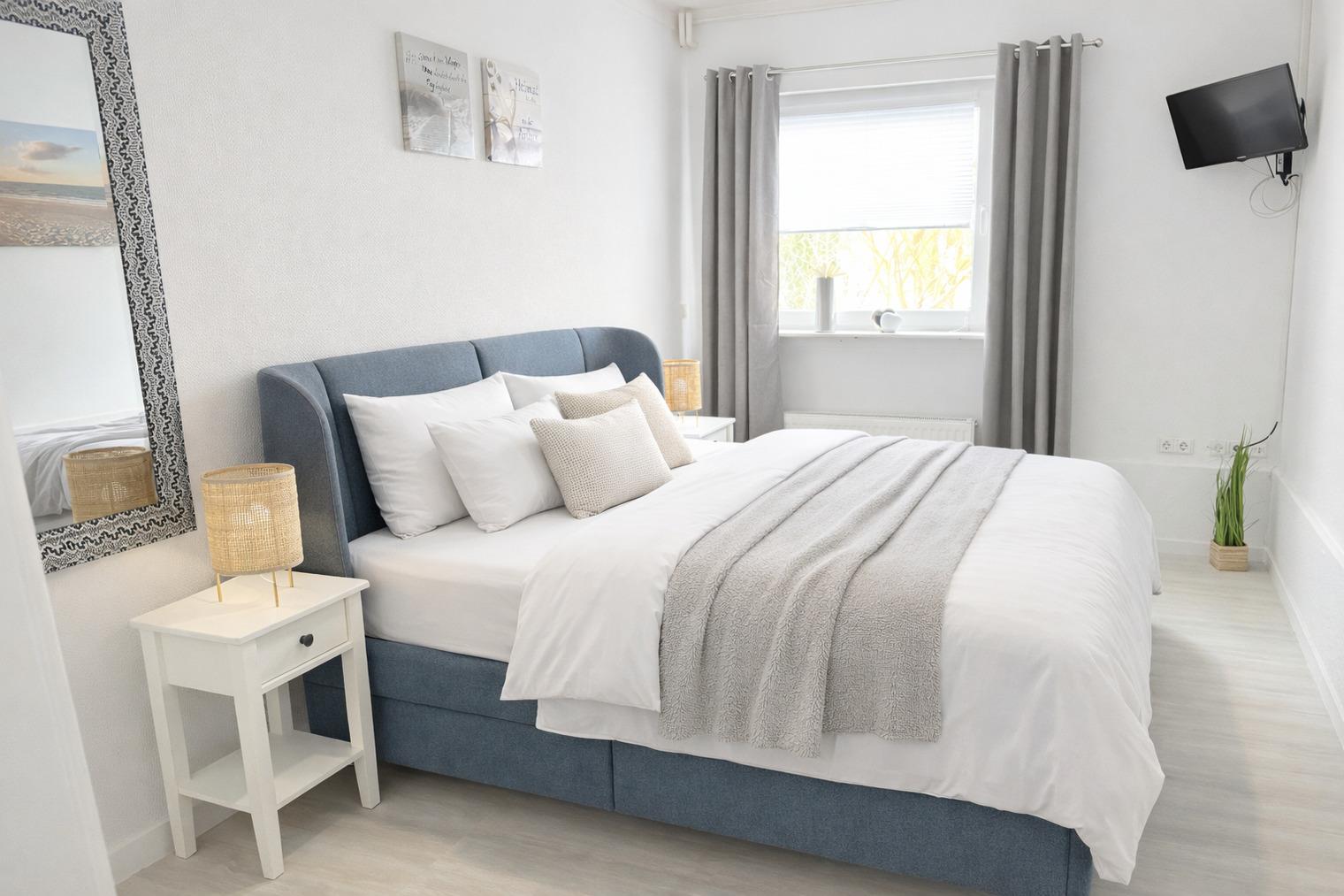 • Schlafzimmer mit komfortablem Doppelbett (180 × 200 cm) und TV
