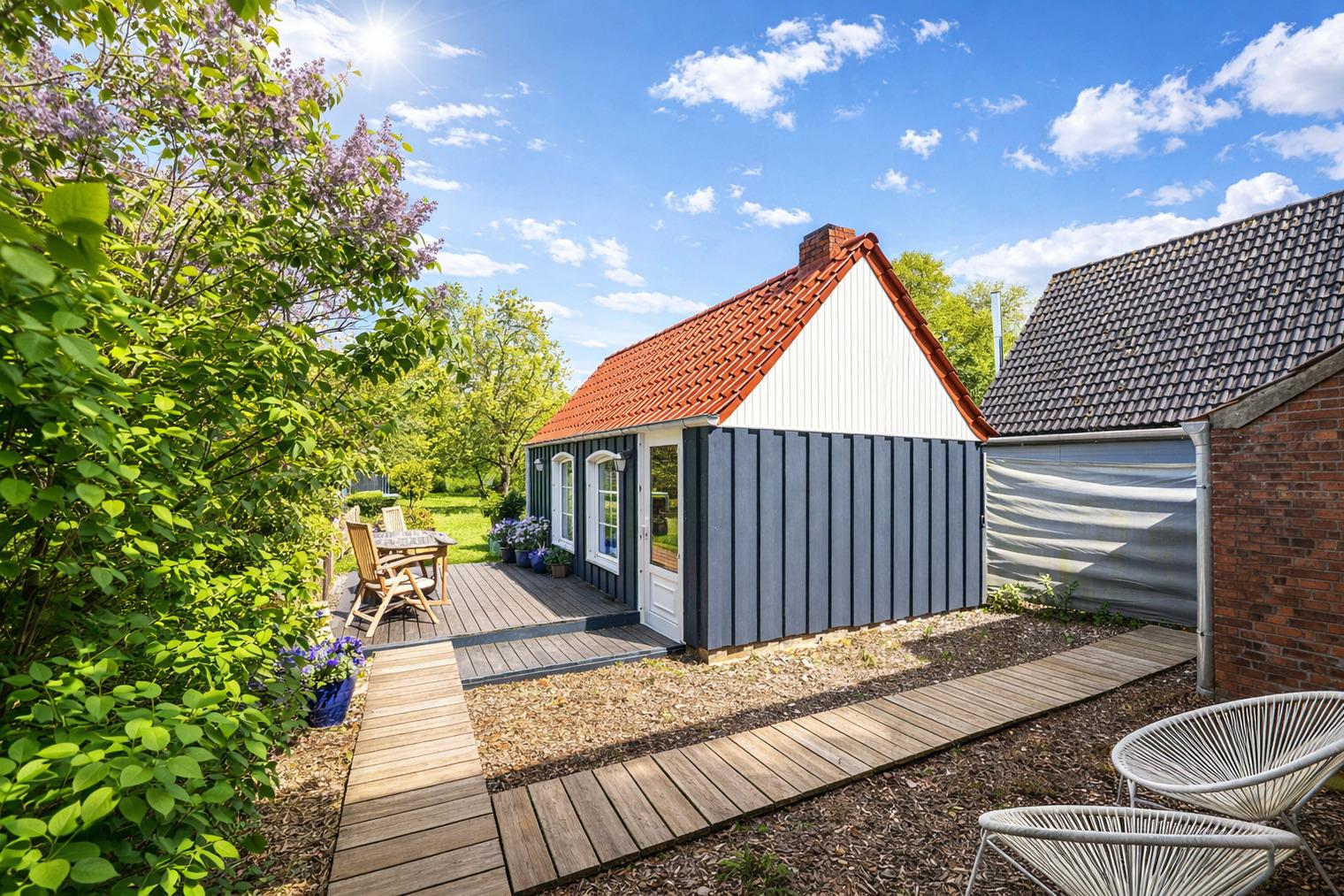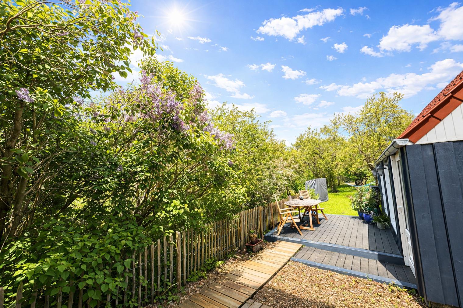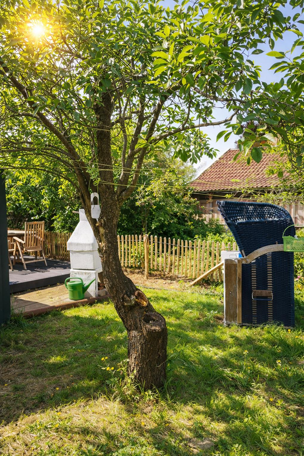 ?? Ein Zuhause auf Zeit – mit Herz eingerichtet Die liebevoll renovierte Doppelhaushälfte bietet Raum für zwei Menschen, die das Einfache und Echte lieben. Jeder Raum wurde mit Sorgfalt gestaltet — warm, klar und hochwertig. Drinnen erwartet Sie: ein helles, gemütliches Wohnzimmer mit großer Eckcouch und Smart-TV ein Schlafzimmer mit einem großzügigen Doppelbett (180×200 cm) und TV eine große Wohnküche, ausgestattet mit modernen Miele-Geräten ein modernes Bad mit bodentiefer Regendusche & Doppelwaschbecken Waschmaschine, Handtücher & Bettwäsche sind selbstverständlich vorhanden Elektrische Jalousien sorgen für Geborgenheit, Insektenschutz für ruhige Sommernächte. Und über allem liegt dieses Gefühl: Hier ist alles leicht. ?? Ein Garten wie aus einem Sommertraum Der weitläufige Naturgarten ist ein kleines Paradies — wildromantisch, grün, lebendig. Zwischen Pflaumen-, Mirabellen- und Apfelbäumen findet jeder seinen Lieblingsplatz. Vielleicht ist es… die Hängematte, sanft schaukelnd im Schatten der Bäume der Strandkorb auf der Holzterrasse, mit Blick ins Grün oder das Gartenhaus mit Kaminofen — der perfekte Ort für gemütliche Stunden am Abend Und wenn im Spätsommer die Früchte reif sind, dürfen Sie sich gerne bedienen. Hier gehört die Natur einfach dazu.