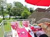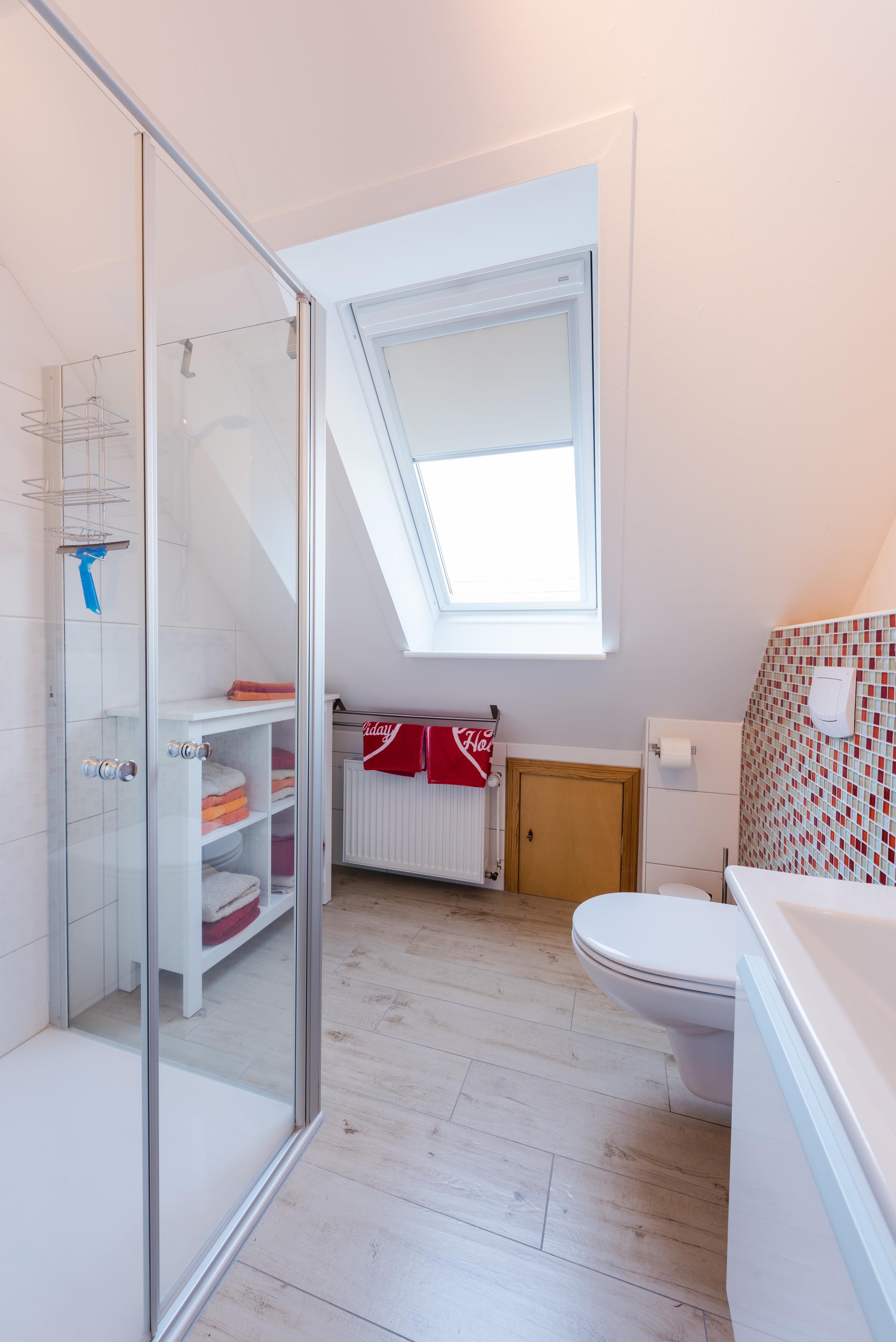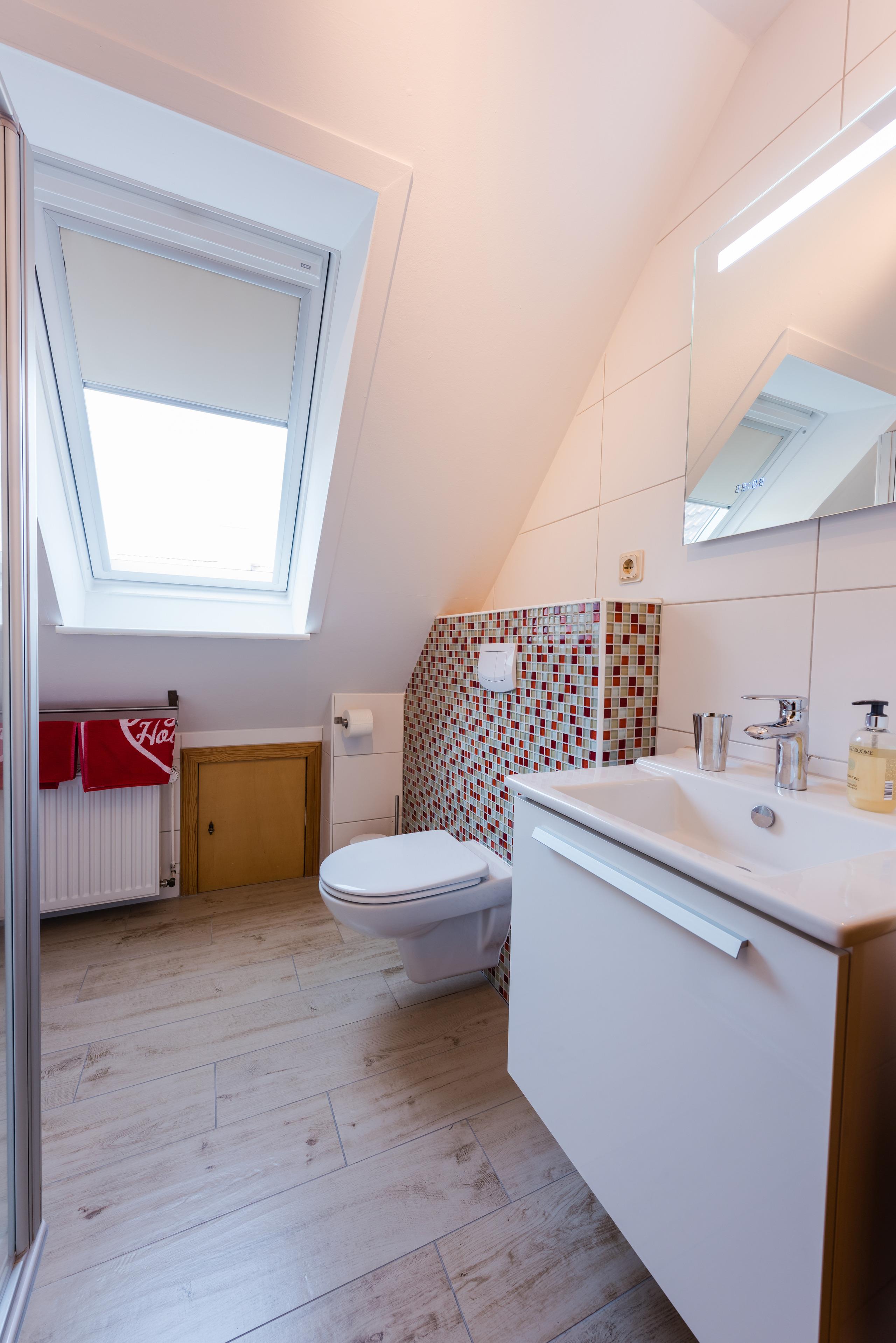 Das Duschbad mit WC ist modern und zweckmäßig. Vor der Wohnung gibt es einen großen Balkon, der sich getrost Dachterrasse nennen darf, mit einladendem Sitzplatz zum Frühstücken und mehr - ein echter Sonnenplatz.