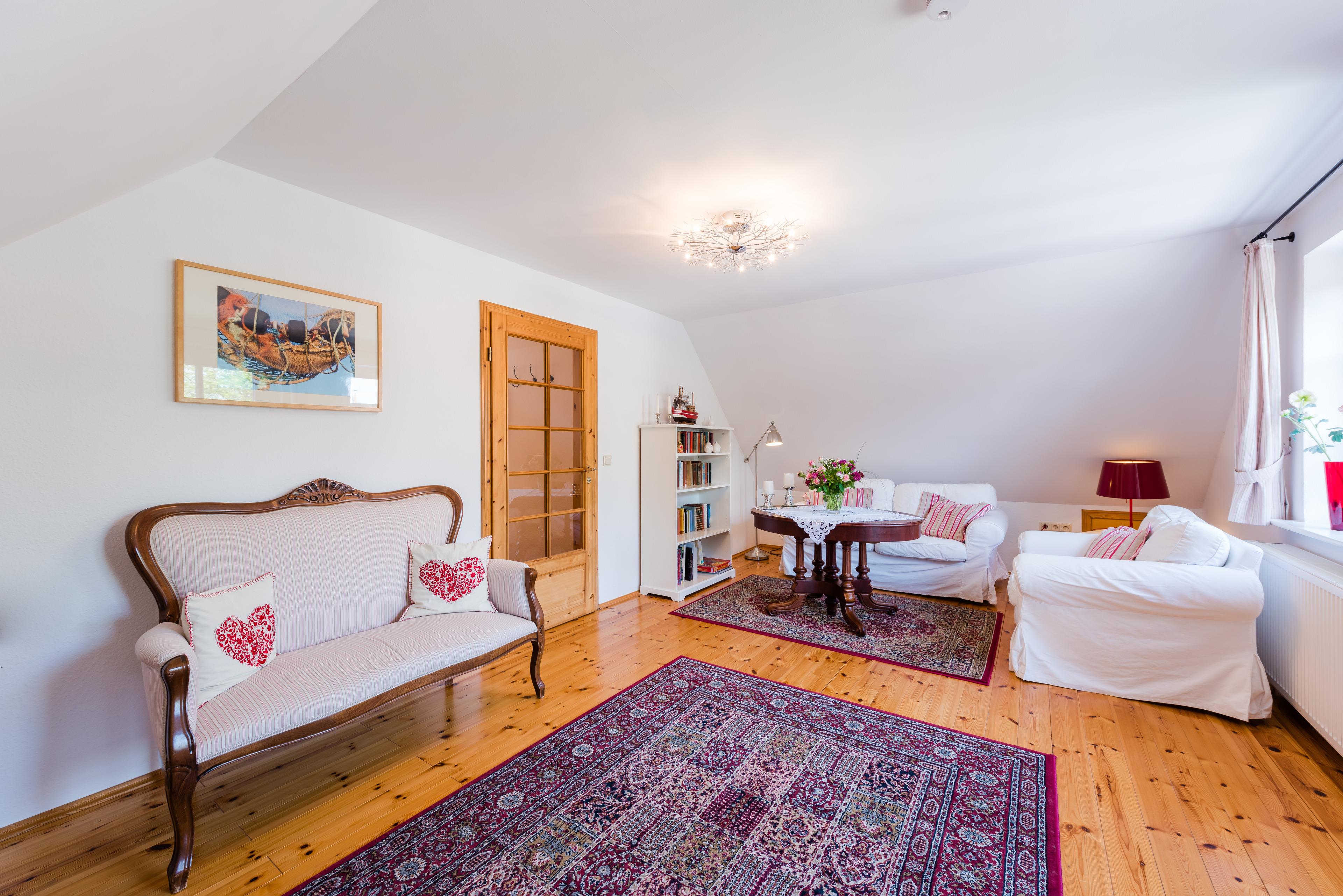 Der "Deichkieker" ist geräumig und sehr großzügig eingerichtet. Die Küche in rotem Lackdesign setzt Akzente. Sie hat alles, was die Ferien schöner macht - und hat schon so manchen zum Kochen verführt. Es gibt ein Doppelbett-Schlafzimmer sowie ein kleines Einzelbett-Schlafzimmer. Das lichtdurchflutete Wohnzimmer ist modern eingerichtet - mit einigen antiken Ergänzungen.