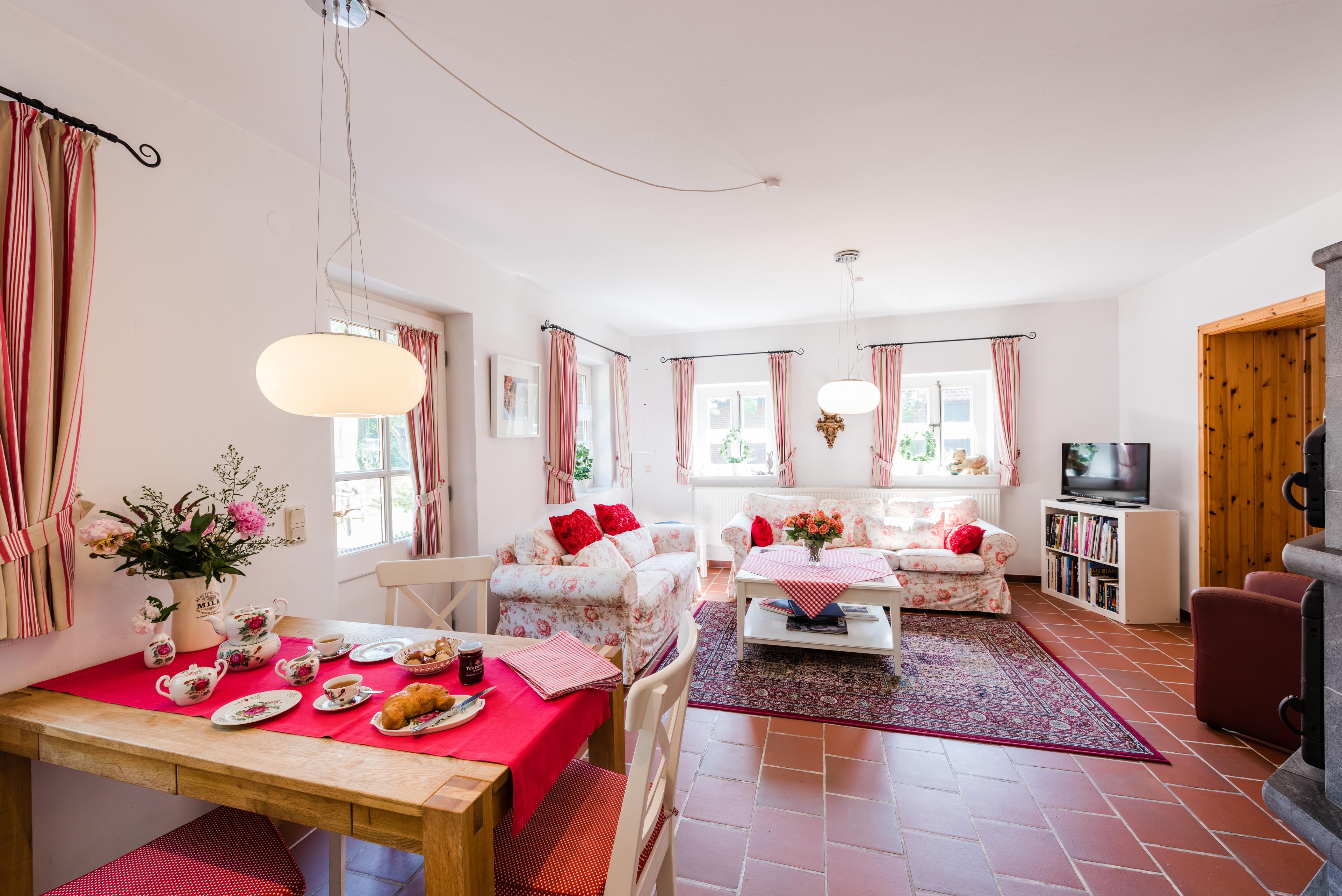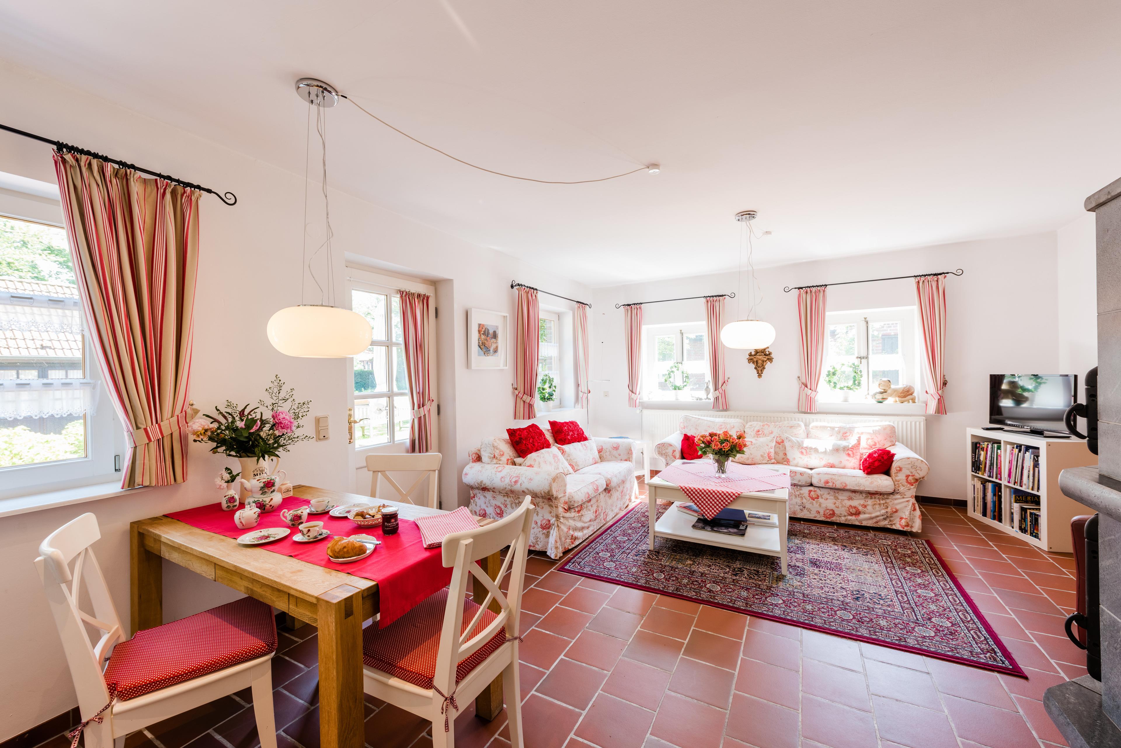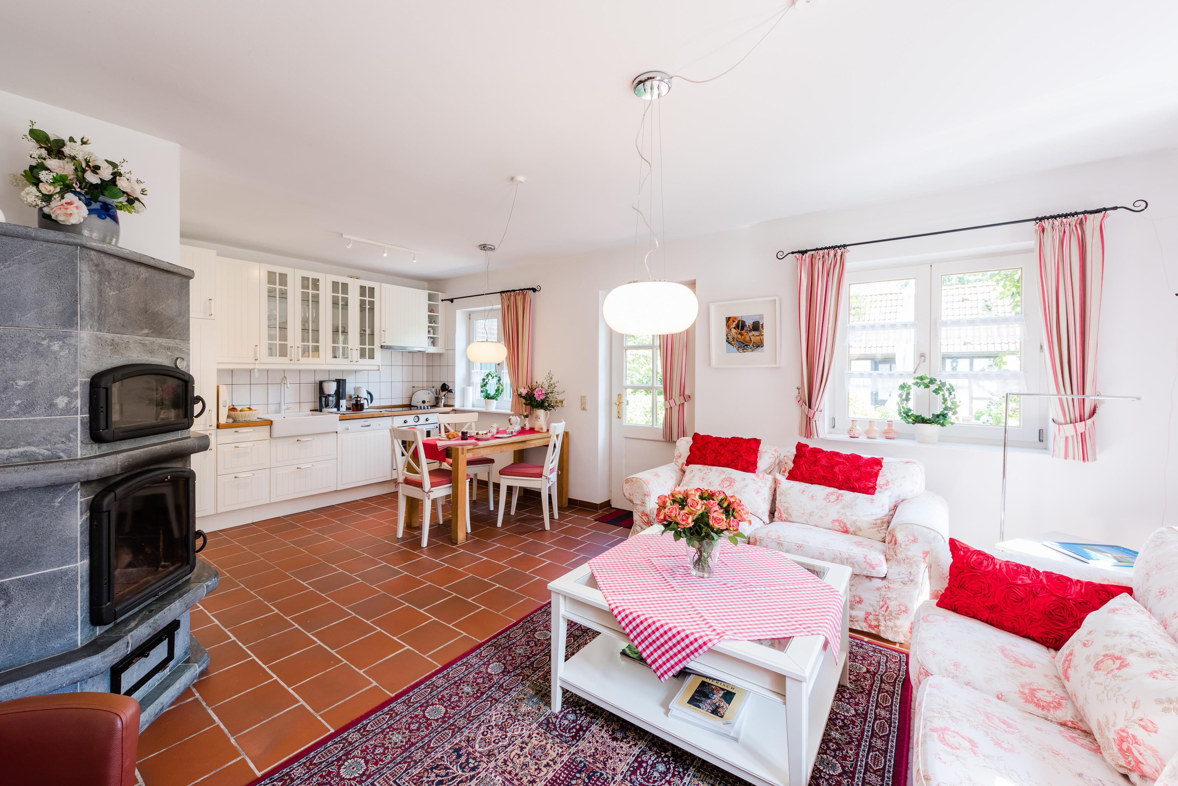 Die "Ostfriesenrose" ist eine 93 qm große Ferienwohnungen im Landhaus Greetsiel am Hafen. Sie ist vergleichbar mit einem Ferienhaus, völlig unabhängig. Es handelt sich um eine modern eingerichtete Wohnung mit einem wunderschönen Wohnzimmer, das sich zur Wohnküche hin öffnet. Der imposante Specksteinofen heizt so im Wohnbereich wunderbar ein. Schlafzimmer sowie /WC befinden sich im Obergeschoss.
