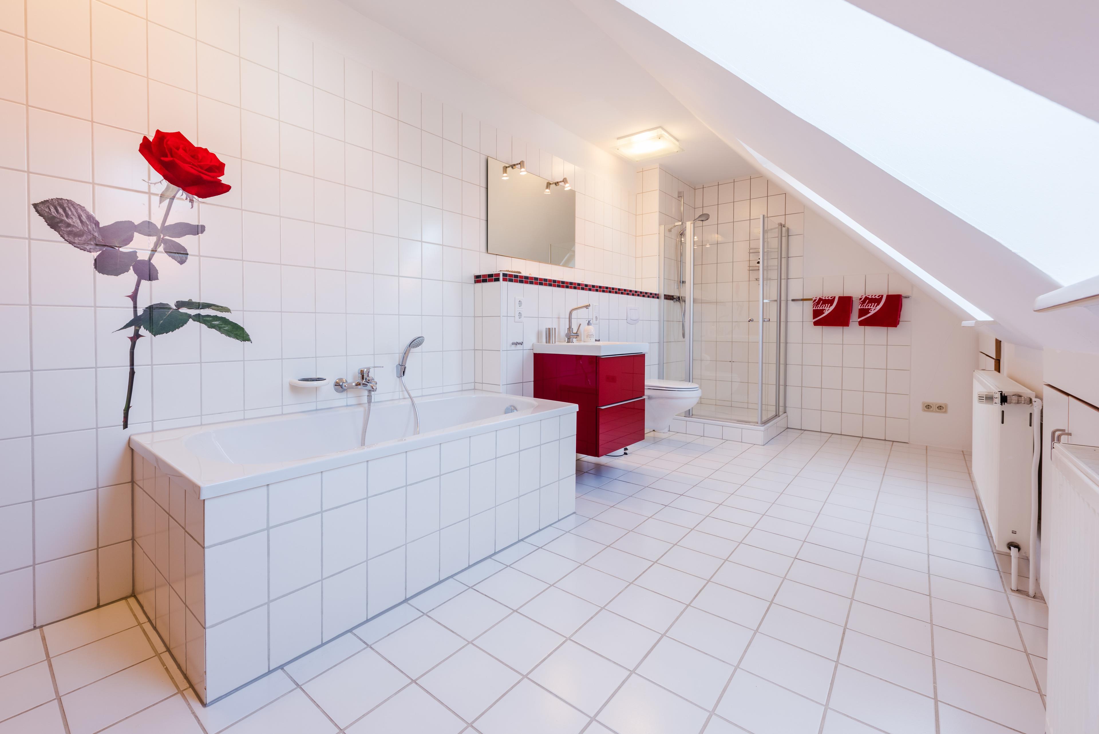 Das Design wird durchgängig bis hin zum Badezimmer mit Badewanne und Dusche von der Rose geprägt. Ein überraschendes Erlebnis.