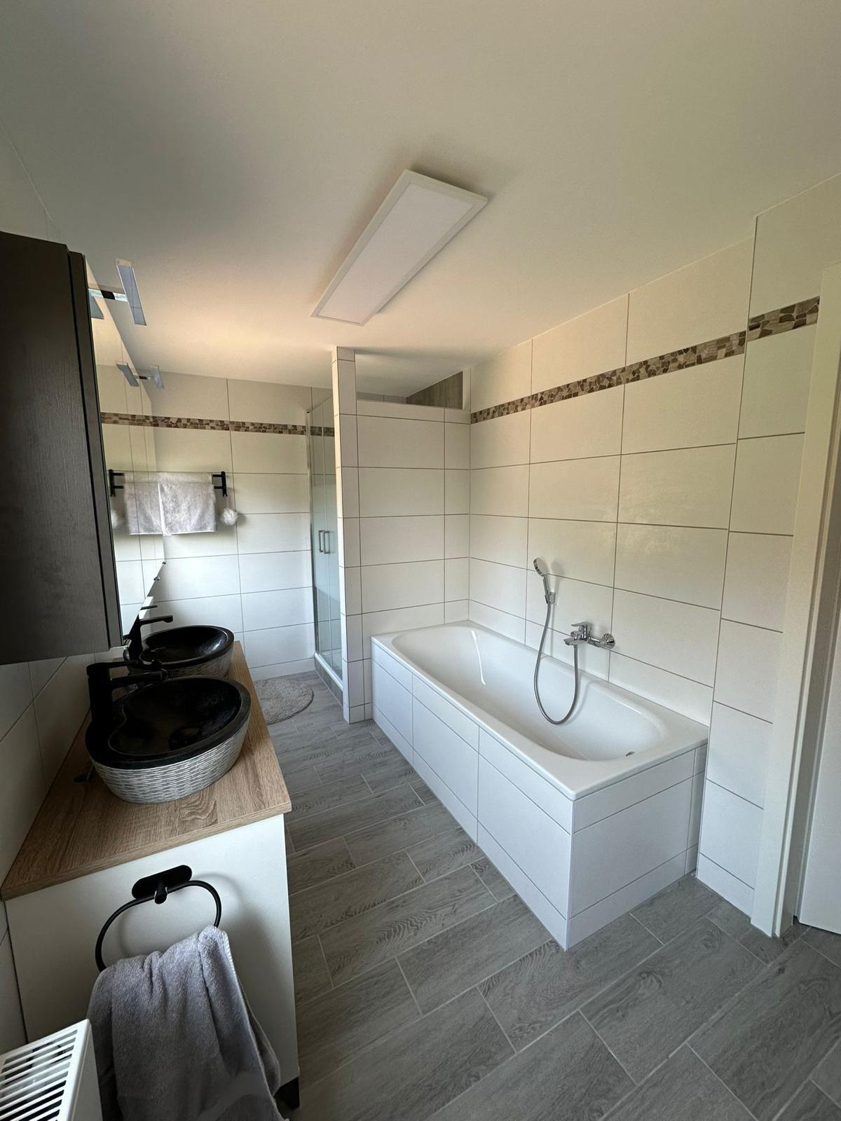 Badezimmer: WC, Badewanne, Dusche, Doppelwaschbecken, beleuchteter Spiegelschrank, 2 Fenster