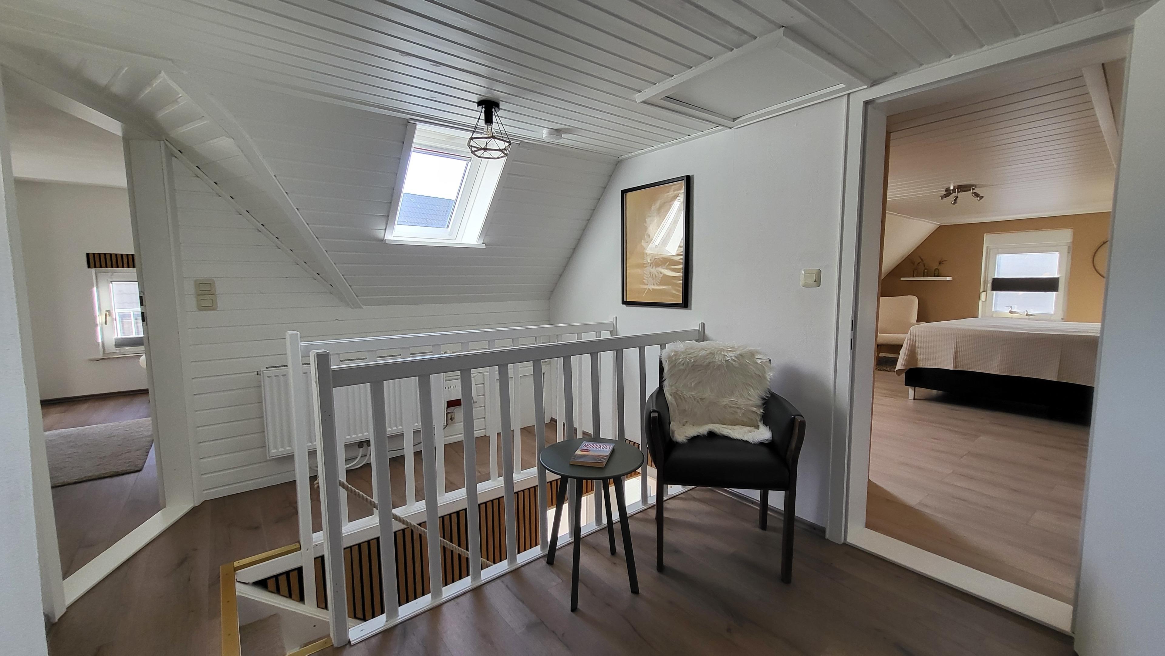 • 2 geräumige Schlafzimmer im Obergeschoss sind durch eine schmale Treppe zu erreichen.