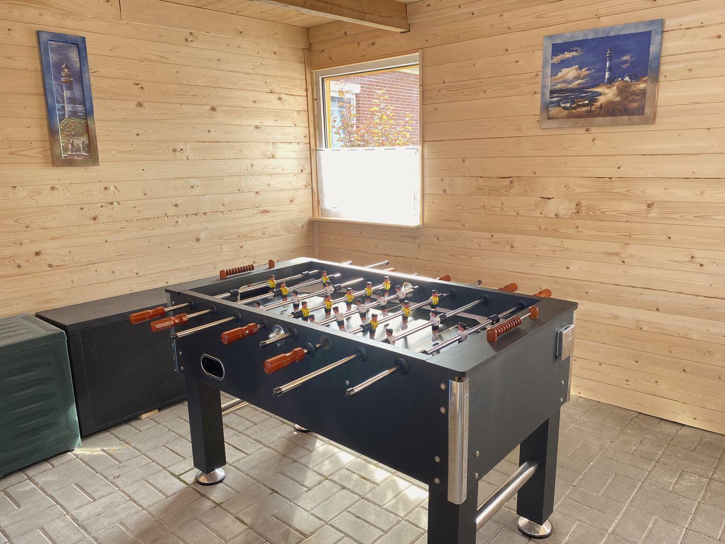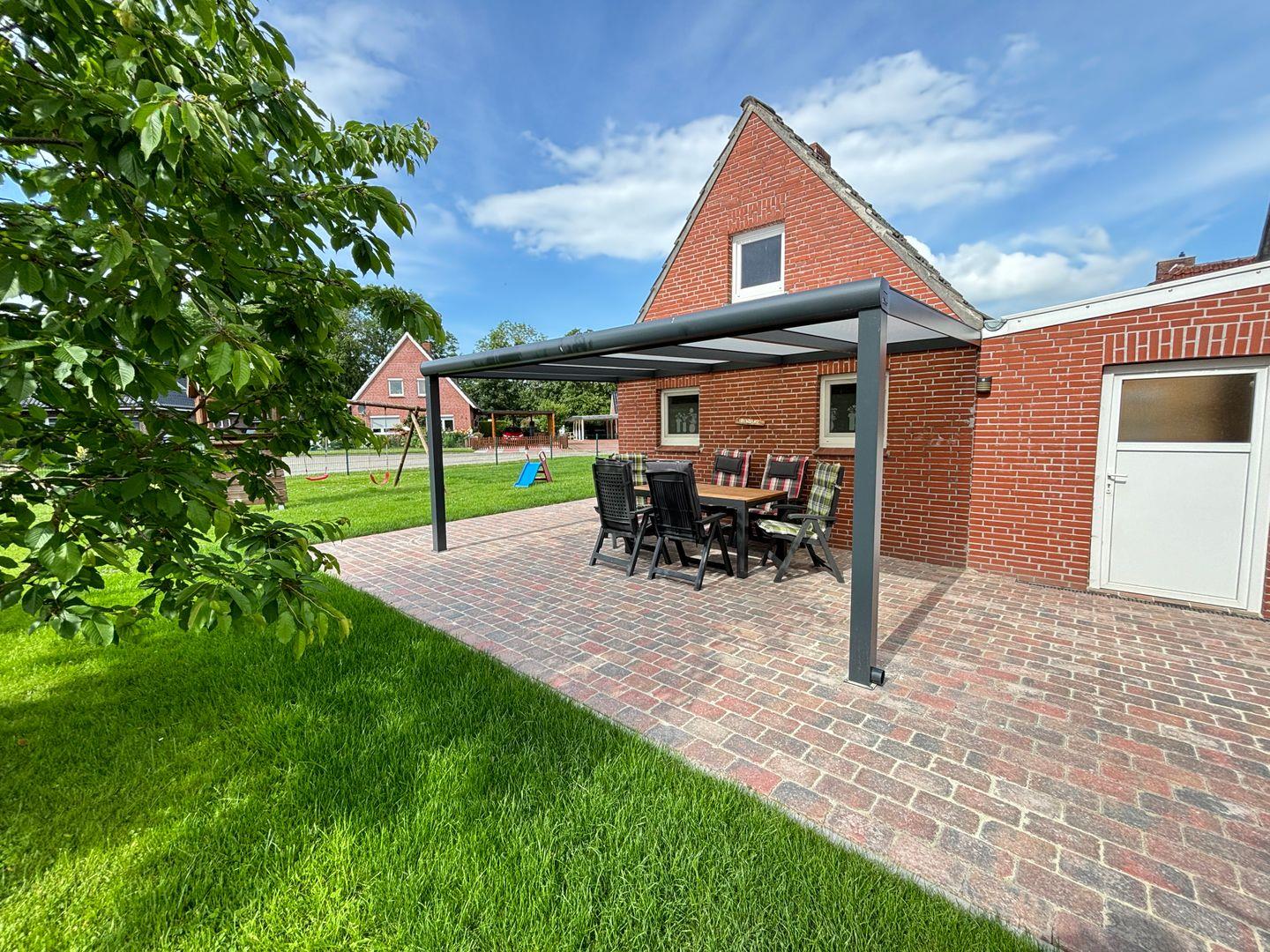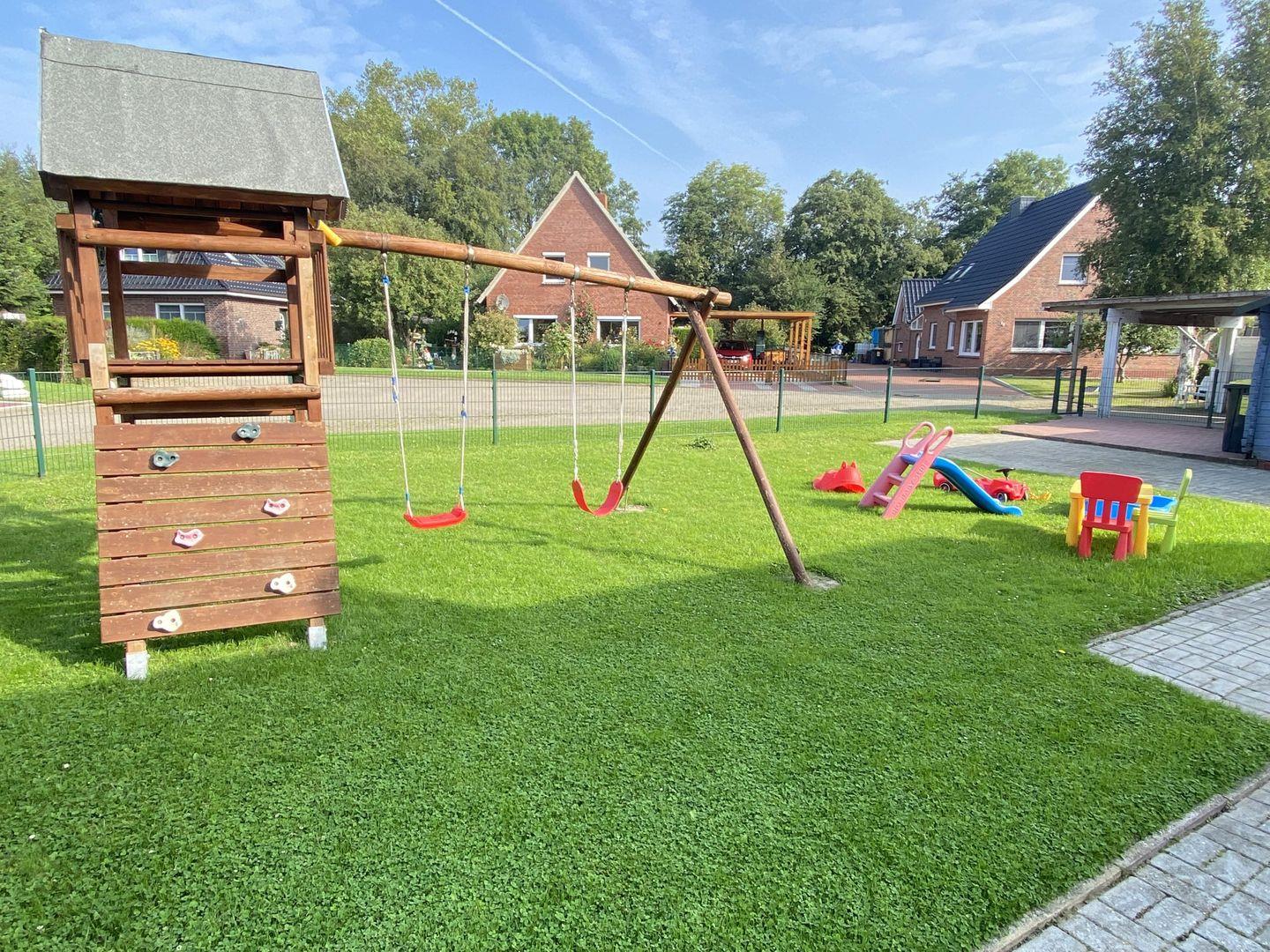 Das Ferienhaus wurde 2021 umfänglich renoviert und steht auf einem großen, vollständig eingezäunten Grundstück (ca. 700m²) mit großer Auffahrt für mindestens drei PKW-Stellplätze. Im Außenbereich befinden sich außerdem ein überdachter Sitzbereich sowie ein Grillplatz für gemütliche Abende im Kreise der Liebsten. Für die kleinen Gäste befindet sich im Garten ein Klettergerüst samt Schaukel und Rutsche. Eine Kindersitzgruppe, ein Buggy/Dreirad mit Dach sowie ein Bobbycar nebst Anhänger und Lenkstange sind ebenfalls vorhanden. Für nicht vollumfänglich mobile Menschen steht ein Rollator zur Verfügung.