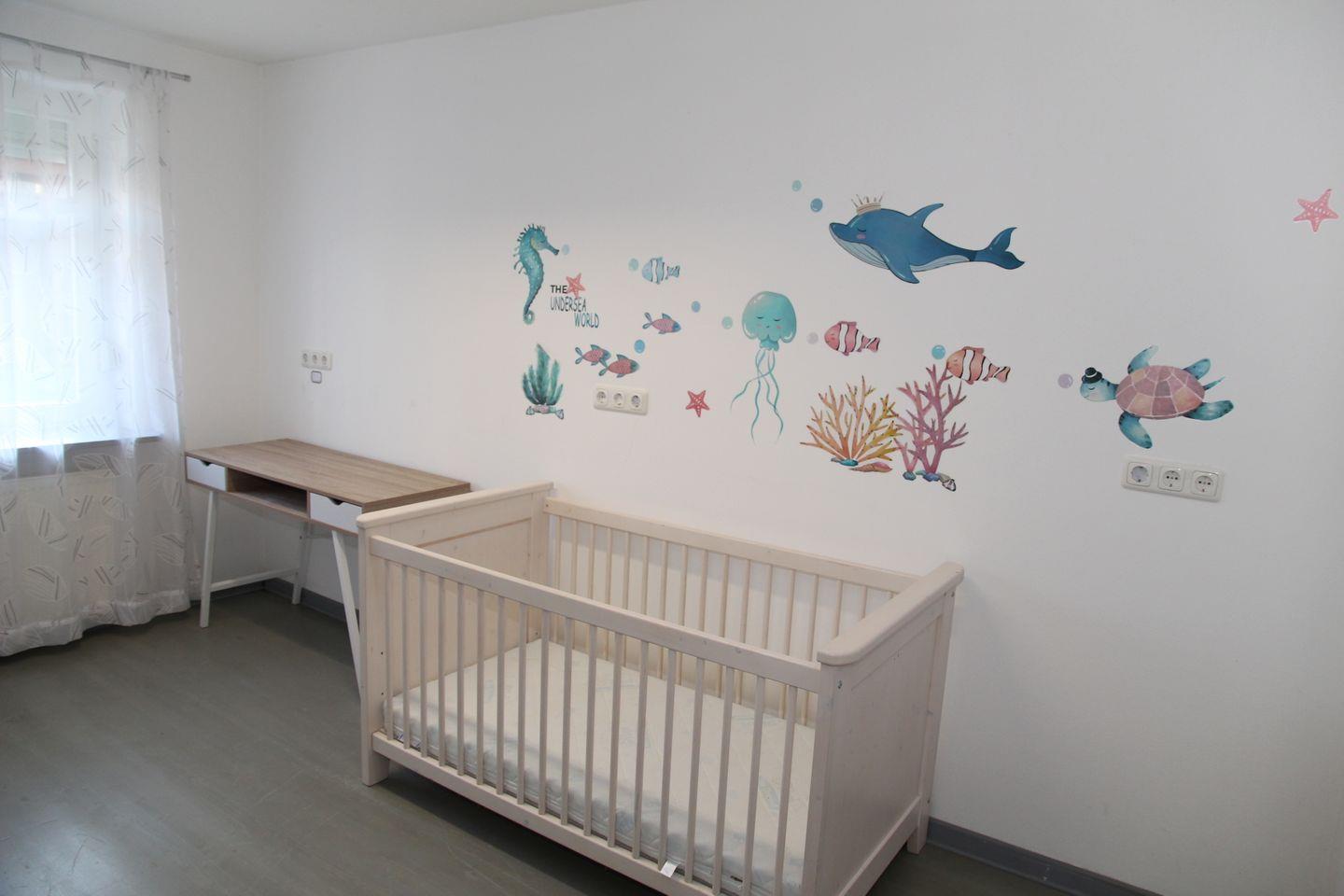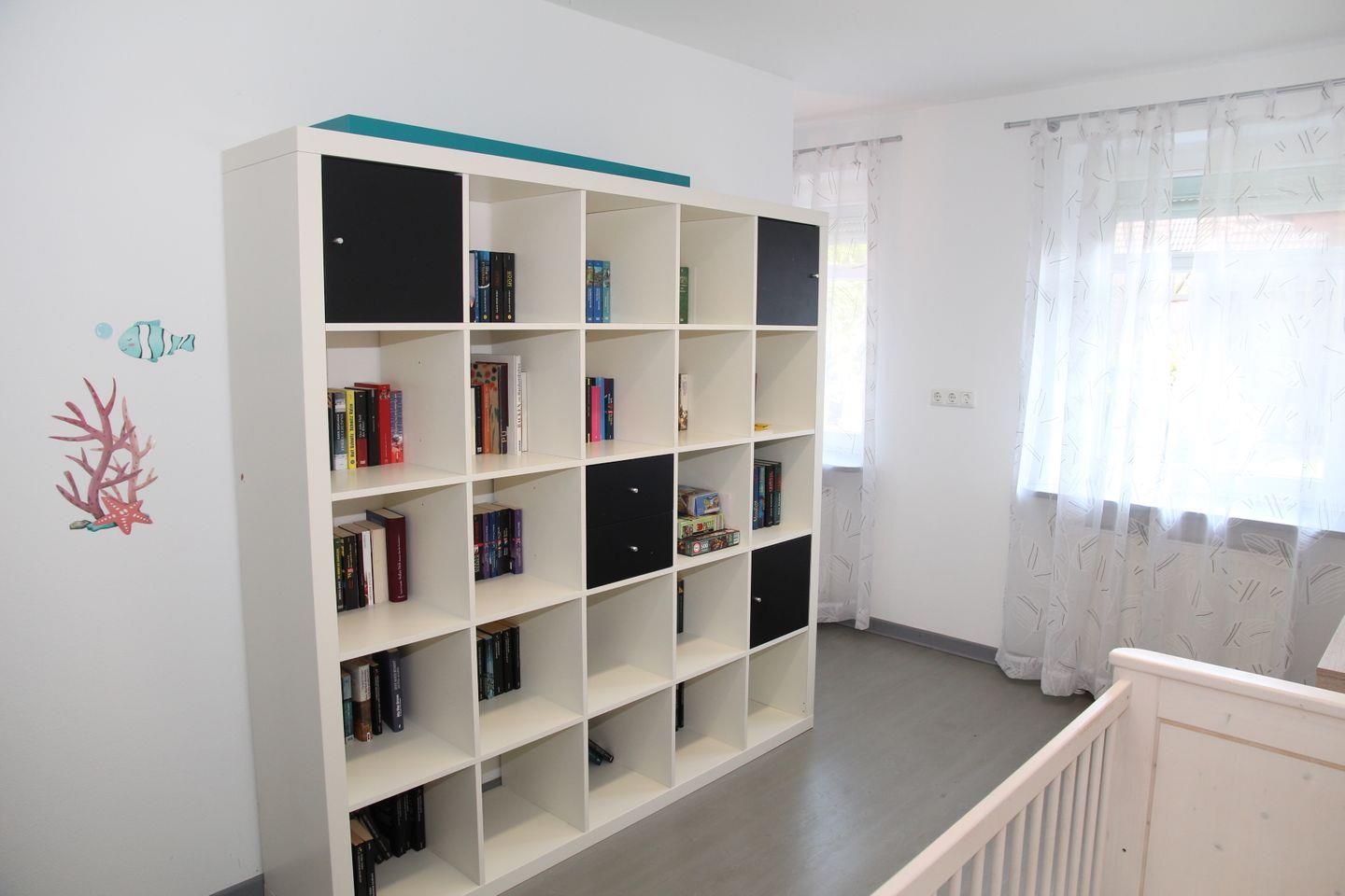Im Elternschlafzimmer steht zusätzlich ein Babybett. Und für Regenwetter haben wir im Schlafzimmer eine kleine Bibliothek mit Krimis, Belletristik, Kochbüchern, etc. eingerichtet.