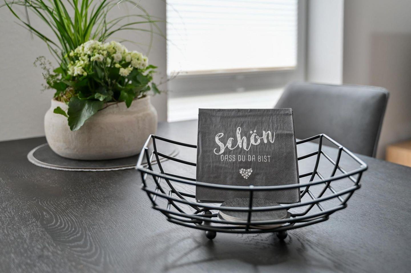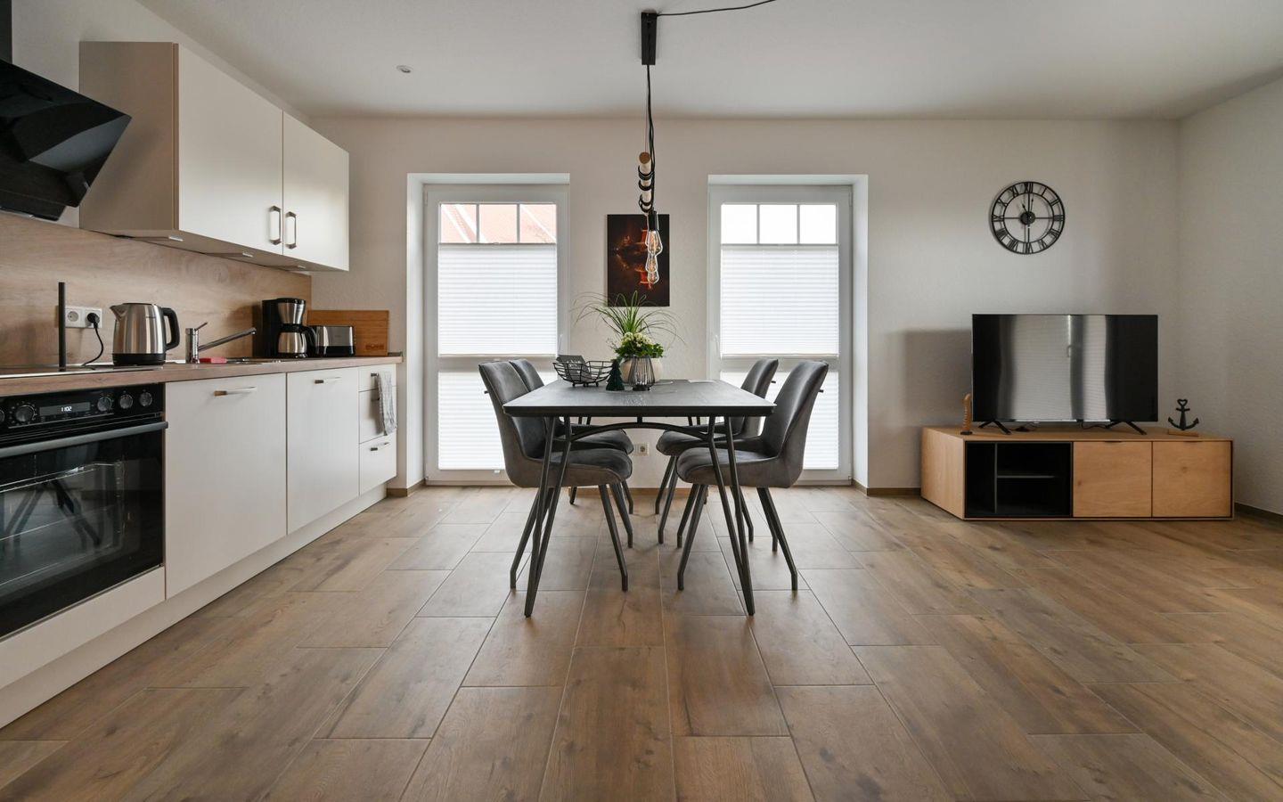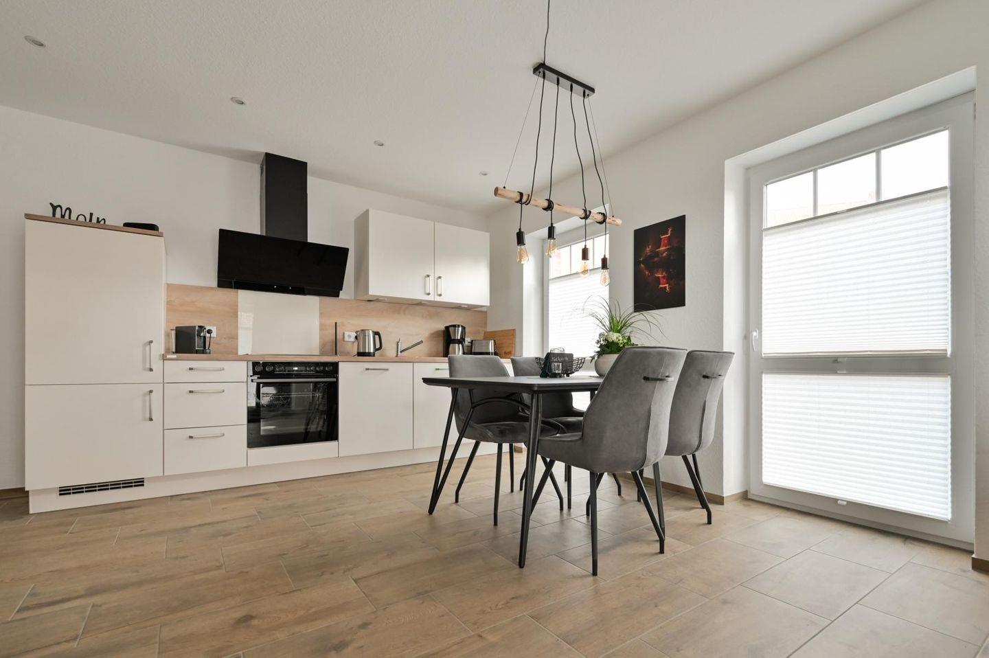 Die Wohnung überzeugt Sie direkt beim Betreten mit ihrer hochwertigen und sehr geschmackvollen Einrichtung. Der großzügige und lichtdurchflutete Wohnbereich bietet ein gemütliches L-Sofa mit zusätzlichem Sessel und einen großen Flachbildfernseher mit eigenem Netflix-Zugang. Weiterhin steht eine Bluetooth-Box zur freien Verfügung bereit. Der Esstisch ist mit vier gemütlichen Stühlen bestückt und die Küche ist mit allen wichtigen Utensilien bestückt, wie bspw. Spülmaschine, Backofen, Kochfeld, Kühlschrank mit Gefrierfach, Kaffeemaschine, Nespresso-Kaffeemaschine, Wasserkocher und Toaster.