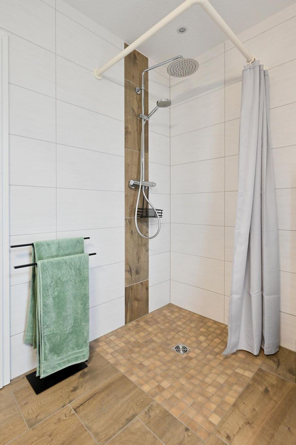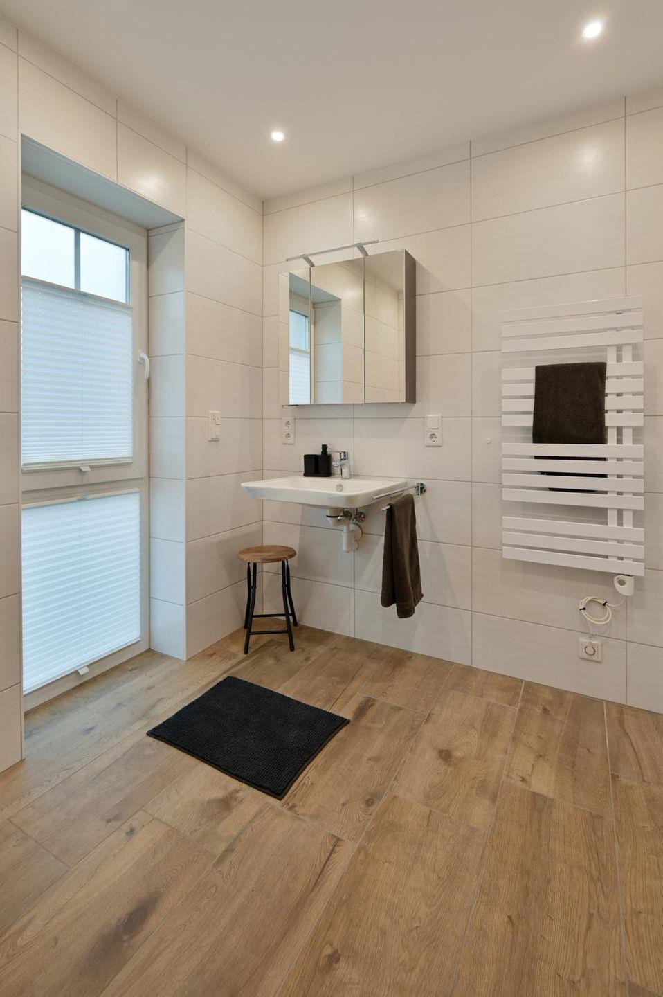 Das große Badezimmer bietet eine offene Dusche (barrierefrei), einen elektrischen Handtuchheizkörper, ein Waschbecken (das mit Rollstuhl unterfahren werden kann) und eine von der Wand etwas weiter abgesetzte Toilette. Auch alle Zimmertüren in der Wohnung sind für Rollstühle passend breiter. Im Abstellraum ist eine Waschmaschine mit Wäscheständer vorhanden.