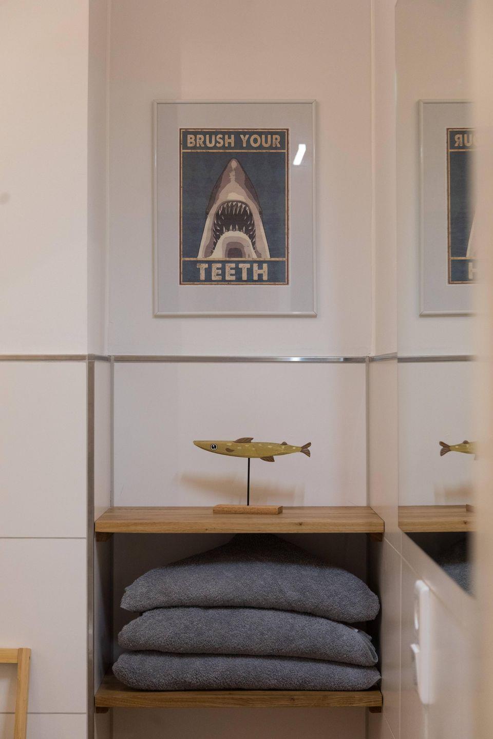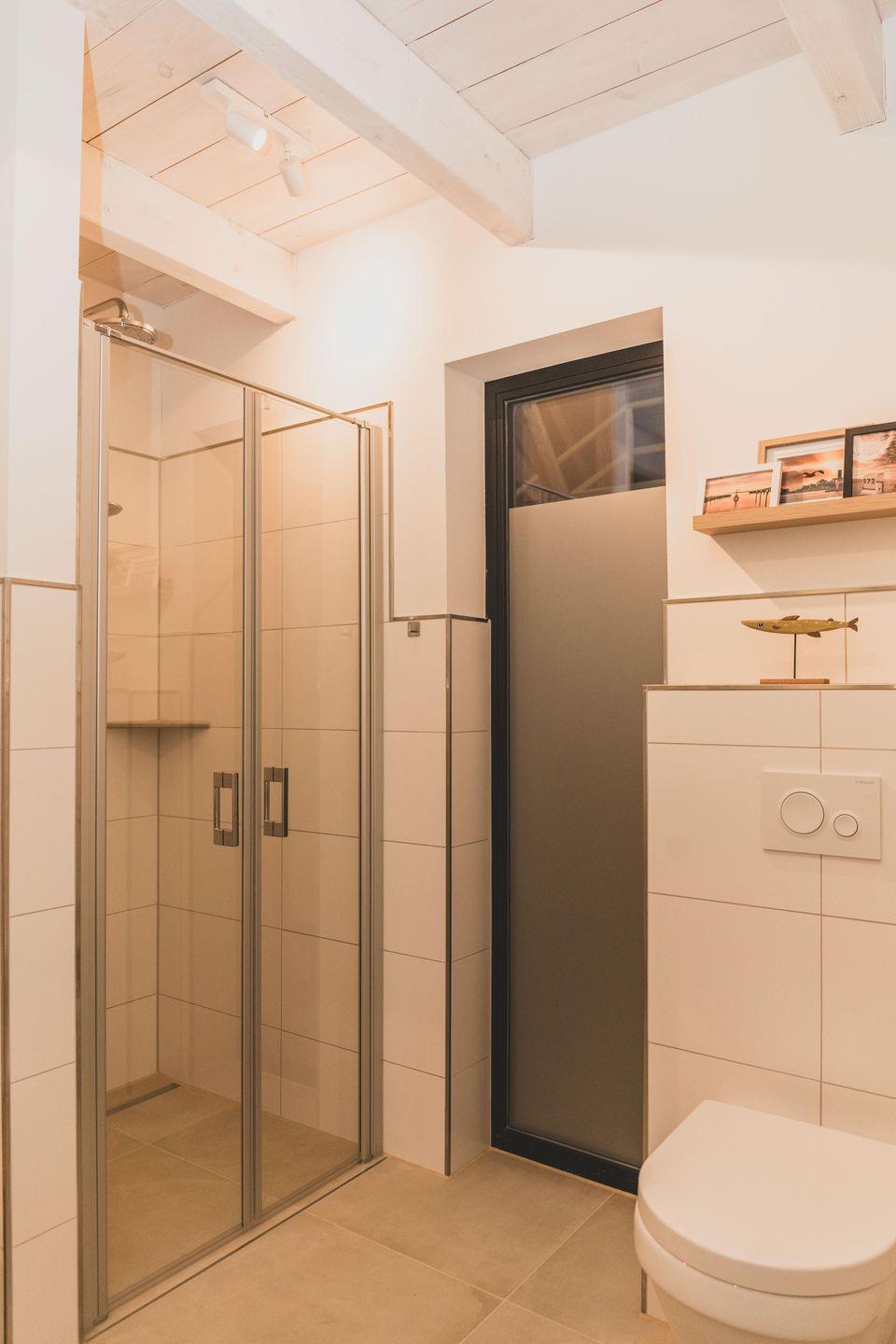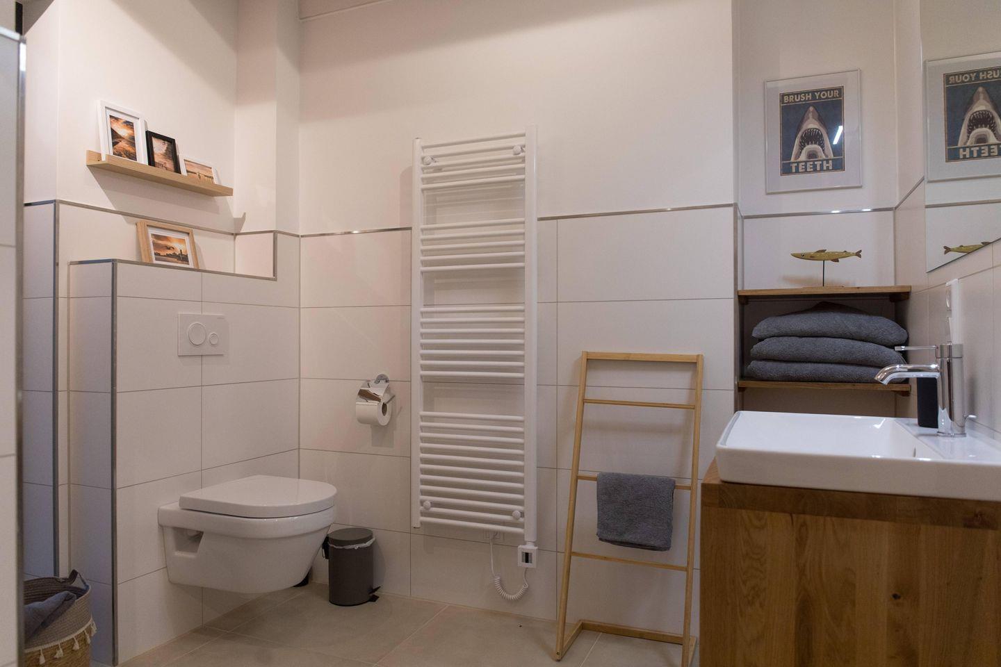 Das Badezimmer ist mit einer bodengleichen Dusche, großen Spiegeln und Fenster ausgestattet und hält zudem einen Haartrockner und ausreichend Hand- sowie Badetücher bereit. Ein zusätzliches Gäste-WC steigert den Komfort. Für Familien stehen ein Babybett, ein Kinderhochstuhl, Kinderspielzeug und Steckdosensicherungen zur Verfügung. Im gemeinschaftlichen Bereich des Gulfhofs können Sie eine Waschmaschine und einen Trockner nutzen.