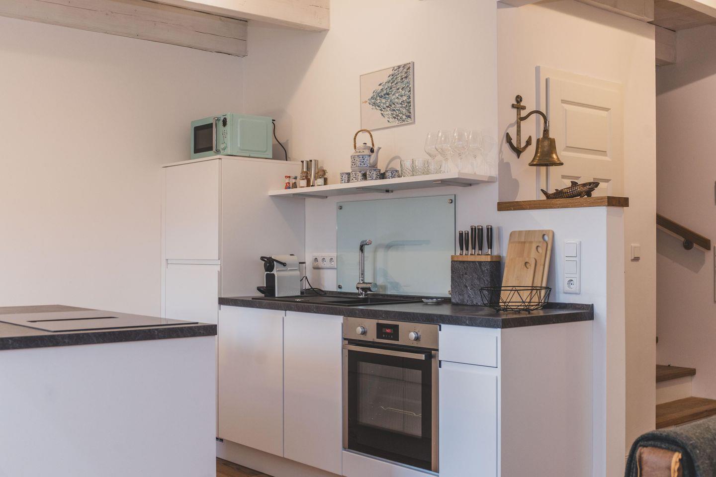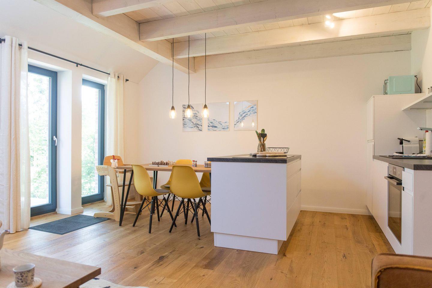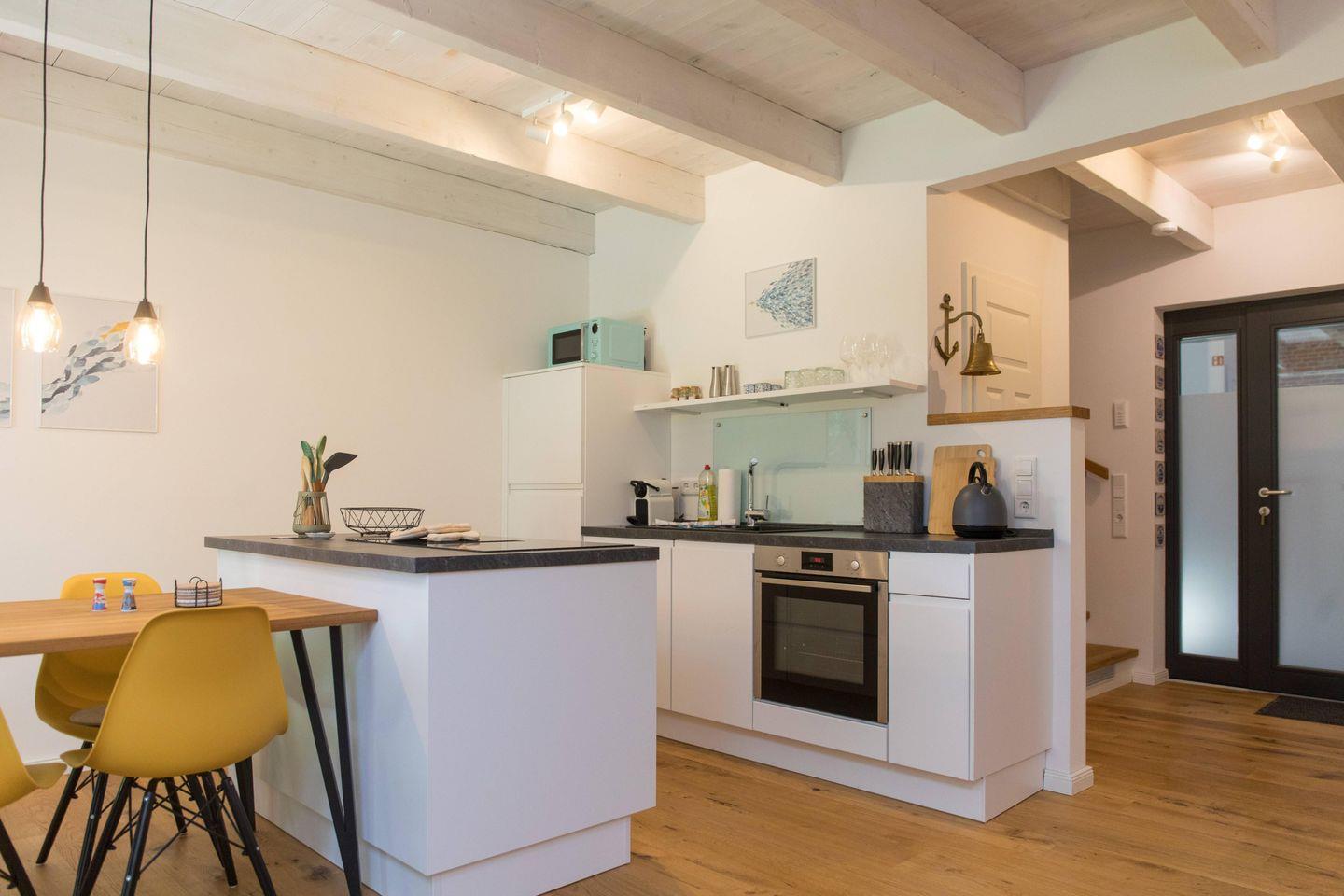 Für einen entspannten Start in den Tag oder einen geselligen Abend steht Ihnen eine offene, modern ausgestattete Küche zur Verfügung, die zum Wohnbereich hin offen gestaltet ist. Neben Herd (Ceran), Backofen, Kühlschrank mit integriertem Gefrierfach, Spülmaschine und Mikrowelle finden Sie auch eine Nespresso-Espressomaschine, Wasserkocher, Toaster sowie umfangreiche Küchenutensilien und Gewürze vor. Geschirr und Besteck sind in ausreichender Menge vorhanden, ebenso wie Geschirrtücher. Am Esstisch genießen Sie gemeinsam Ihre Mahlzeiten mit Blick in den liebevoll angelegten Garten.