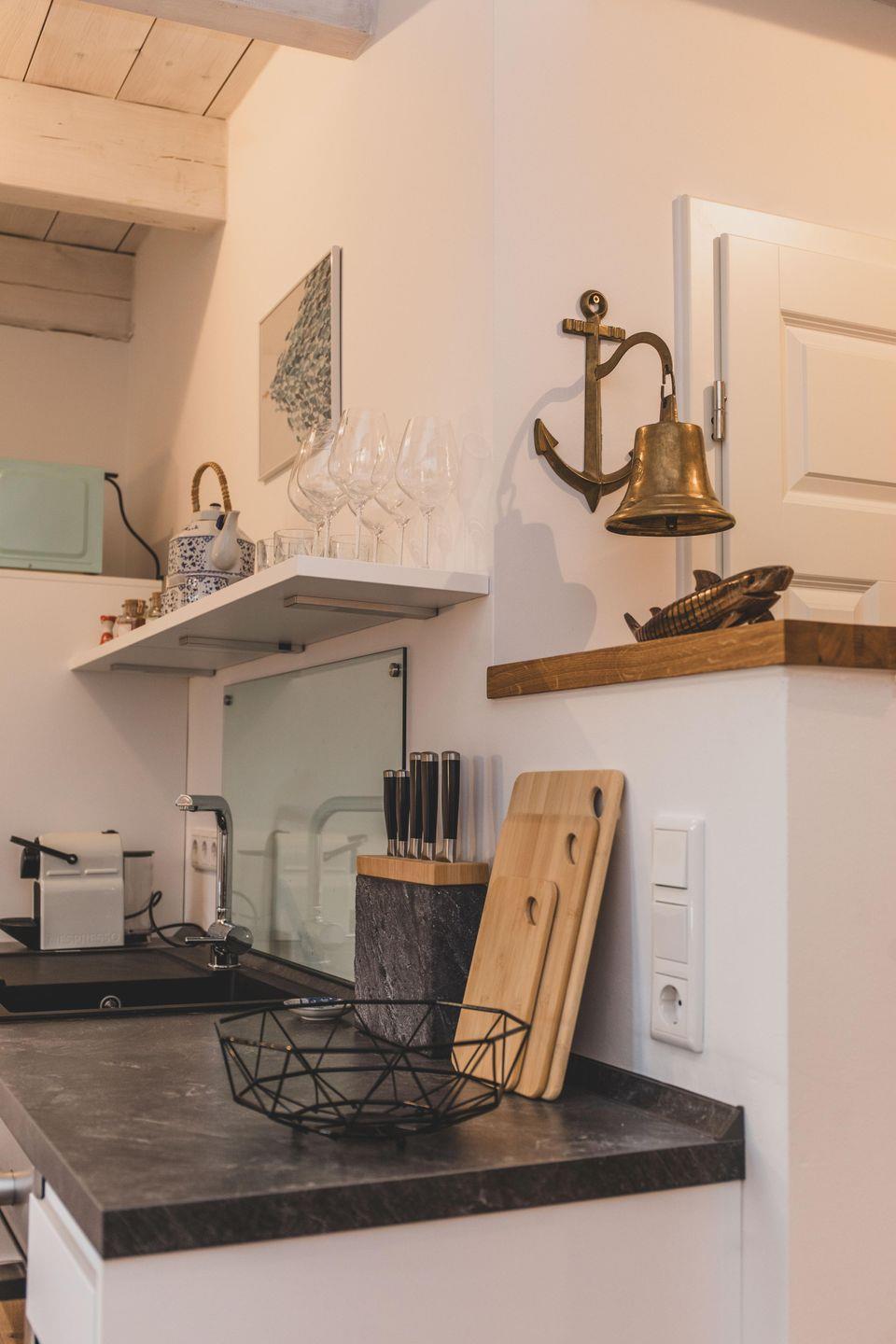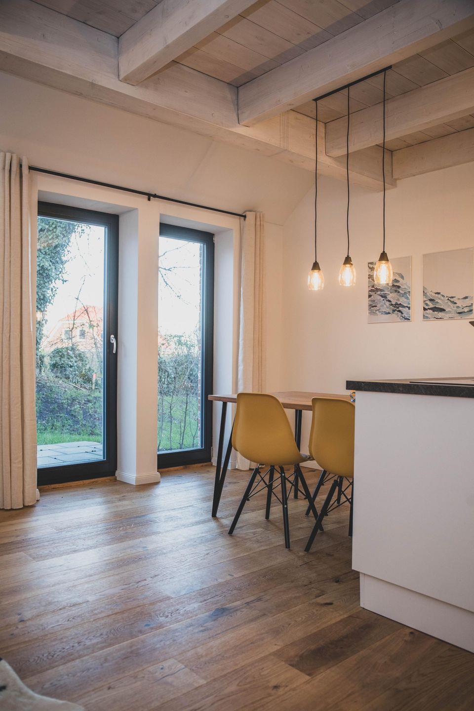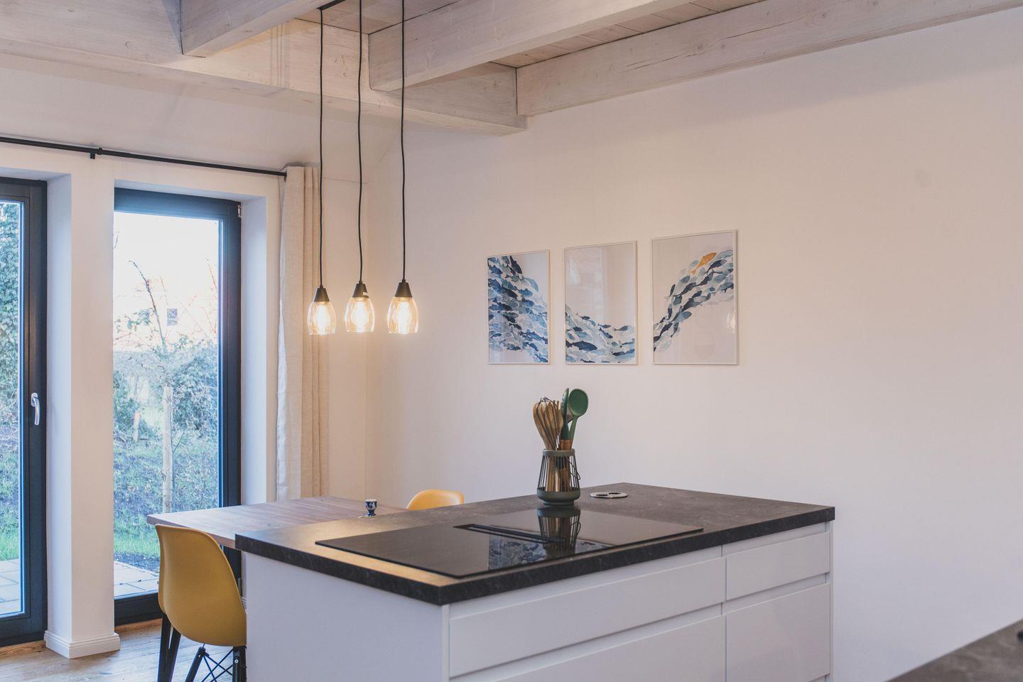 Für einen entspannten Start in den Tag oder einen geselligen Abend steht Ihnen eine offene, modern ausgestattete Küche zur Verfügung, die zum Wohnbereich hin offen gestaltet ist. Neben Herd (Ceran), Backofen, Kühlschrank mit integriertem Gefrierfach, Spülmaschine und Mikrowelle finden Sie auch eine Nespresso-Espressomaschine, Wasserkocher, Toaster sowie umfangreiche Küchenutensilien und Gewürze vor. Geschirr und Besteck sind in ausreichender Menge vorhanden, ebenso wie Geschirrtücher. Am Esstisch genießen Sie gemeinsam Ihre Mahlzeiten mit Blick in den liebevoll angelegten Garten.