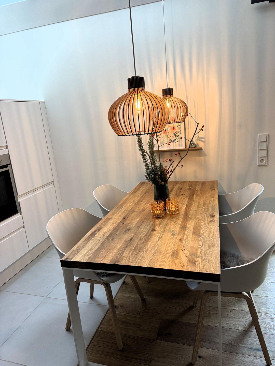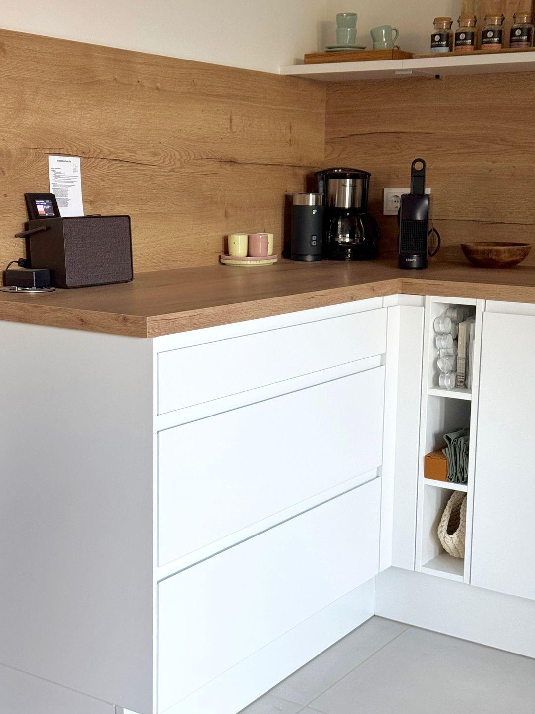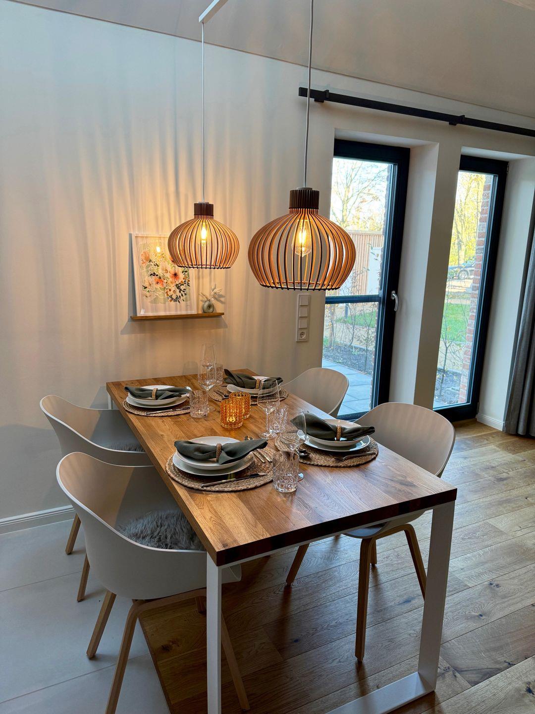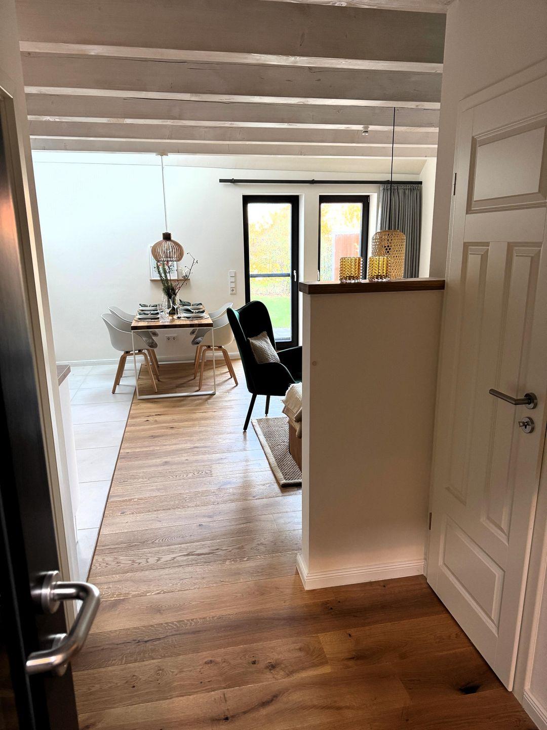Es erwartet Sie auf 2 Etagen eine moderne und hochwertige Ausstattung mit Echtholzparkett, Fußbodenheizung, Smart-TV, Internetradio (Küche und Bad), Geschirrspüler, Nespresso-Maschine, Toaster, Mikrowelle, WLAN und vielem mehr. Im Erdgeschoss befinden sich neben einem großzügig und mit allen Annehmlichkeiten voll ausgestattetem Küchenbereich ein harmonisch eingerichteter Wohn- und Essbereich. Zudem sind ein Gäste-WC und ein Abstellraum vorhanden. Ein Holz-Laufwagen mit einer Auswahl an Kinderbüchern sowie bunte Duplo- und Legobausteinen stehen unseren jüngsten Urlaubsgästen zur Verfügung.
