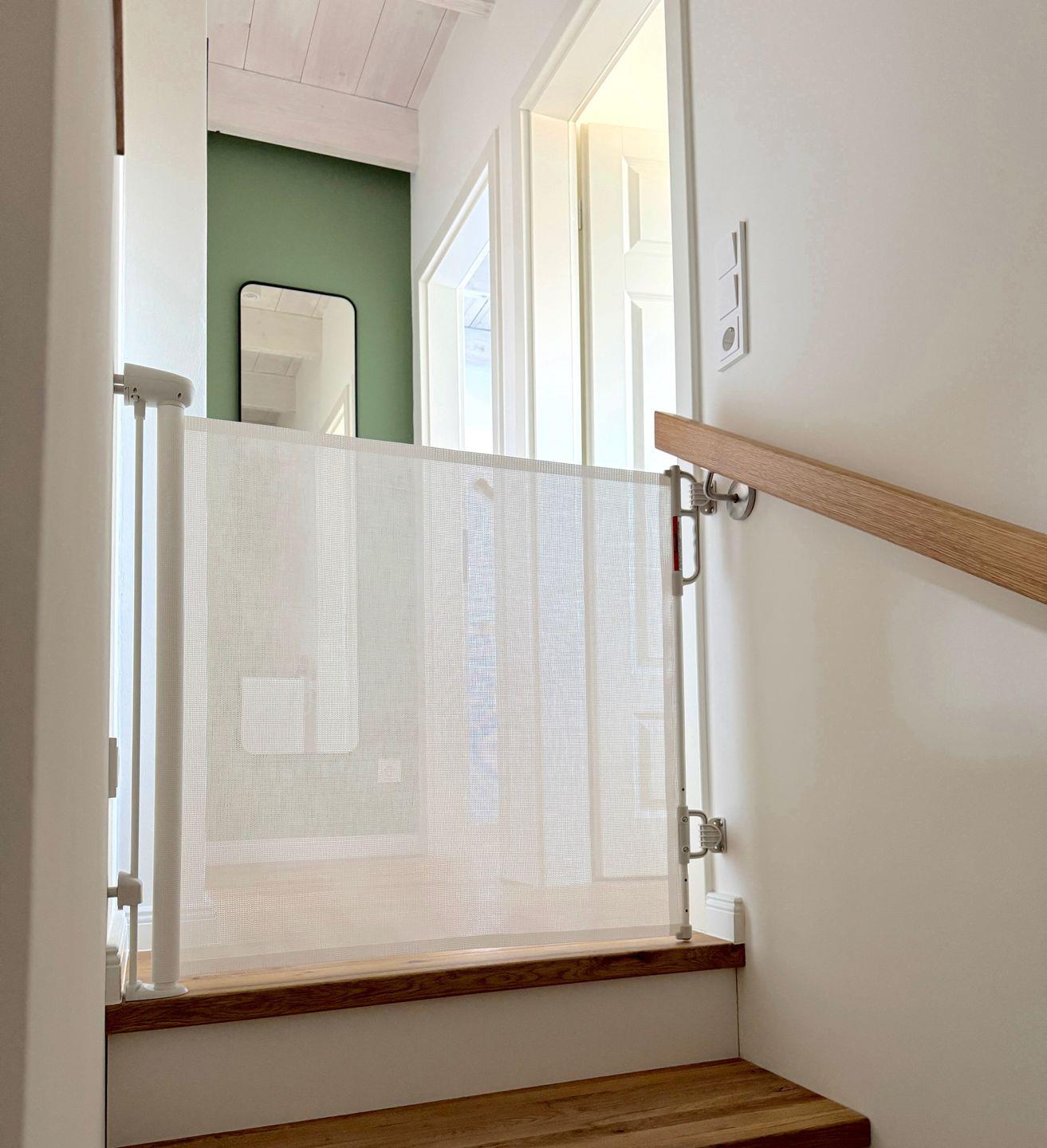Das Obergeschoss verfügt über zwei geschmackvoll eingerichtete Schlafzimmer. Das moderne Bad ist mit einer bodenebenen Dusche, WC und einer Handtuchheizung ausgestattet. Der obere Treppenbereich ist für unseren kleinsten Gäste zusätzlich mit einem Treppenschutzgitter abgesichert. Des Weiteren sind alle zugänglichen Steckdosen in der Ferienwohnung mit einem integrierten Kinderschutz ausgestattet.