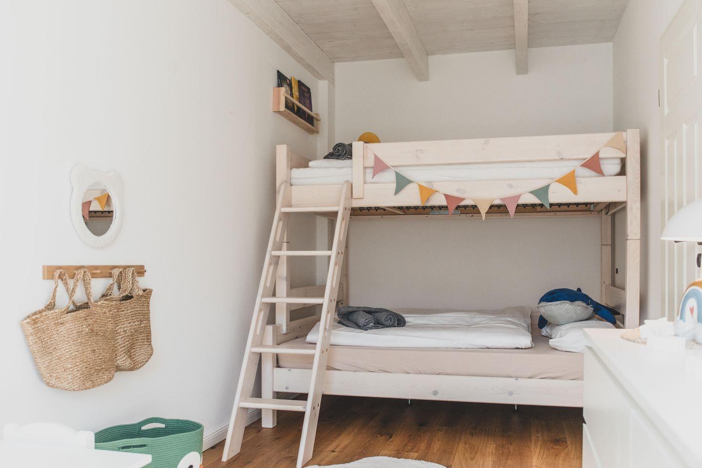 ? Ein Hochbett mit einer 1,40 m breiten Matratze unten und einer 1,20 m breiten Matratze oben, auf dem vier Kinder oder drei Erwachsene bequem Platz finden