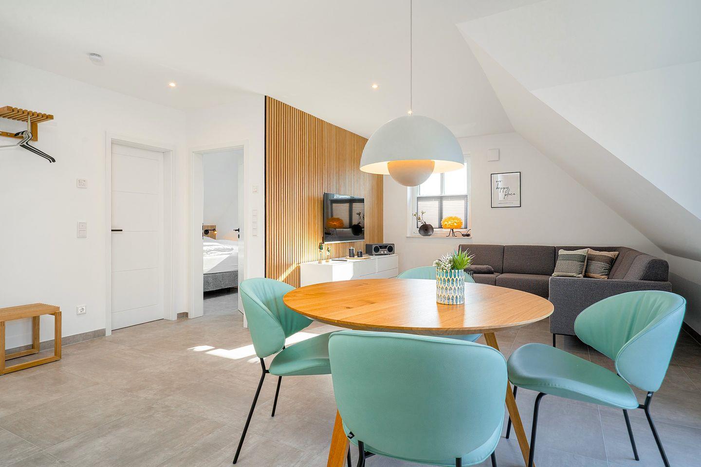 Der offene Wohnbereich ist hell und einladend, ideal zum Verweilen und Entspannen. Die moderne Küche ist voll ausgestattet und lässt keine Wünsche offen – perfekt für die Zubereitung Ihrer Lieblingsgerichte.