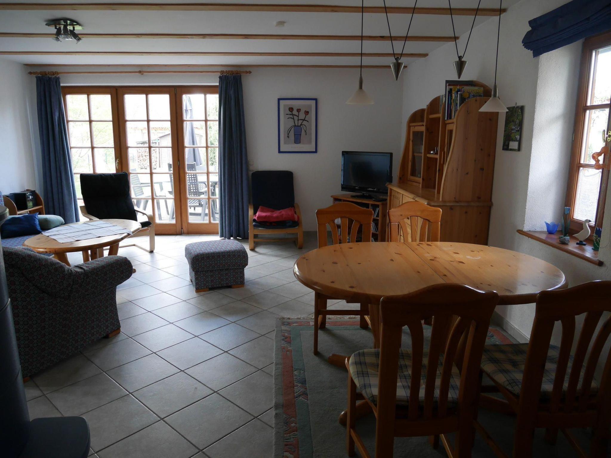 The outdoor area offers a sunny terrace with a view of the Krummin church tower, where a large table and six cosy garden chairs invite you to linger. Firewood is available in the utility room for evenings by the fire. The fenced plot ensures privacy and security for children and dogs. Two parking spaces, secured by a lockable gate, are also available.