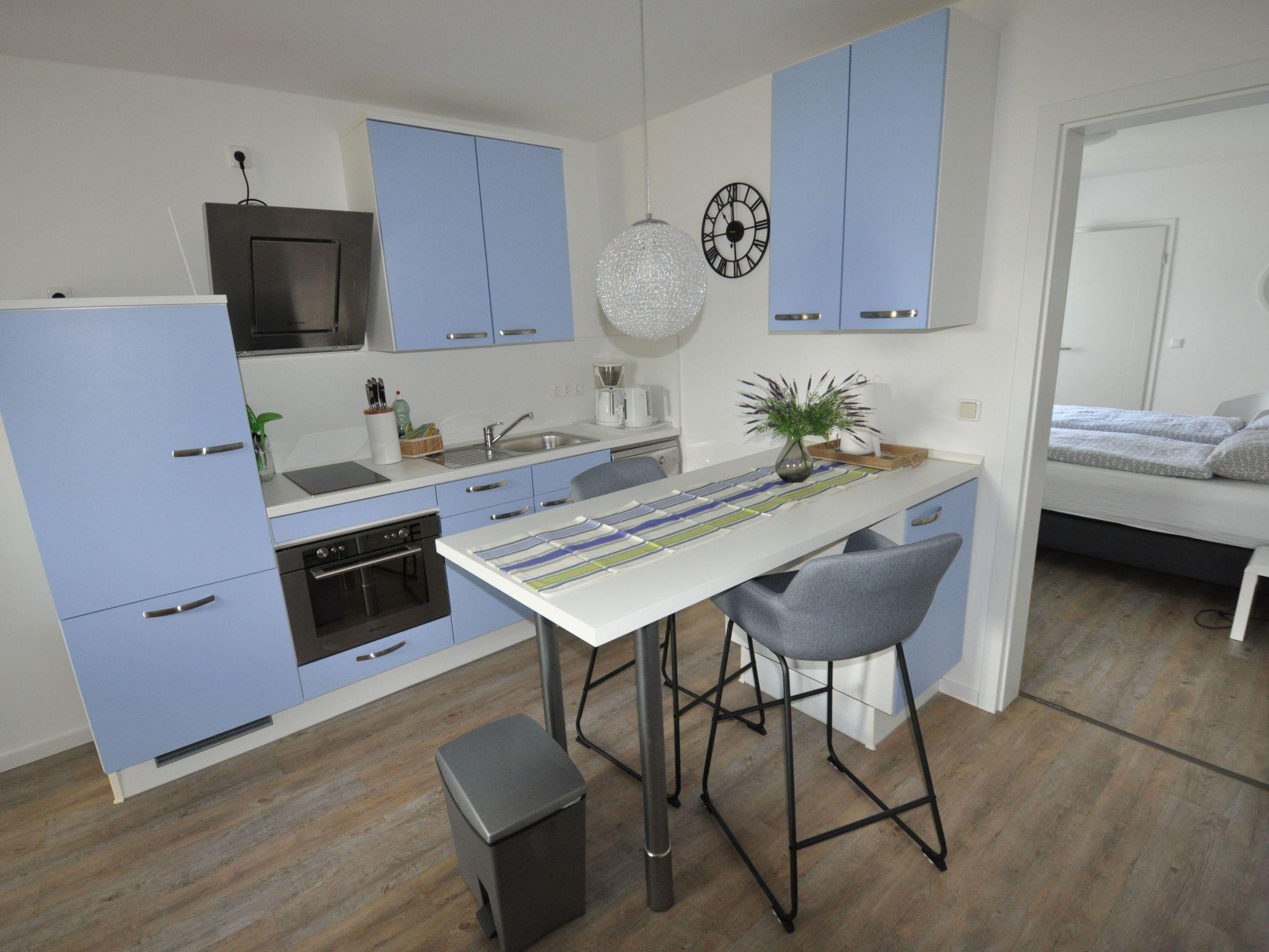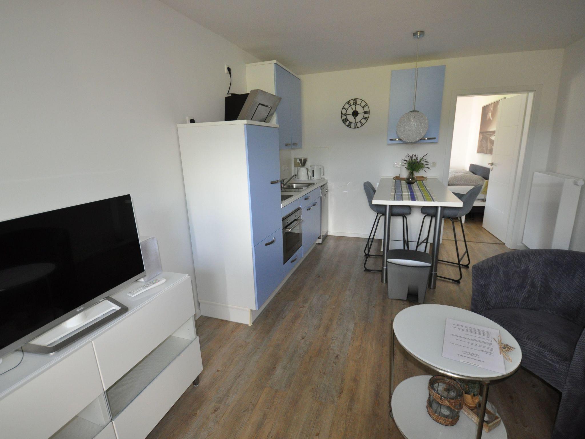 The holiday flat is brand new and has a kitchen-living room, a bedroom and a bathroom on the ground floor with a living space of approx. 40 sqm. You can expect a combined living and kitchen area with a cosy couch corner. The kitchen is newly equipped with dishwasher, coffee machine, fridge, toaster, oven and much more. There is a bedroom with a box-spring bed. The bathroom has a shower and natural light.