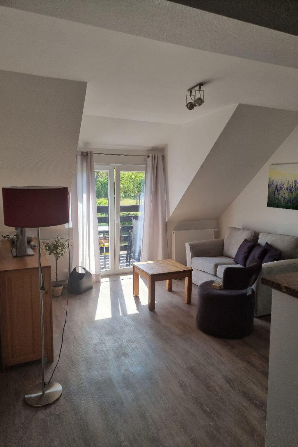 The apartment on the first floor provides around 45m² of living space and is suitable for accommodating two adults and one small child. It has a combined living room and kitchen with a cosy sofa corner. The bedroom has a box spring bed 180cm wide, with one large mattress. There is also a generous bathroom with a shower, WC and daylight.