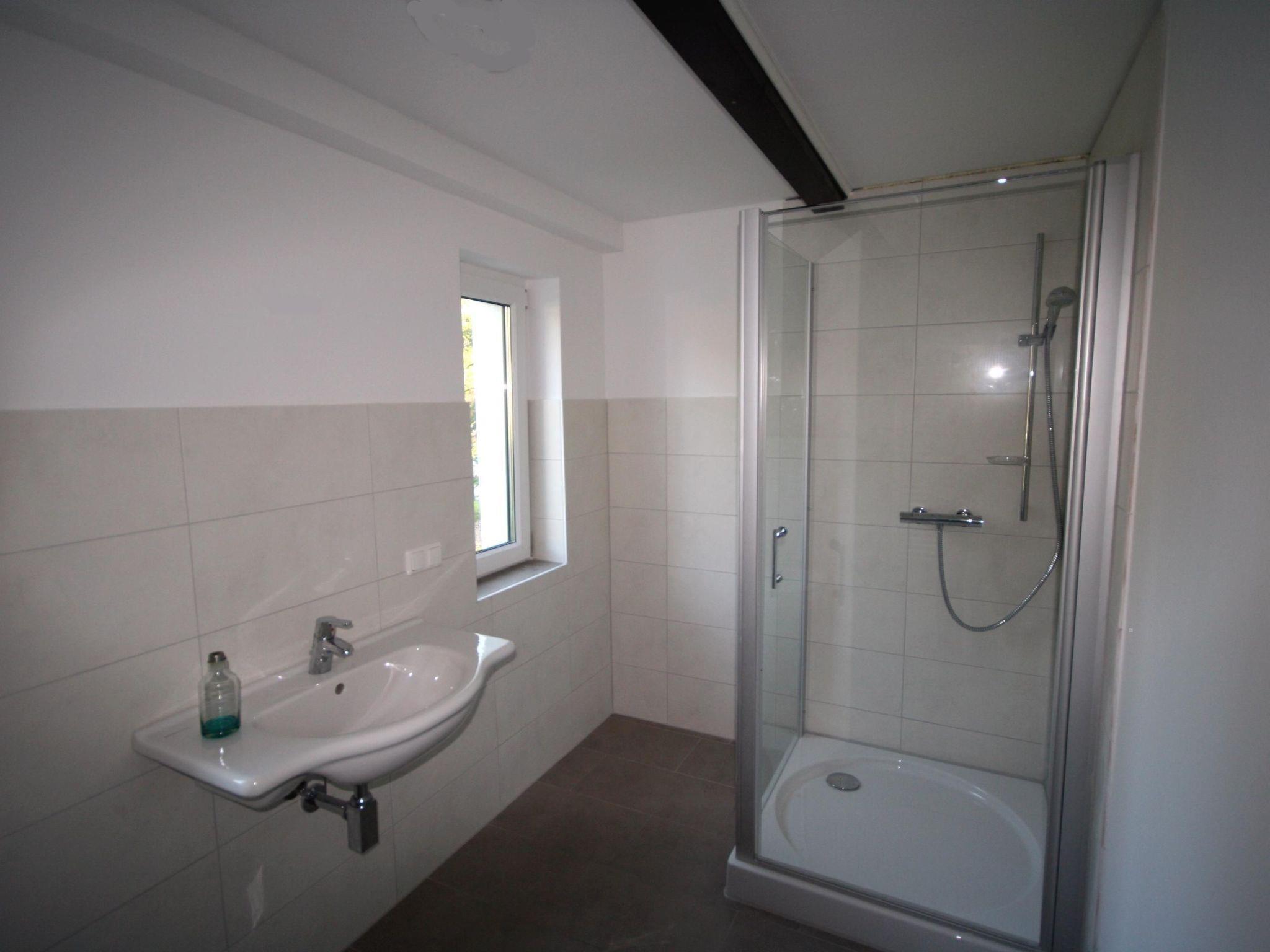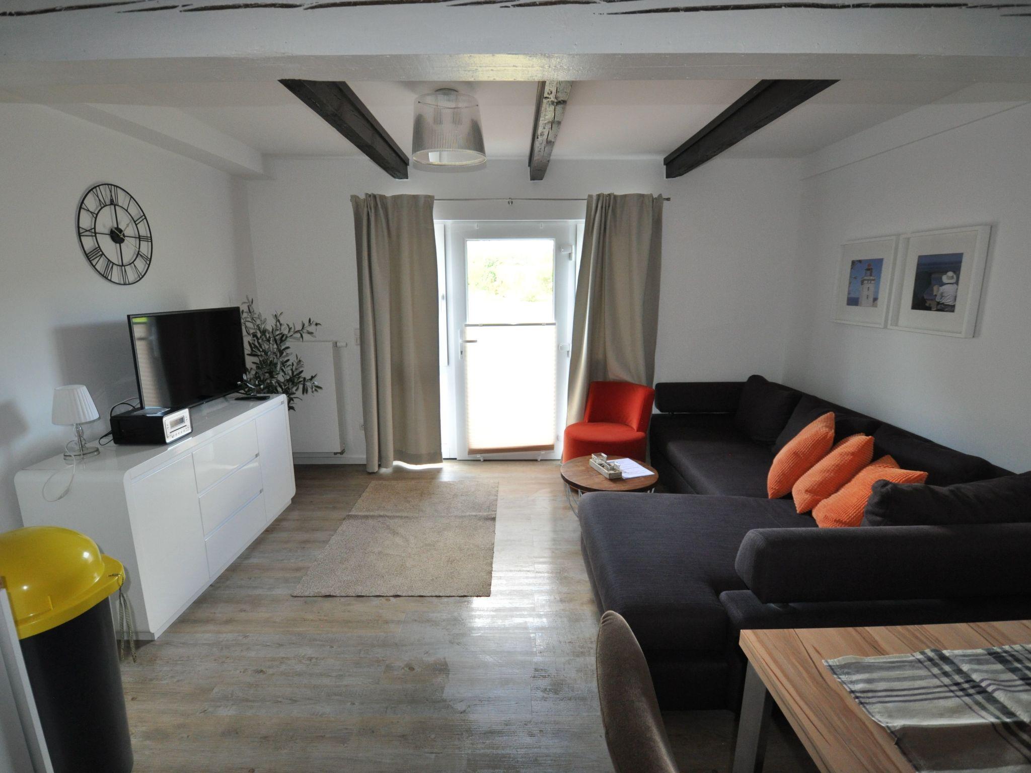 The holiday flat is located on the ground and first floor. It has a living space of approx. 105 m² and is ideal for accommodating 4 adults with 2 children (up to 8 years). On the ground floor you will find a large, combined living and kitchen area with a cosy sofa corner, a large dining table with modern chairs and enough space for six people as well as a fully equipped kitchen. One of the three bedrooms is also located on the ground floor. It has a 160 cm wide box-spring bed with separate mattress and a wardrobe. There are two further bedrooms on the upper floor. The first room has another 160 cm wide box-spring bed with a separate mattress. The other bedroom also has a box-spring bed, but it is 140 cm wide and has a full-length mattress. Two well-designed bathrooms, one on the ground floor and one on the upper floor, are also part of the flat. They are equipped with a shower and WC and have natural light. A baby cot and high chair are available free of charge. Extra beds are possible. All rooms can be heated.