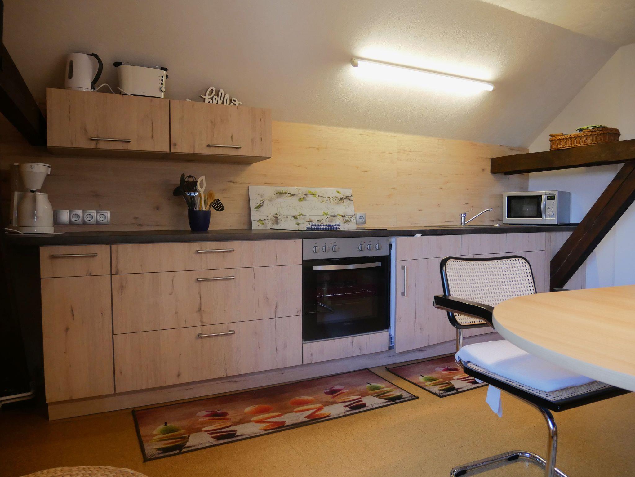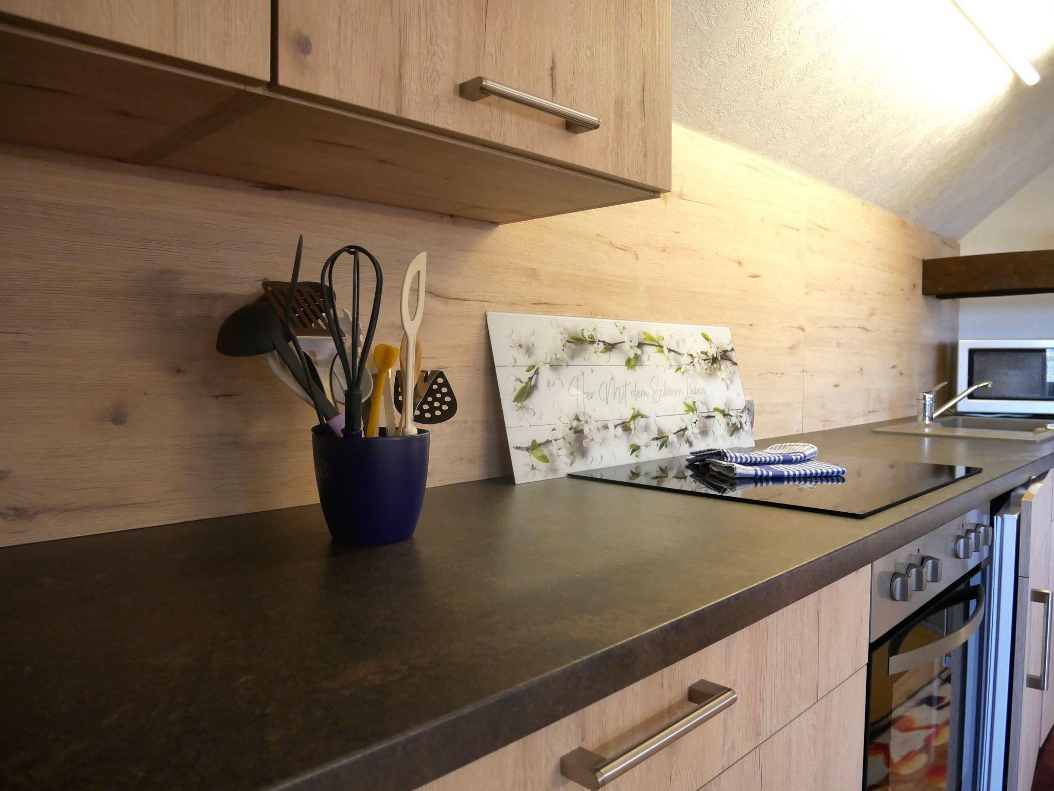 Die Küche ist komplett ausgestattet mit einem Backofen, einem Cerankochfeld, einem Kühlschrank mit Gefrierfach, einer Mikrowelle, einer Kaffeemaschine, einem Wasserkocher und einem Toaster. So steht Ihnen alles zur Verfügung, um Ihre Lieblingsgerichte zuzubereiten und gemütlich zu genießen.