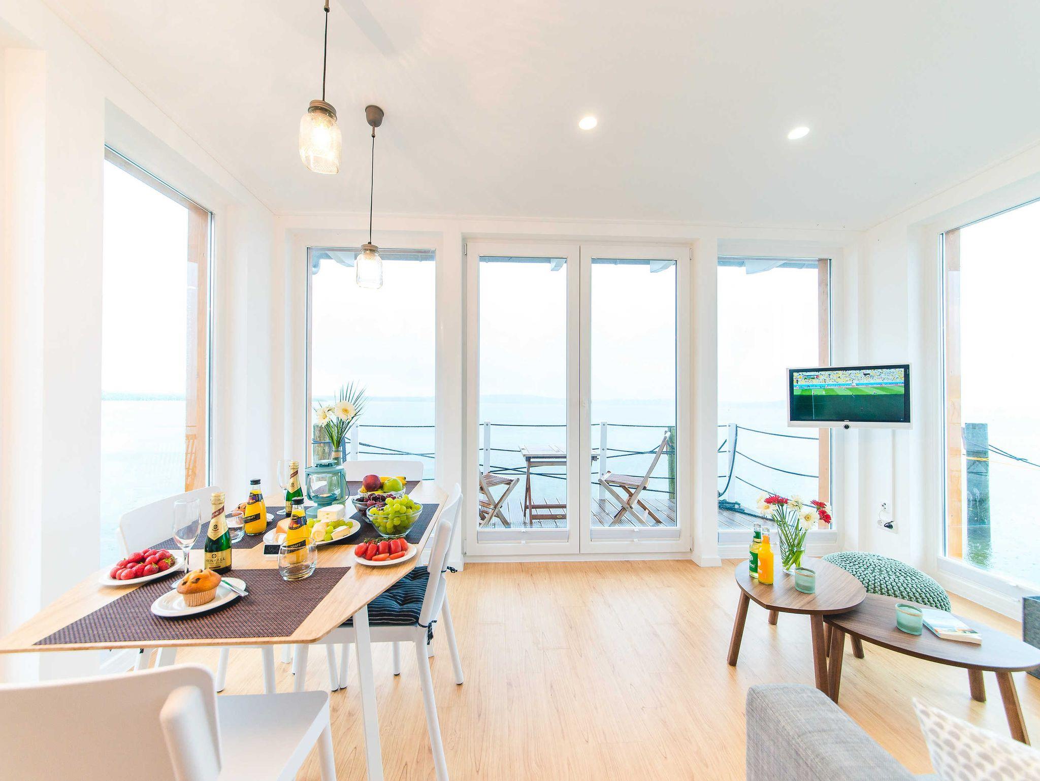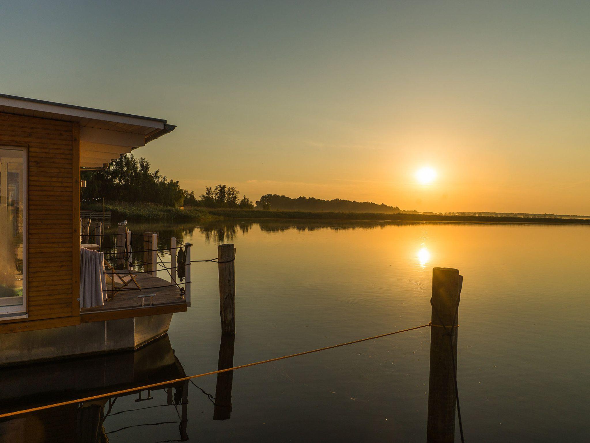 Viele Details und eine individuelle Einrichtung sorgen für ein Wohlfühlen im Hausboot auf den ersten Blick. Morgens lächelt die Sonne durch die bodentiefen Fenster ins Wohnzimmer und lässt den Tag mit viel Sonnenschein beginnen. Abends lädt die Terrasse mit einem Panorama-Blick über die Krumminer Wiek zu einem Glas Wein und einen Blick in den Sternenhimmel ein. Im Herbst und Winter sorgen viele Kerzen und eine Fußbodenheizung für eine behagliche und kuschelige Atmosphäre im Wohnzimmer. Für die Erkundung der Umgebung stehen Fahrräder und Kanus am Hafen bereit. Mit einem optionalen Segeltörn vom Naturhafen aus entdecken Sie mit einem Skipper die maritime Seite Usedoms. Im Ort Krummin erwarten Sie idyllische Gartencafés.