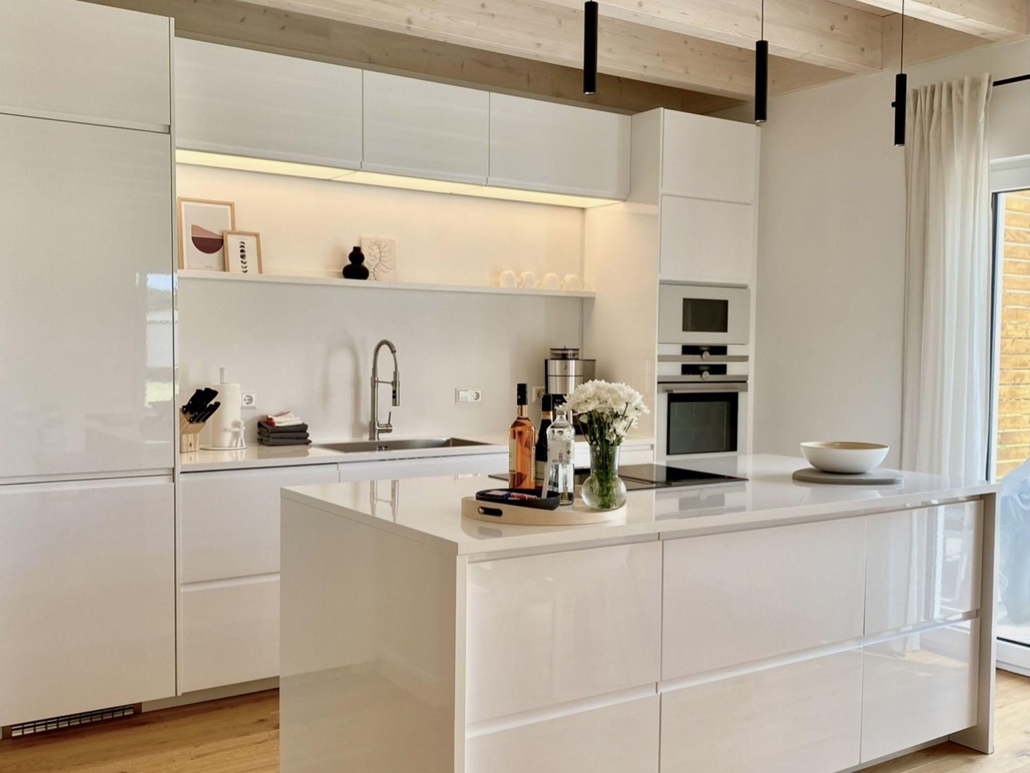Auf ca. 140m² bietet das große, helle Ferienhaus einen großzügigen Wohn-Essbereich mit gemütlicher Couch und Smart-TV, Kamin, Esstisch und einer offenen Küche mit Backofen, Induktionskochfeld, Kühlschrank mit Gefrierfach, Mikrowelle, Geschirrspüler, Kaffeemaschine, Wasserkocher und Toaster. Drei großzügige Schlafzimmer mit King-Size Doppelbetten. Zwei moderne Badezimmer mit bodengleichen Duschen, Waschbecken, Sauna, WC und Haartrockner. Zusätzlich ein separates WC.
