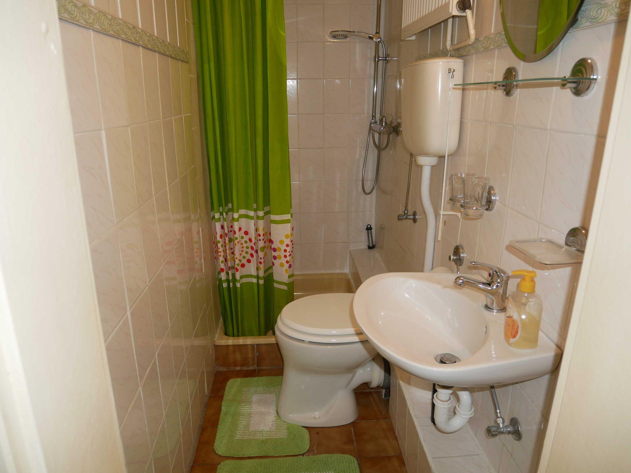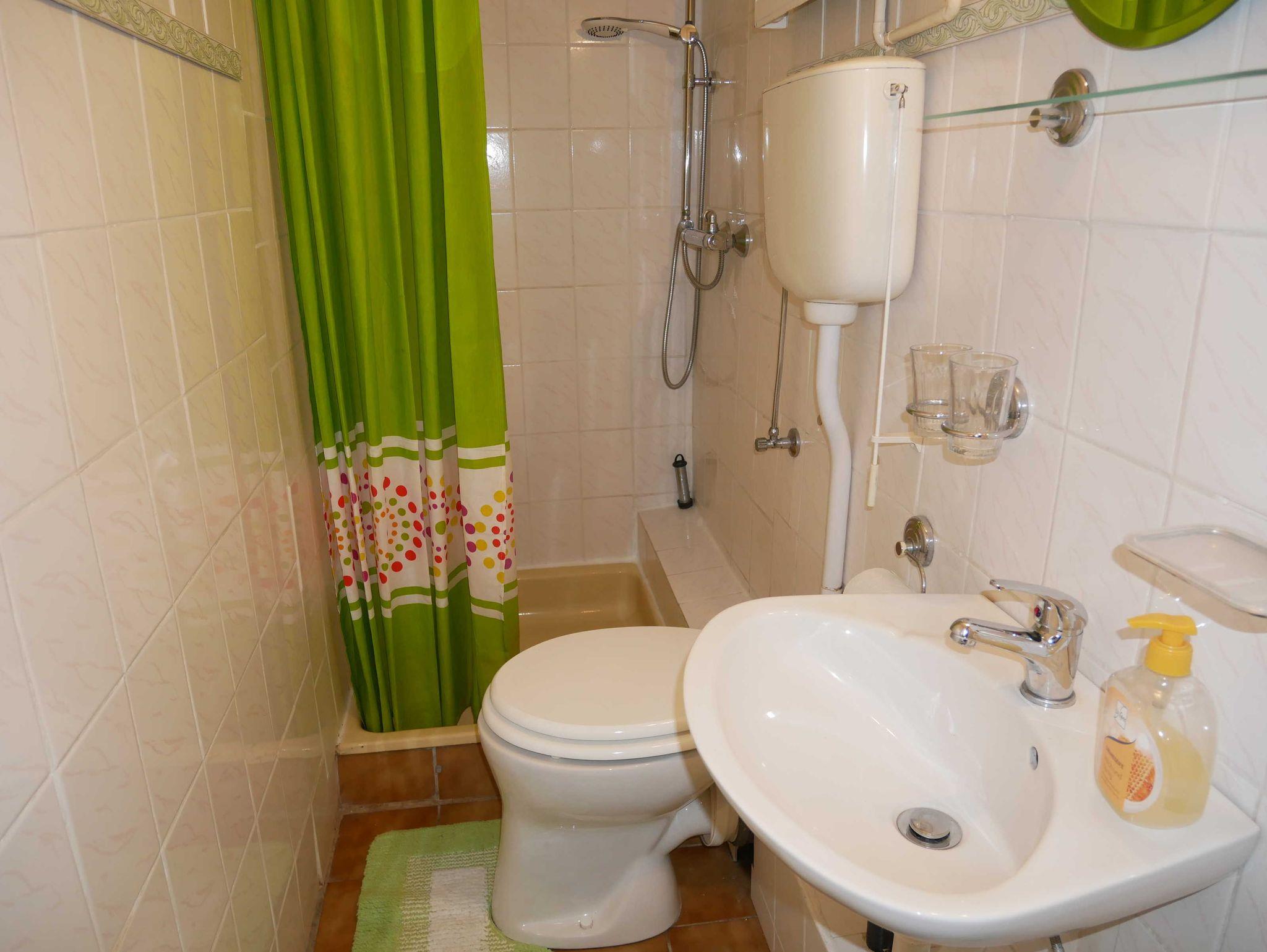 Badezimmer: Dusche mit Duschvorhang, WC und Waschbecken (über eine kleine Stufe erreichbar)