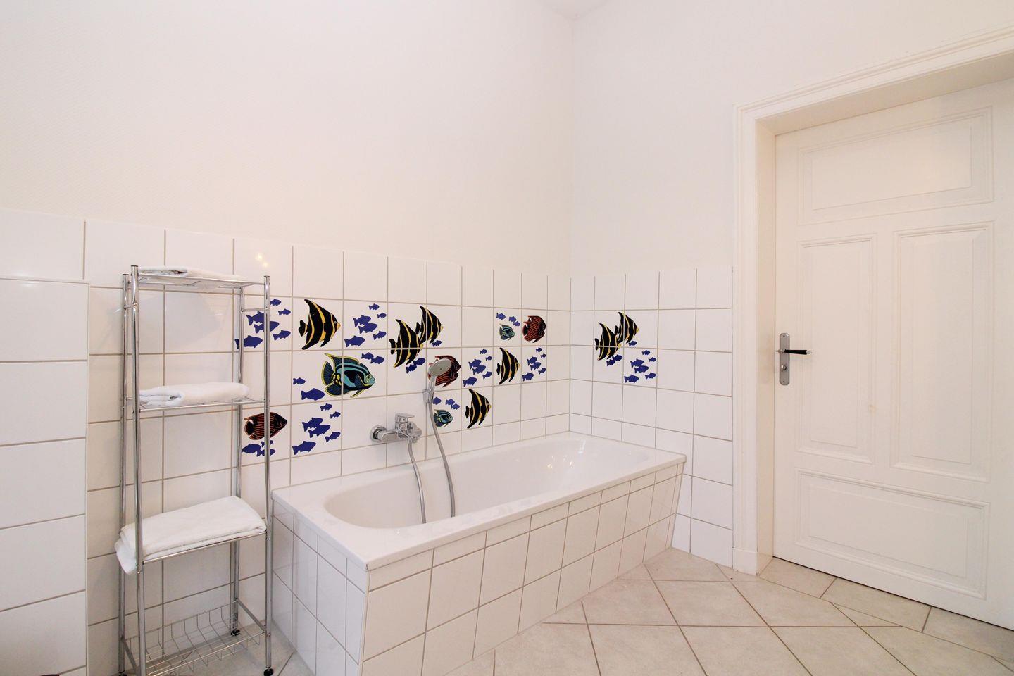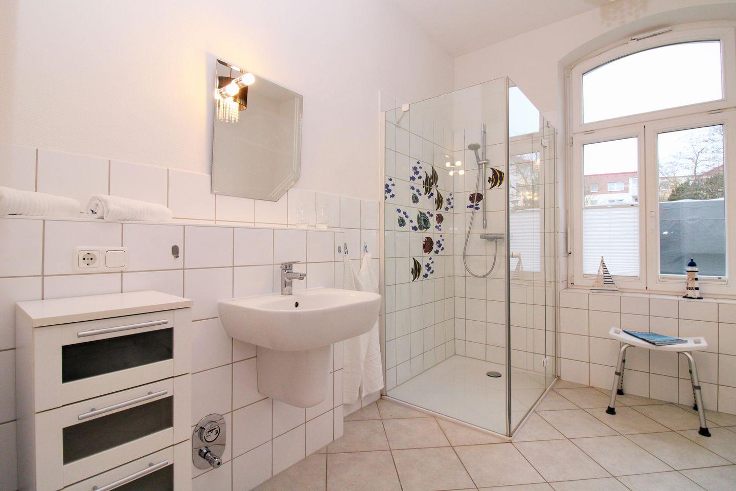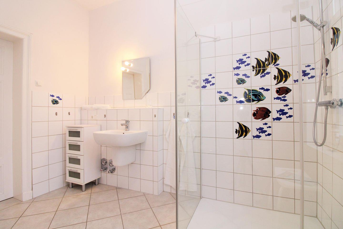 Das moderne und mit farbenfrohen, maritimen Dekorfliesen ausgestattete Badezimmer (mit Tageslicht / Fenster) verfügt über eine Dusche mit ebenerdigem Einstieg (seniorenfreundlich!) und Echtglas-Duschabtrennung, eine zusätzliche Badewanne, Waschbecken, WC, einen Badezimmer-Schrank, ein Regal, einen Föhn sowie ausreichend Ablagemöglichkeiten.