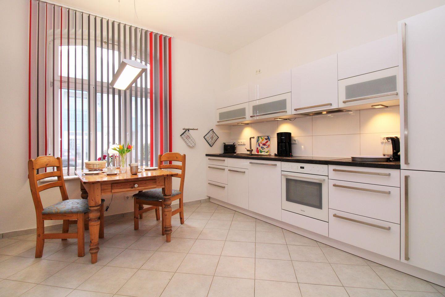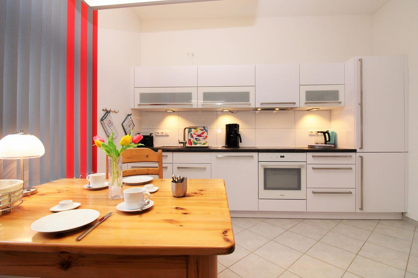 Die separate und geräumige Küche mit Essbereich beinhaltet eine voll ausgestattete Einbauküchenzeile mit 4-Platten-Ceran-Kochfeld, Backofen, Dunstabzug, Mikrowelle, Kühlschrank mit Gefrierfach, Geschirrspülmaschine, Kaffeemaschine, Wasserkocher und Toaster. Darüber hinaus ist die Küche mit einem separaten Esstisch mit Stühlen sowie einem großen Küchenschrank eingerichtet. Die Küche ist mit Geschirr, Gläsern, Besteck und Töpfen komplett ausgestattet.