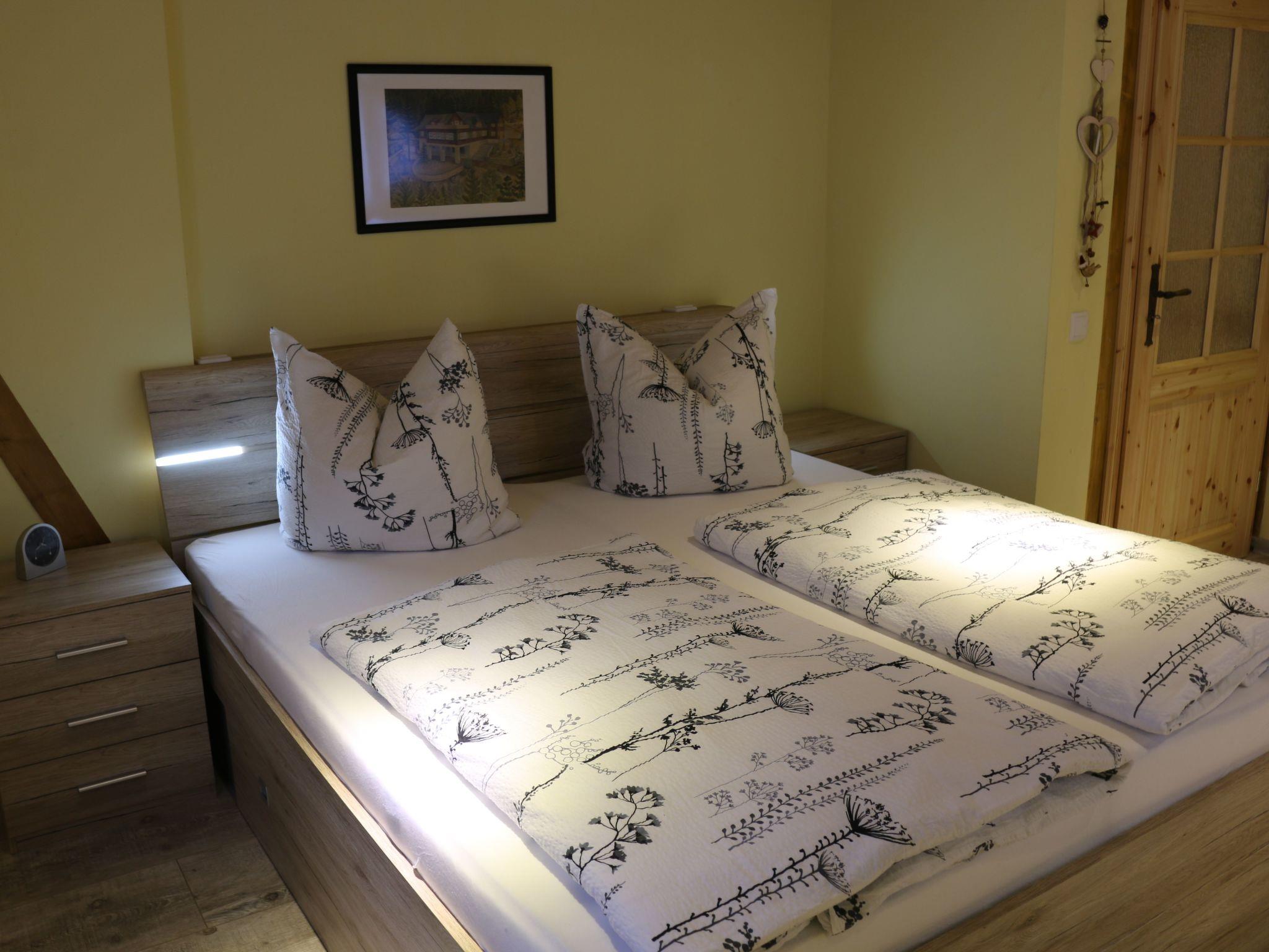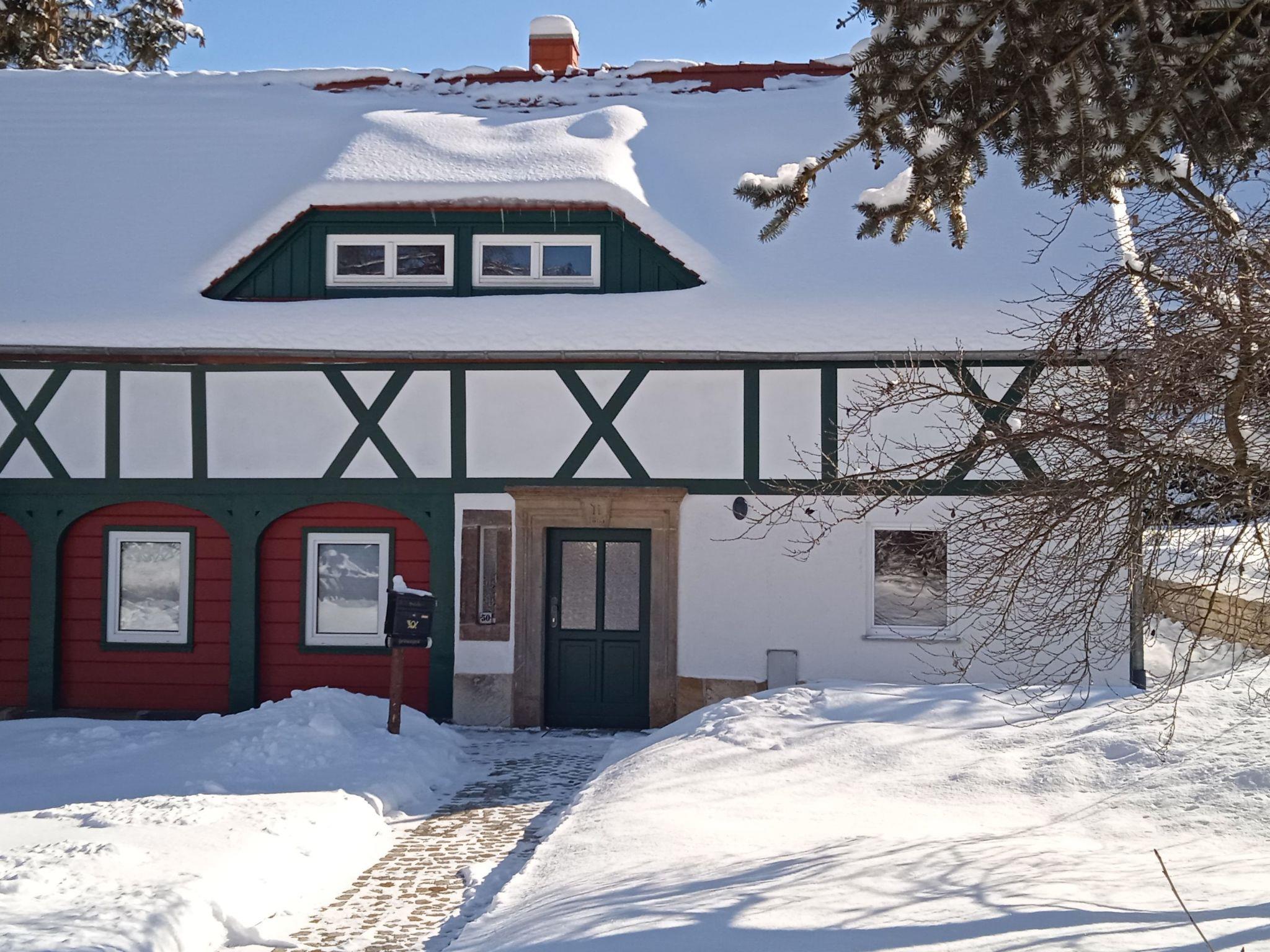 In one of the smallest low mountain ranges in Europe, in the south-easternmost tip of Saxony, you will find what is probably the most beautiful part of Upper Lusatia, the Zittau Mountains along the border between Saxony and the Czech Republic.our pretty little town with its pleasant climate and picturesque half-timbered houses is worth a visit at any time of year. Enjoy the spring awakening in the mountains, mild summer days or colourful autumn forests, hiking, climbing, cycling or swimming, there is something for everyone. In winter too, young and old can enjoy skiing, ice skating, winter hiking or tobogganing to their heart's content. The holiday flat is centrally located in the centre of Jonsdorf, in our renovated Umgebindehaus on the ground floor and offers space for 4 adults. It has 2 bedrooms with 2 beds each as well as a comfortably furnished living / dining area and a fully equipped kitchen.to explore the Zittau Mountains, many hiking trails go directly from the house in all directions such as to Waltersdorf, Oybin, Großschönau or the neighbouring Czech Republic.for all railway enthusiasts, a ride on the historic narrow-gauge railway is always an experience! Excursions e.g. to Liberec or Prague are also possible. welcome to our holiday flat!