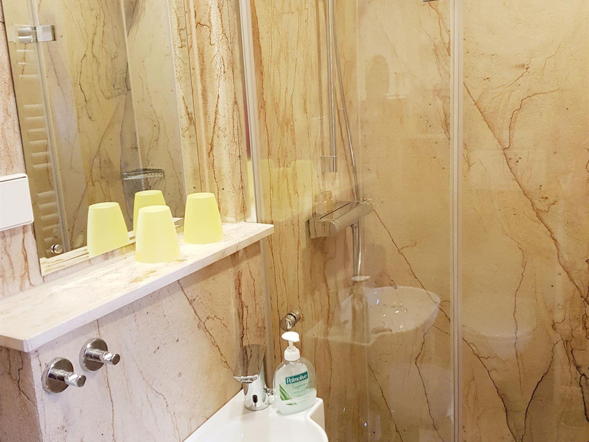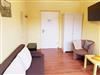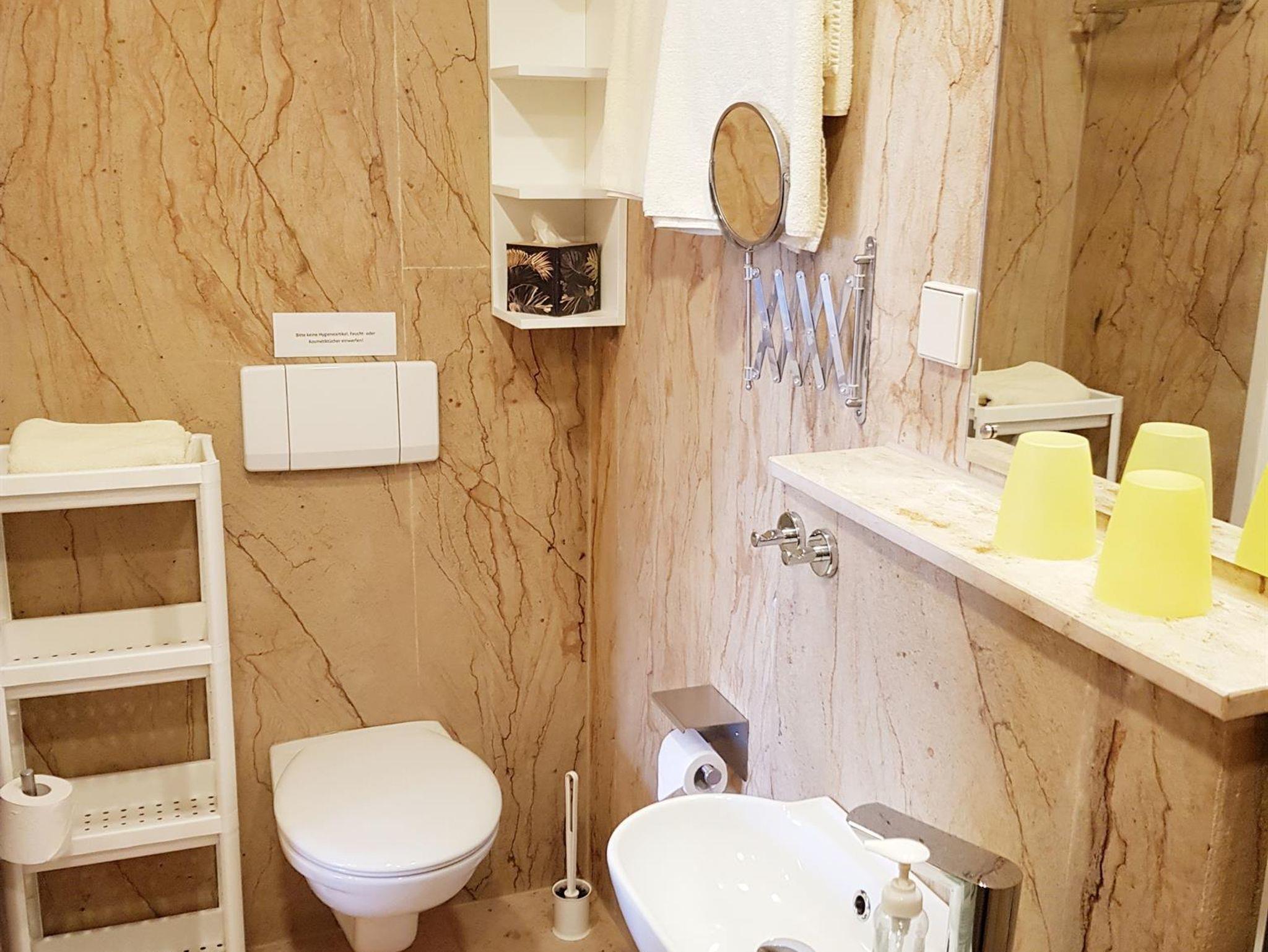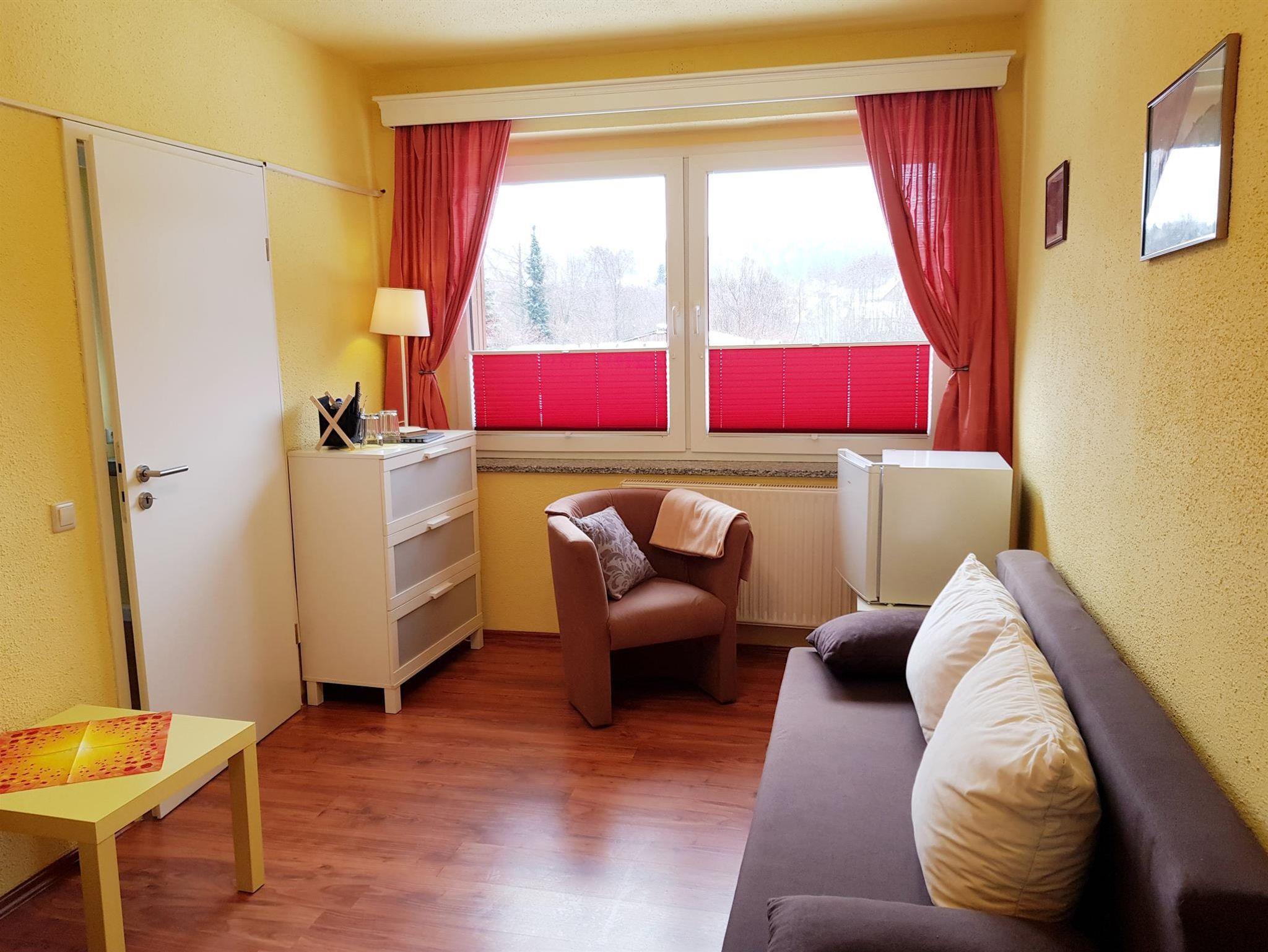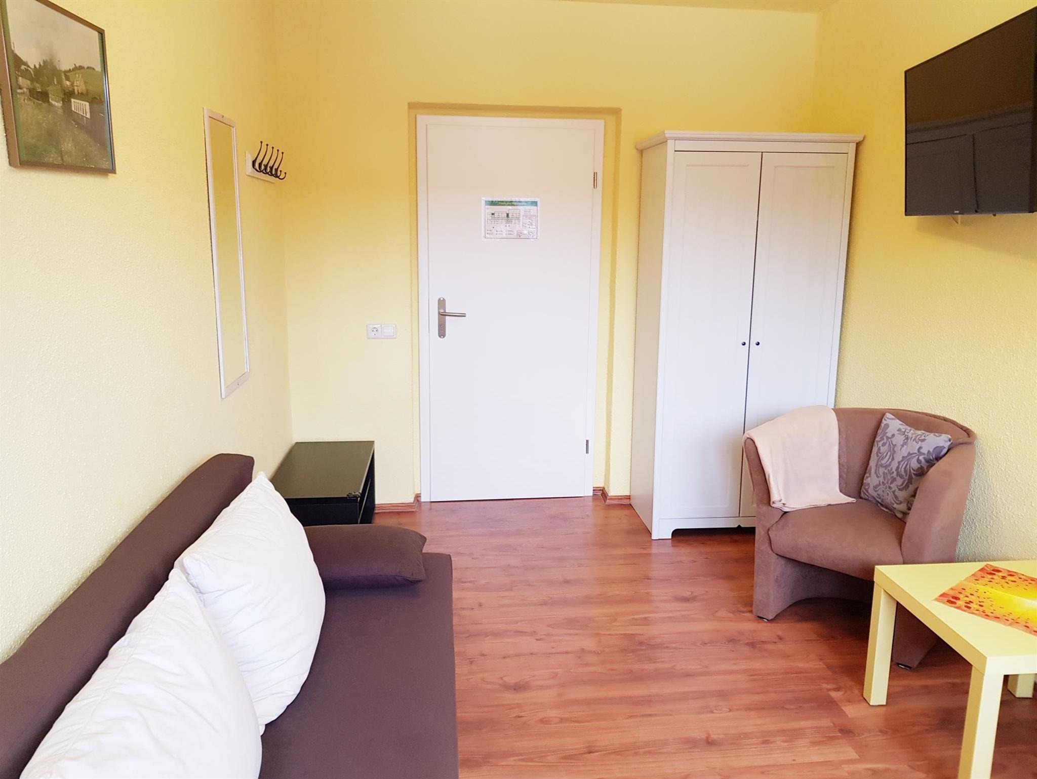 Diese Zimmereinheit im ersten Stock (hofseitig, mit Balkon, aber ohne Bahnblick) besteht aus zwei Zimmern: einem Wohn- und einem Schlafzimmer mit angeschlossenem Bad mit Dusche, Waschbecken, Handtuchheizkörper und WC. Im Wohnzimmer kann die Schlafcouch als Aufbettung für einen Erwachsenen oder zwei Kinder genutzt werden. Es gibt zwei Sessel, einen kleinen Kühlschrank und eine kleine Flasche Wasser (0,5 l). Das Doppelbett ist 180 cm x 200 cm groß, die Schlafcouch ca. 125 cm x 200 cm und die Gesamtgröße der Wohneinheit beträgt 24 Quadratmeter.