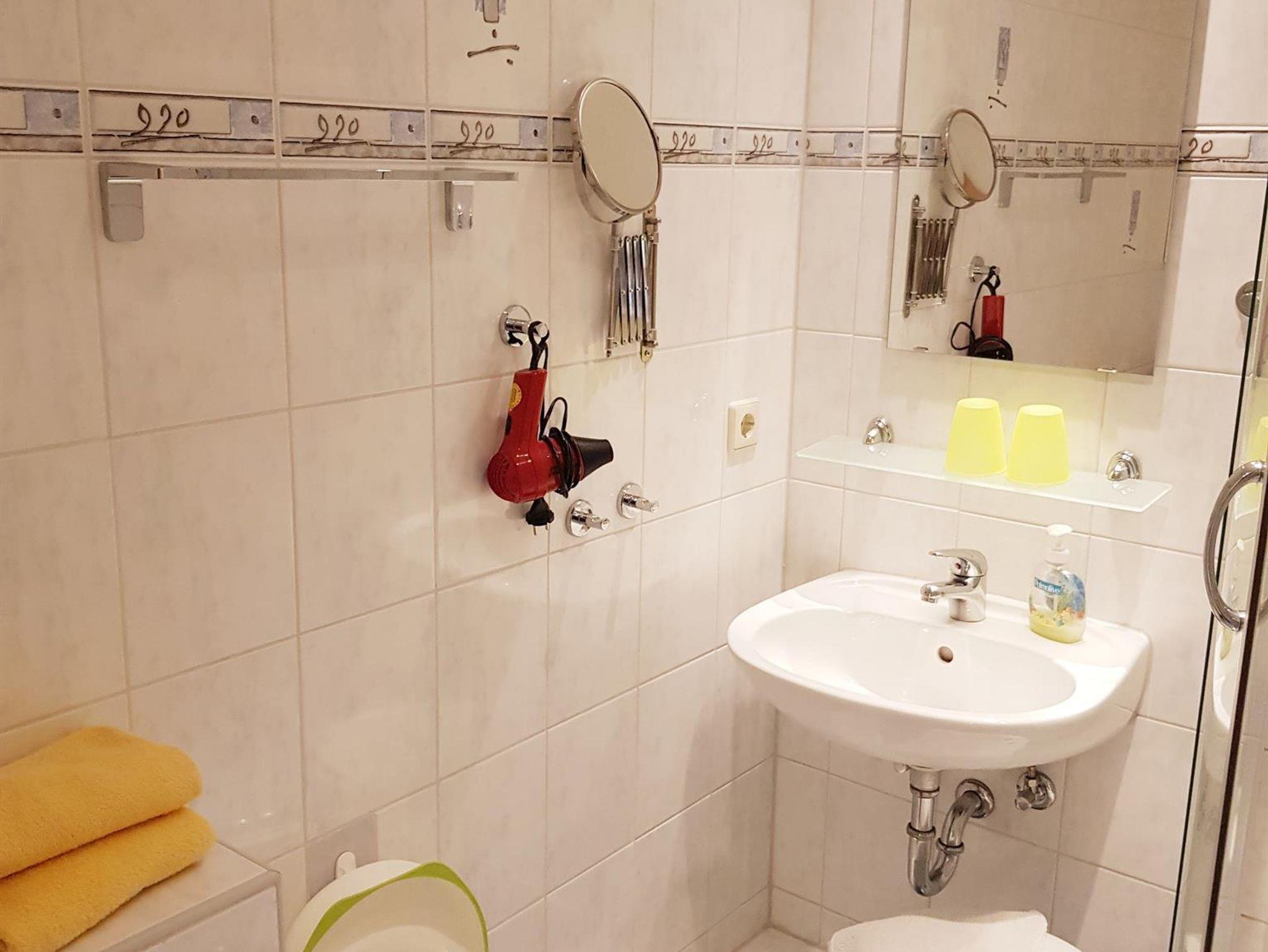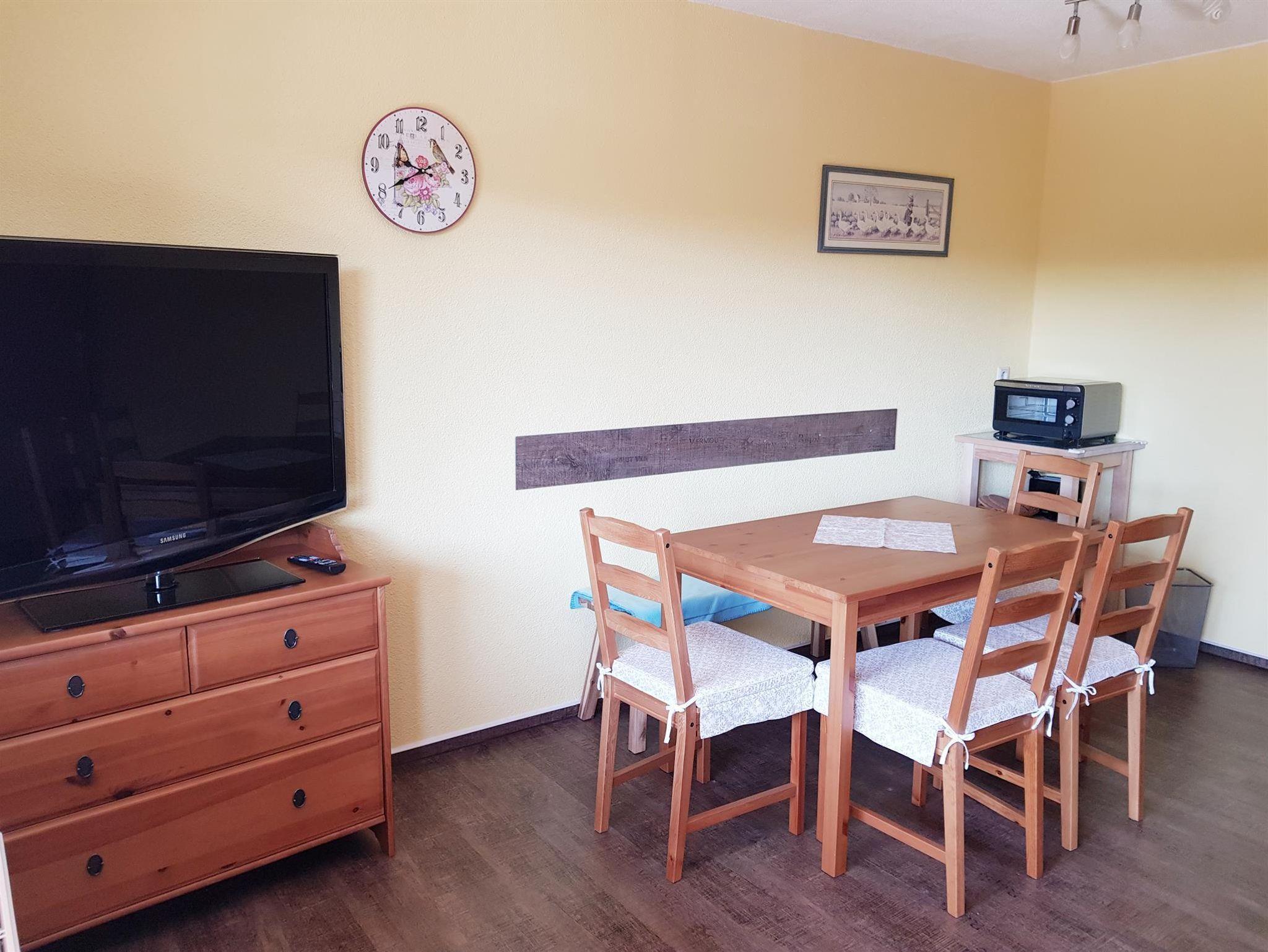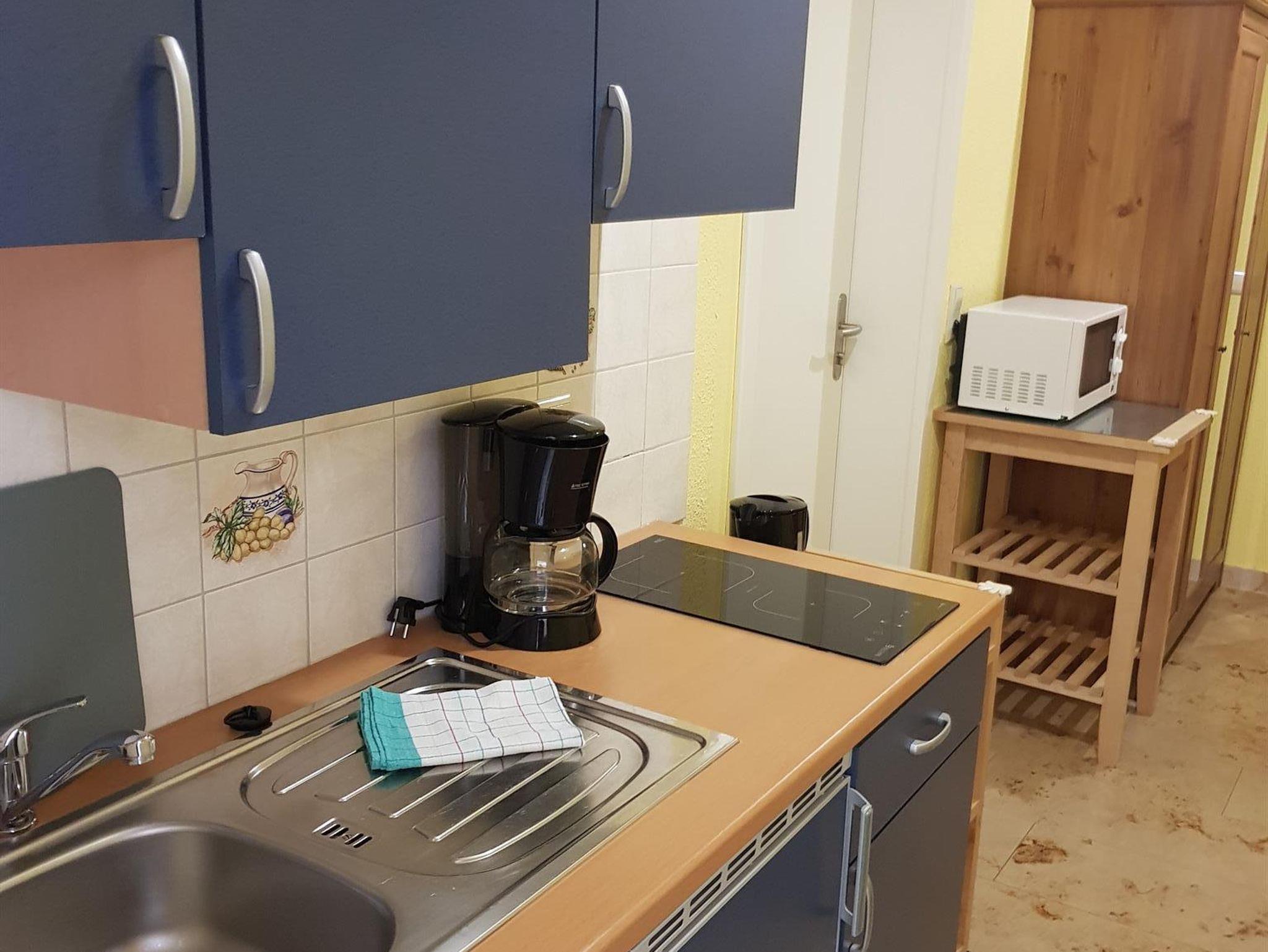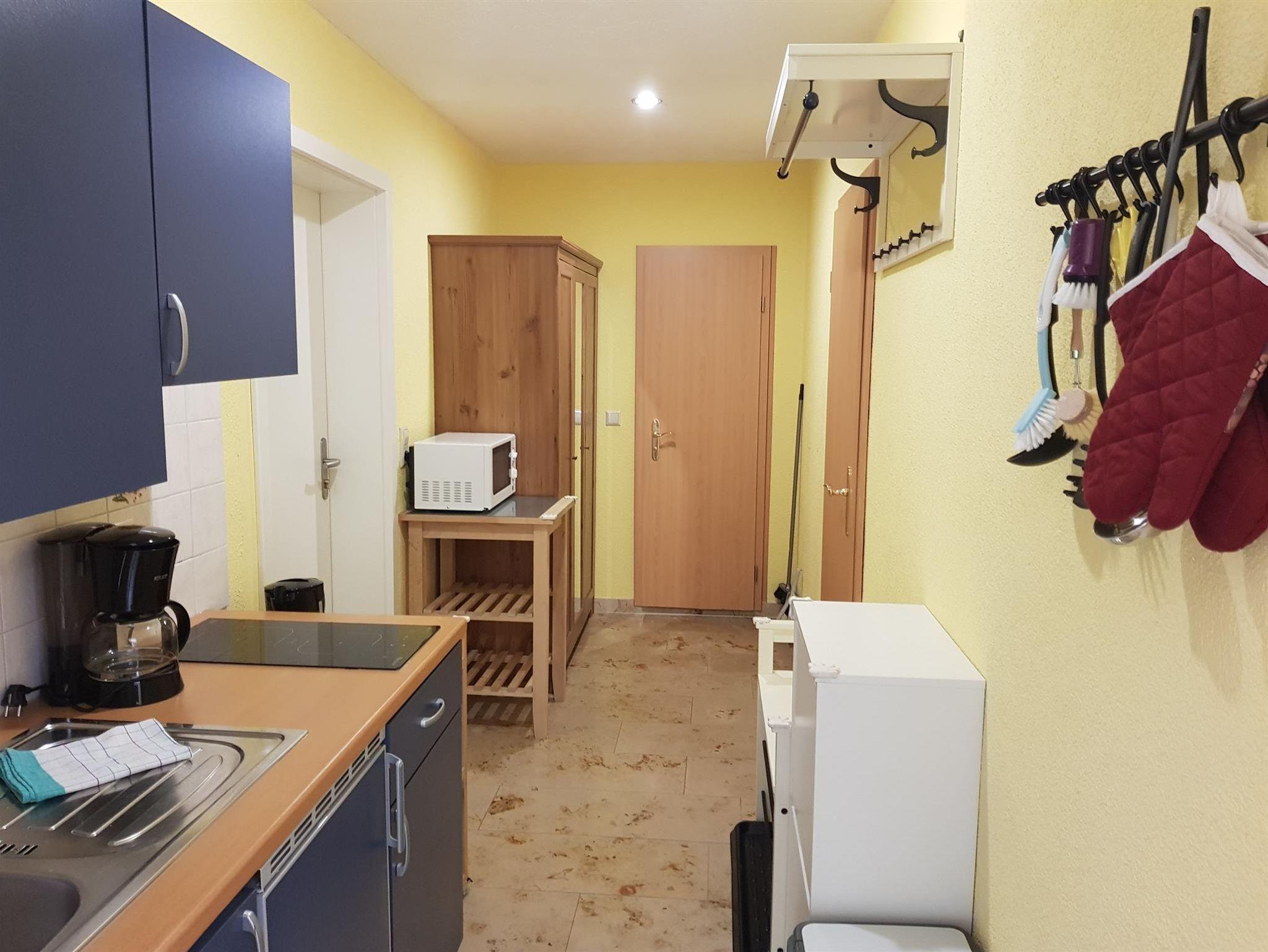 Die kleine Ferienwohnung (erste Etage, hofseitig - ohne Bahnblick!) ist 35 qm groß und verfügt über einen Schlafraum (Bettbreite: 1,60 x 2,00 x - Betten bezogen), ein Bad, eine Diele mit Kochzeile und einen Wohnraum mit Essecke und ausklappbarem Schlafsofa (1,25 x 2,00 m). Vom Wohnzimmer aus betritt man den windgeschützten Balkon. Die Küche beinhaltet zwei Herdplatten, eine Spüle, einen Kühlschrank mit Gefrierfach, eine Mikrowelle, eine Kaffeemaschine, einen Wasserkocher, einen Toaster, Geschirr, Kochgeschirr und Besteck. In der Essecke gibt es zudem noch einen kleinen Backofen. Das Bad verfügt über Dusche/ WC, einen Handtuchheizkörper, einen Fön, einen Schminkspiegel, Kosmetiktücher und flüssige Handseife.