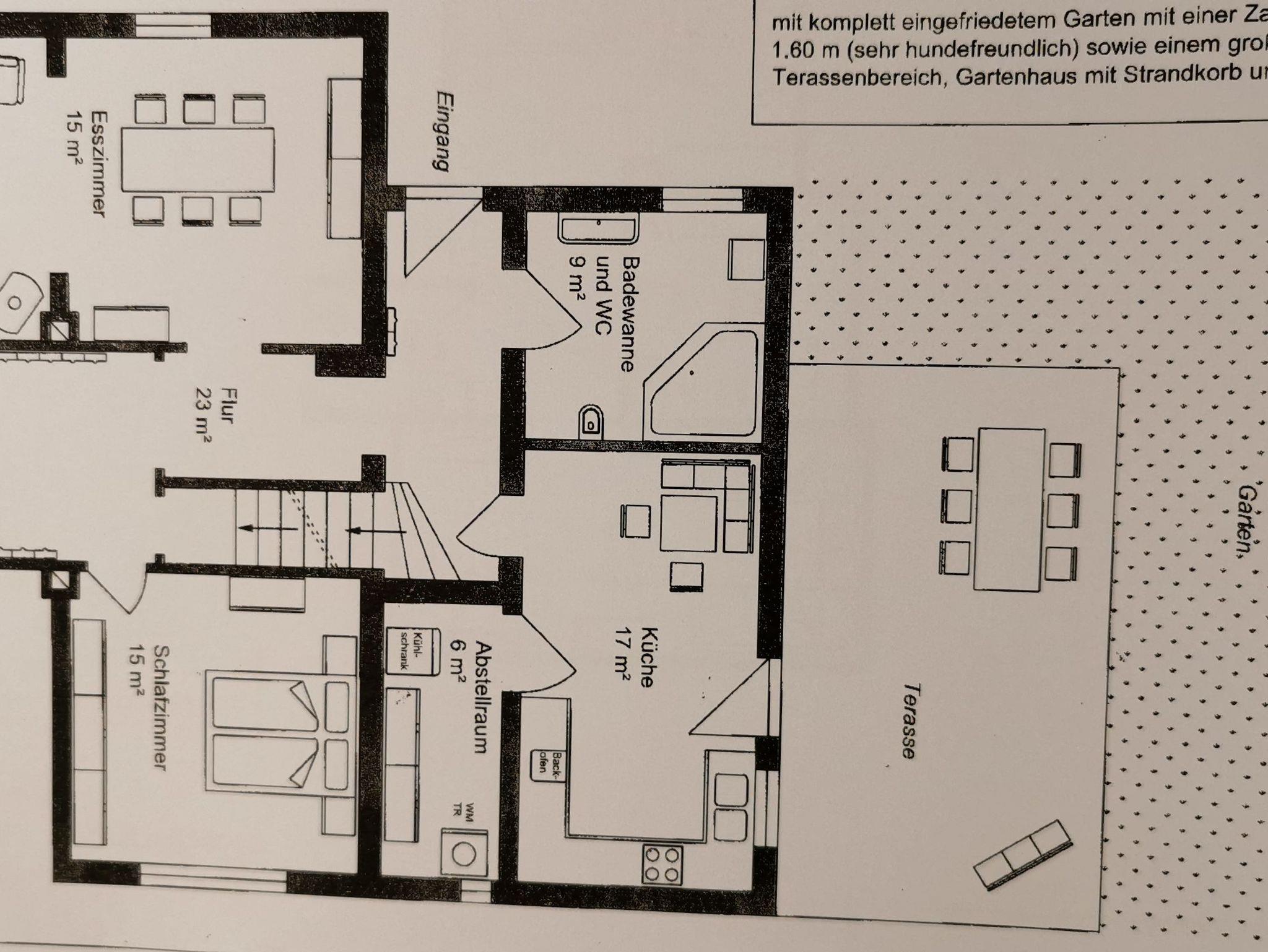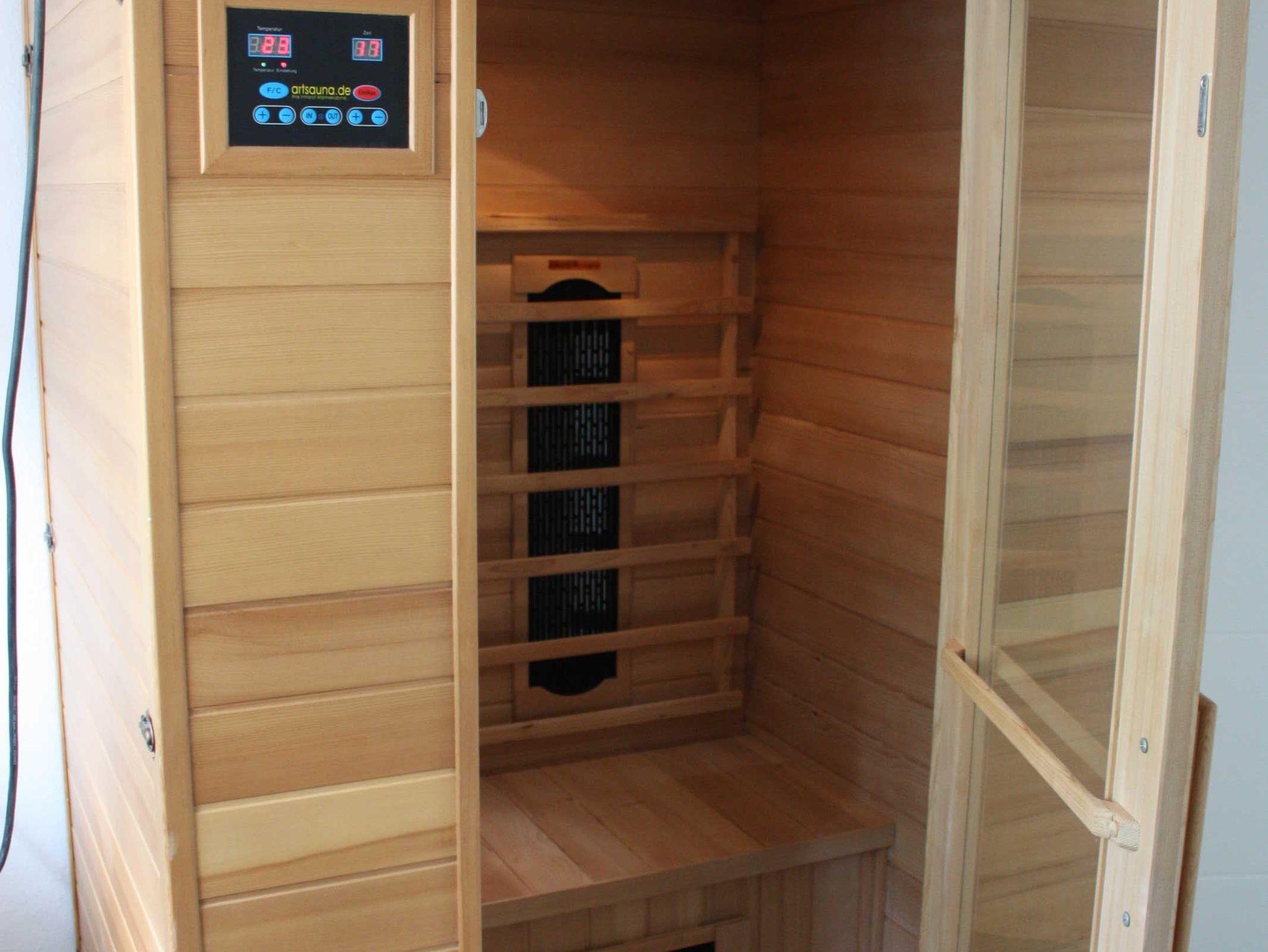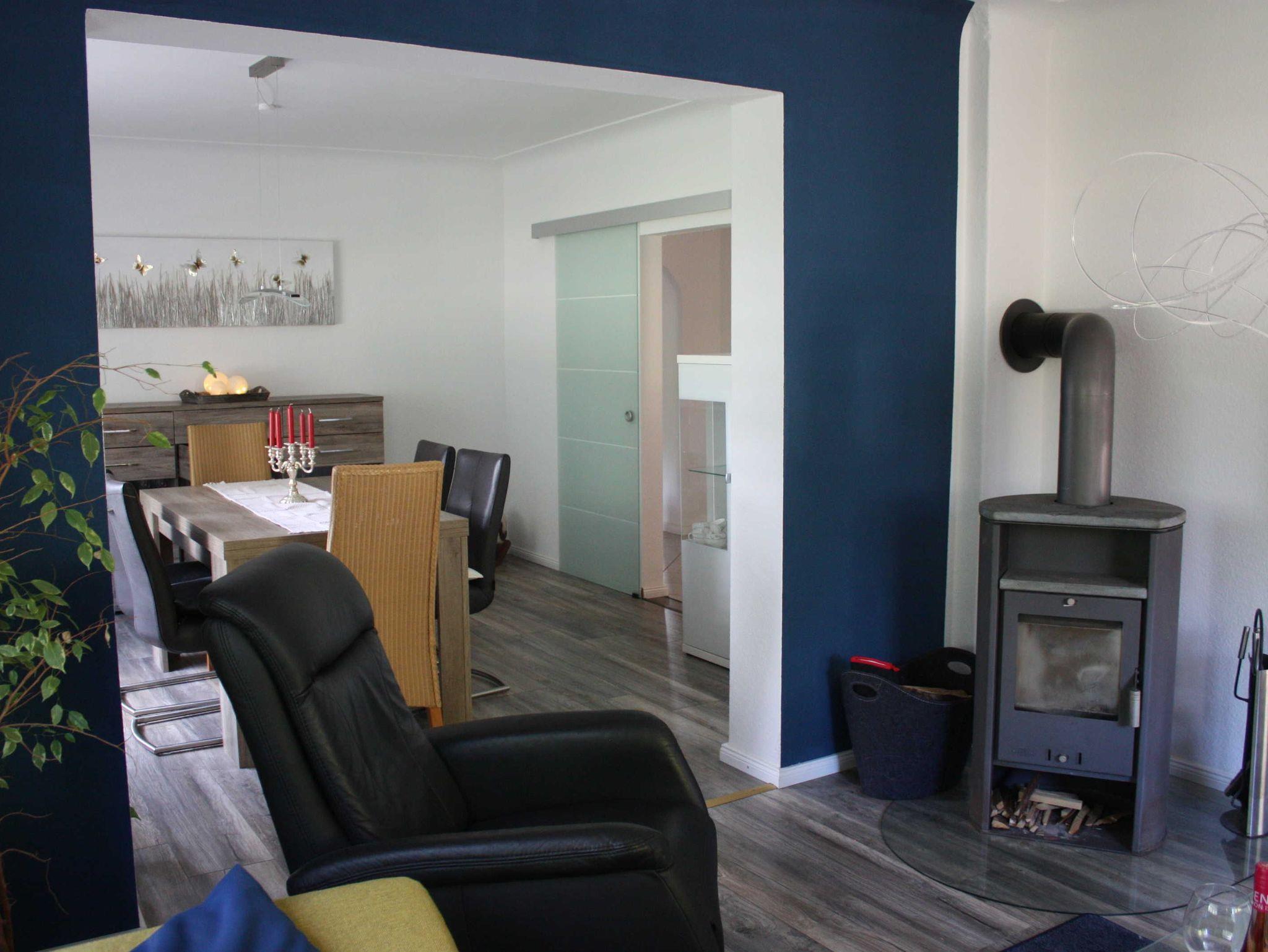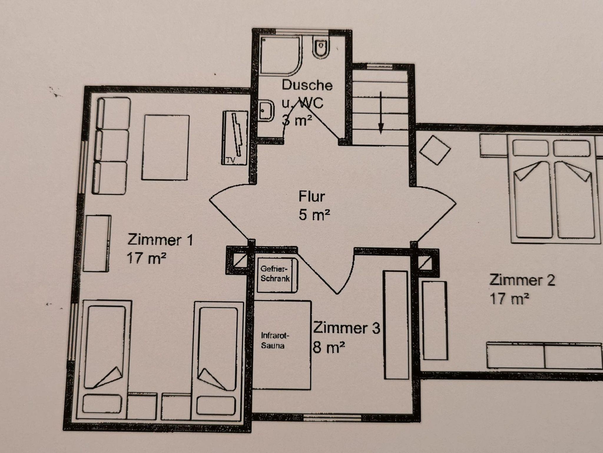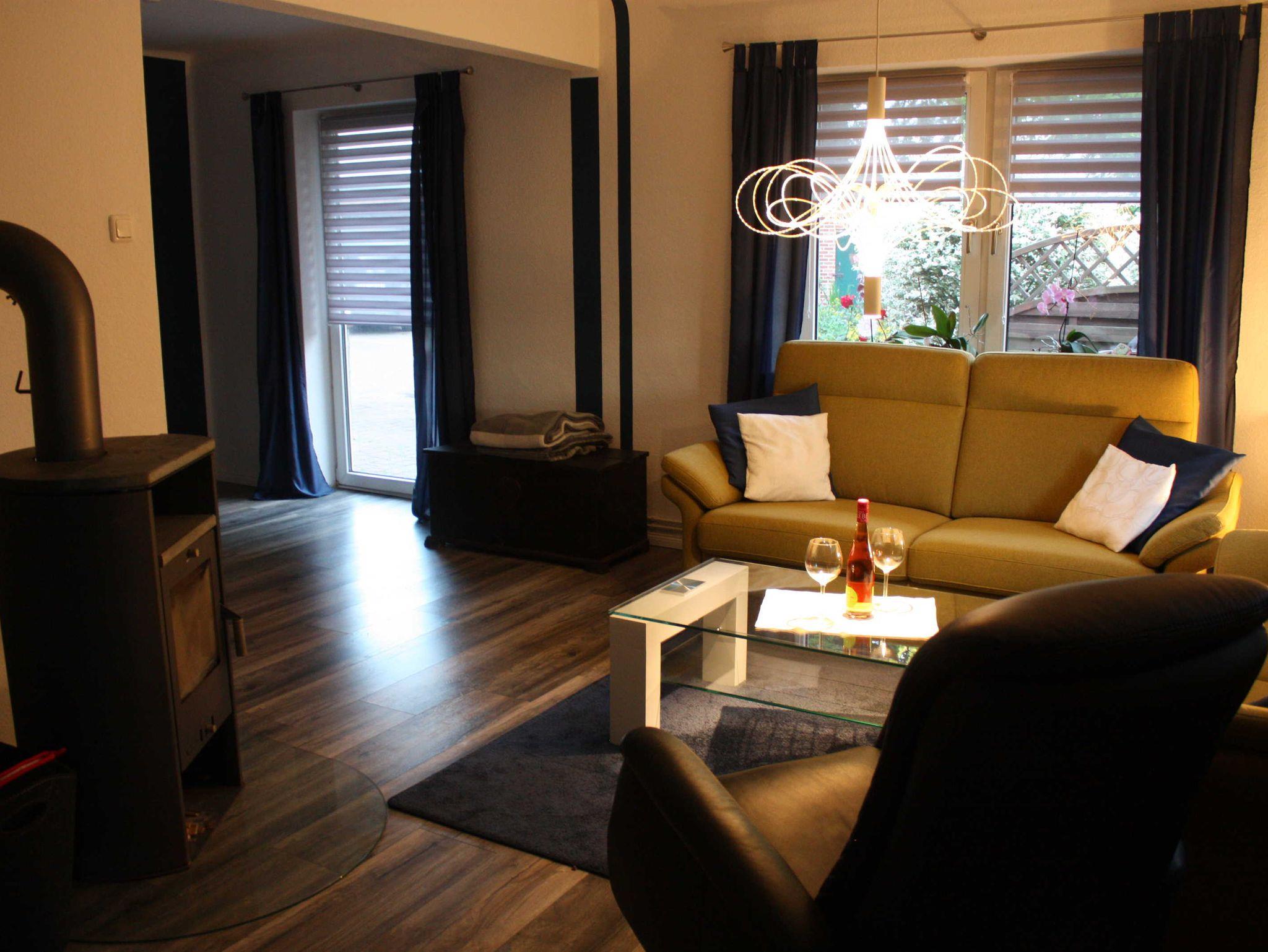Das Haus verfügt über 3 Schlafzimmer, eins davon mit zusätzlicher Sitzecke und TV, 1 Wohnzimmer mit Kaminofen, 1 Esszimmer, vollausgestattete Küche mit Sitzecke, 1 Vollbad mit WC und Eckbadewanne, 1 Gäste-WC mit Dusche, 1 Raum mit Infrarotkabine, 1 Abstellraum mit Waschmaschine und Trockner