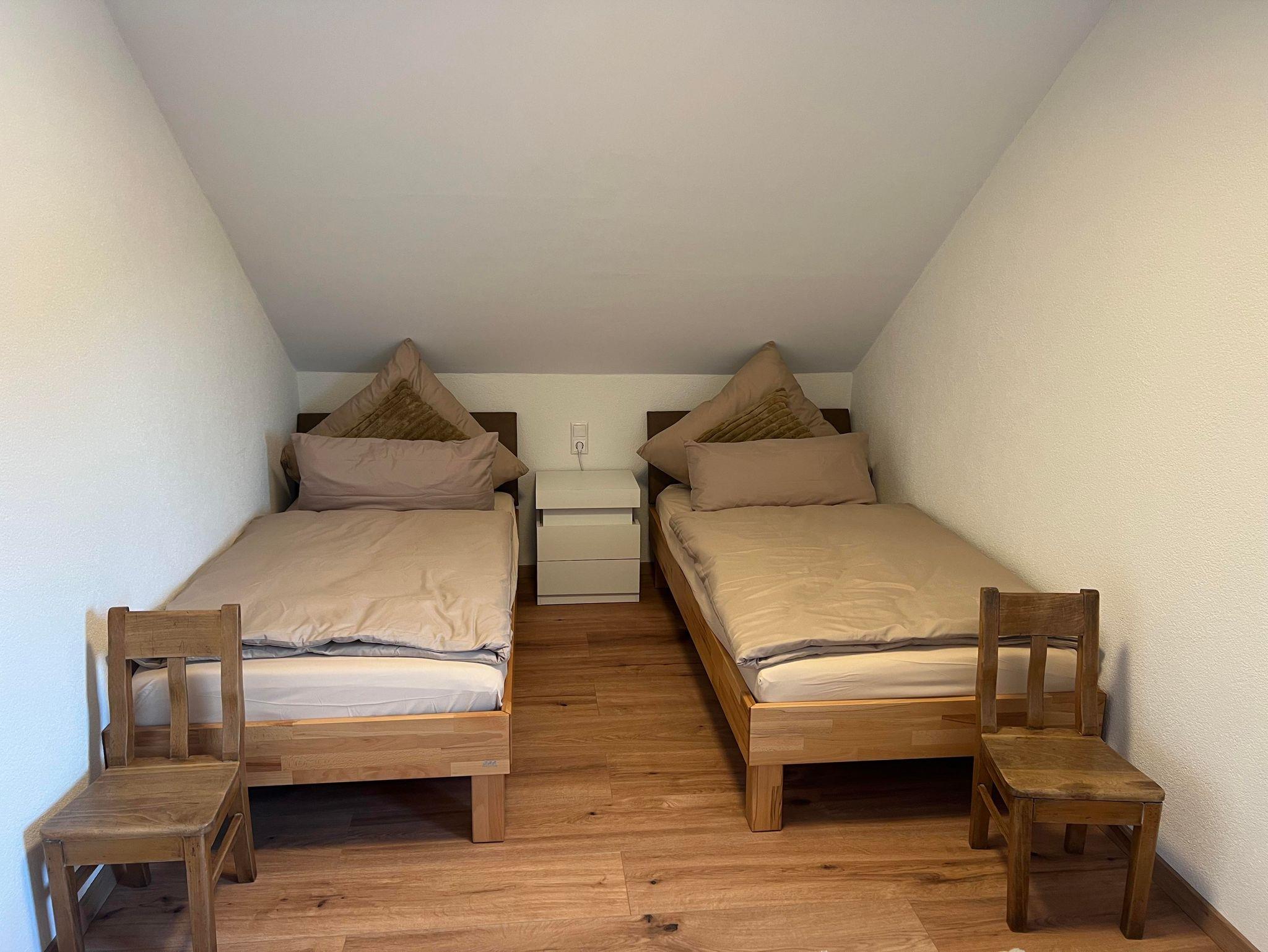 Die Wohnung verfügt über zwei gemütliche Schlafzimmer: eines mit einem komfortablen Doppelbett, das andere mit zwei Einzelbetten. Zusätzlich bietet eine praktische Schlafcouch im Wohnbereich weitere Schlafmöglichkeiten.