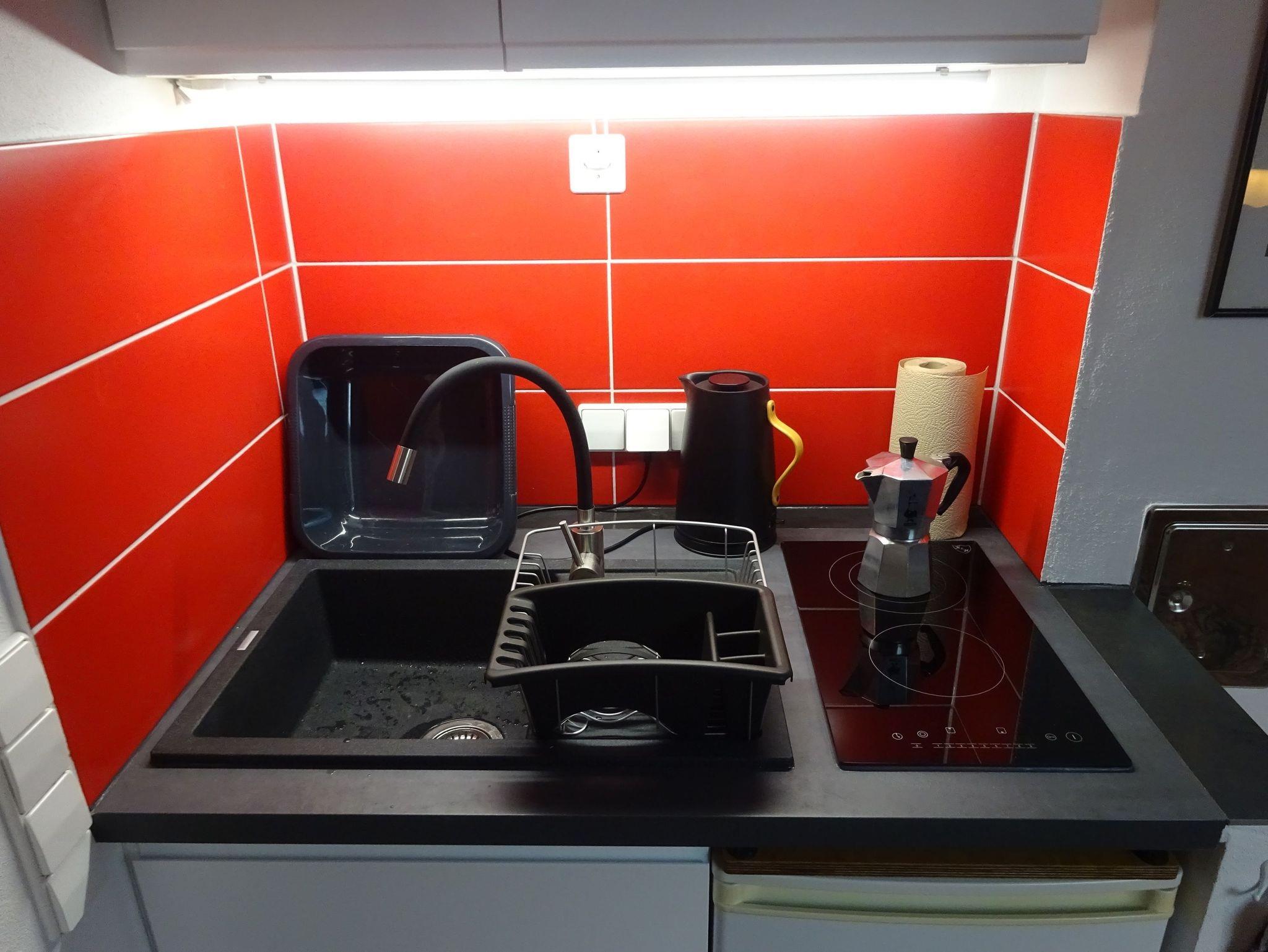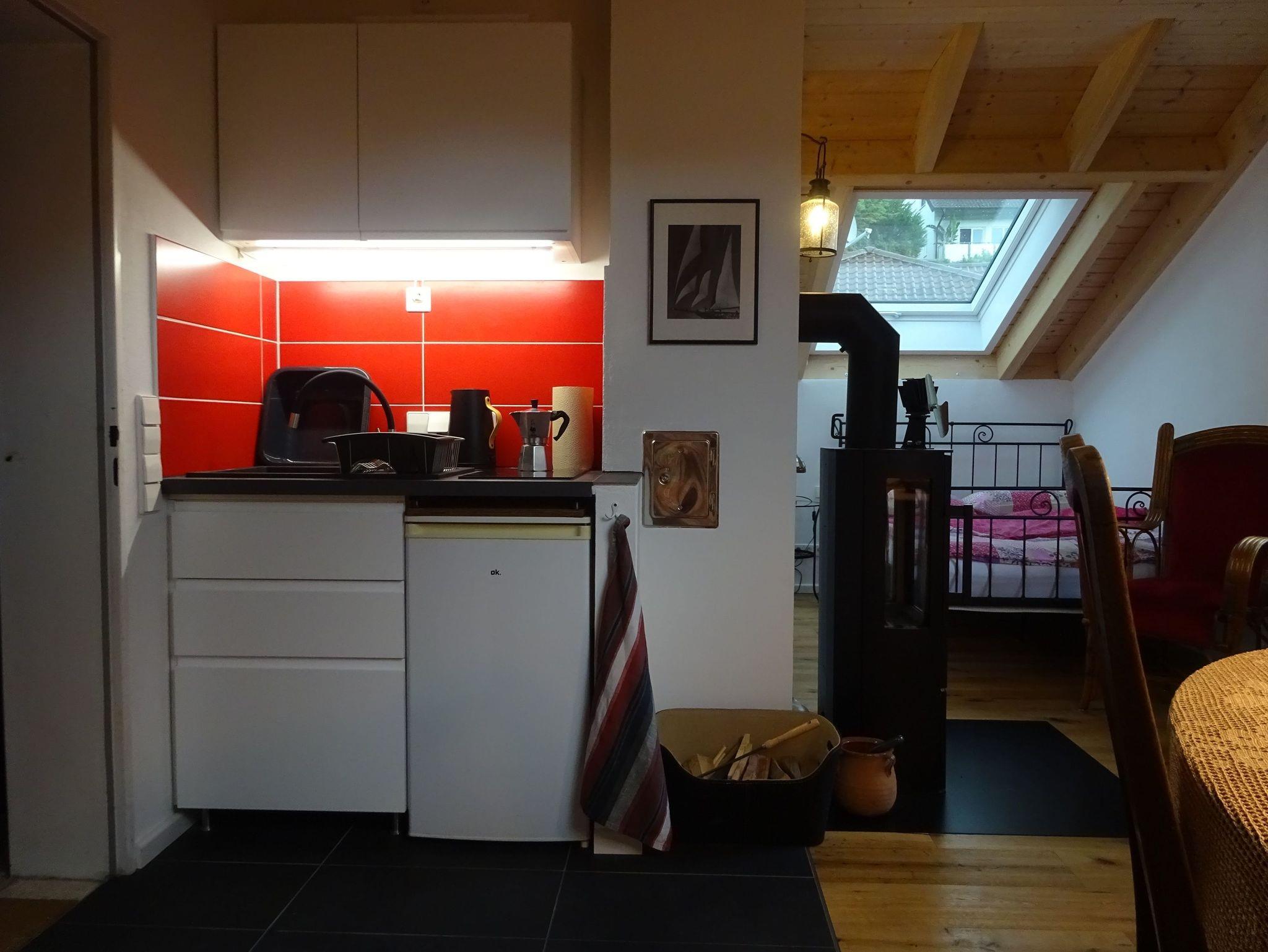 Ein französisches Bett lädt zum Ausschlafen ein, während der offene Wohnbereich mit Kaminofen und elektrischer Fußbodenheizung auch an kühlen Tagen für Wohlbehagen sorgt. Die kleine, aber gut durchdachte Miniküche ist mit zwei Ceranfeldern, einem Kühlschrank, einem Wasserkocher, einer Kaffeemaschine und einem Toaster ausgestattet, ideal für das Frühstück oder eine einfache Mahlzeit zwischendurch.