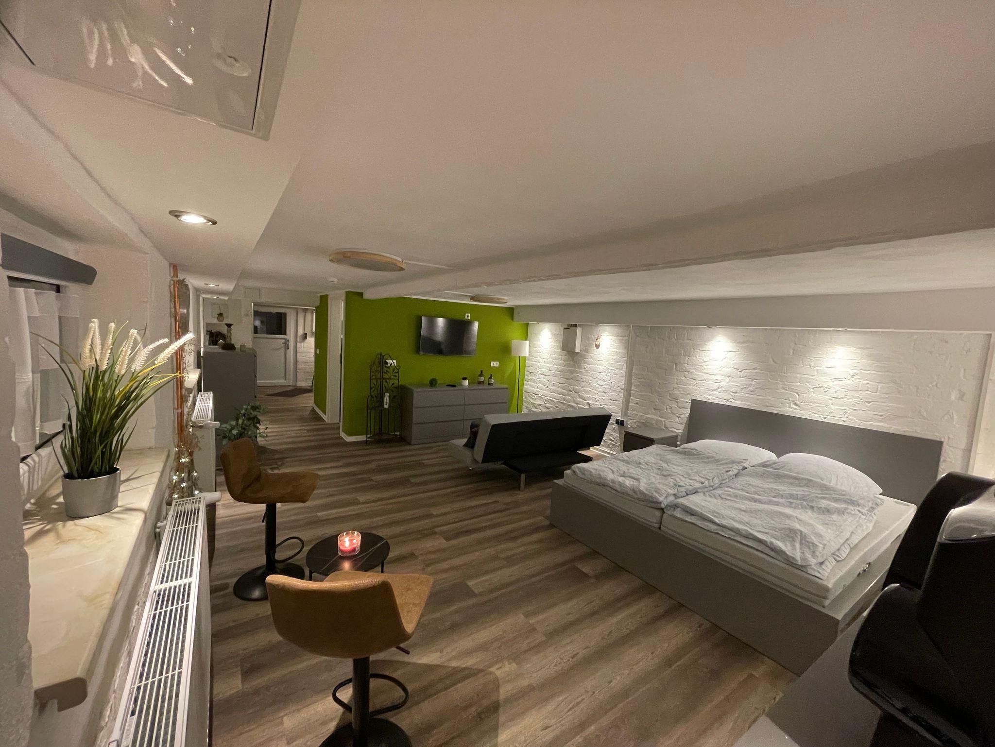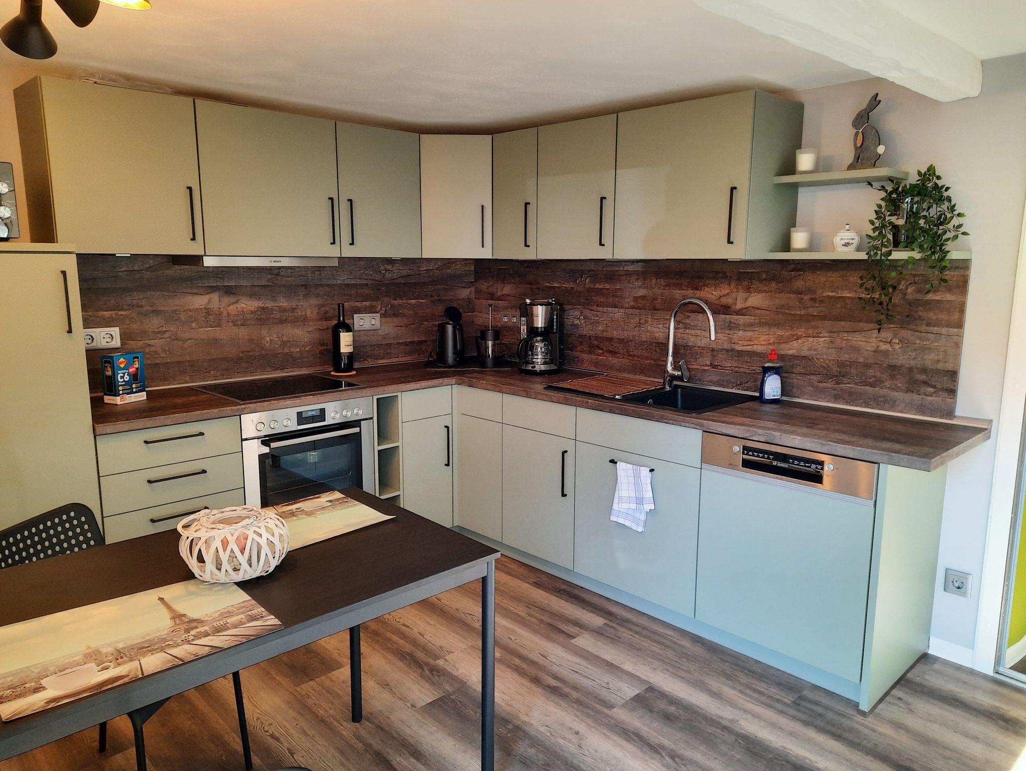 Die Ausstattung der Ferienwohnung mit einer Einbauküche, einem Bad mit Dusche und Waschmaschine, einem Schlaf- und Wohnbereich mit Doppelbett, Schlafcouch, sowie Fernseher lädt Sie herzlich ein, für Ihre ganz eigene Auszeit.