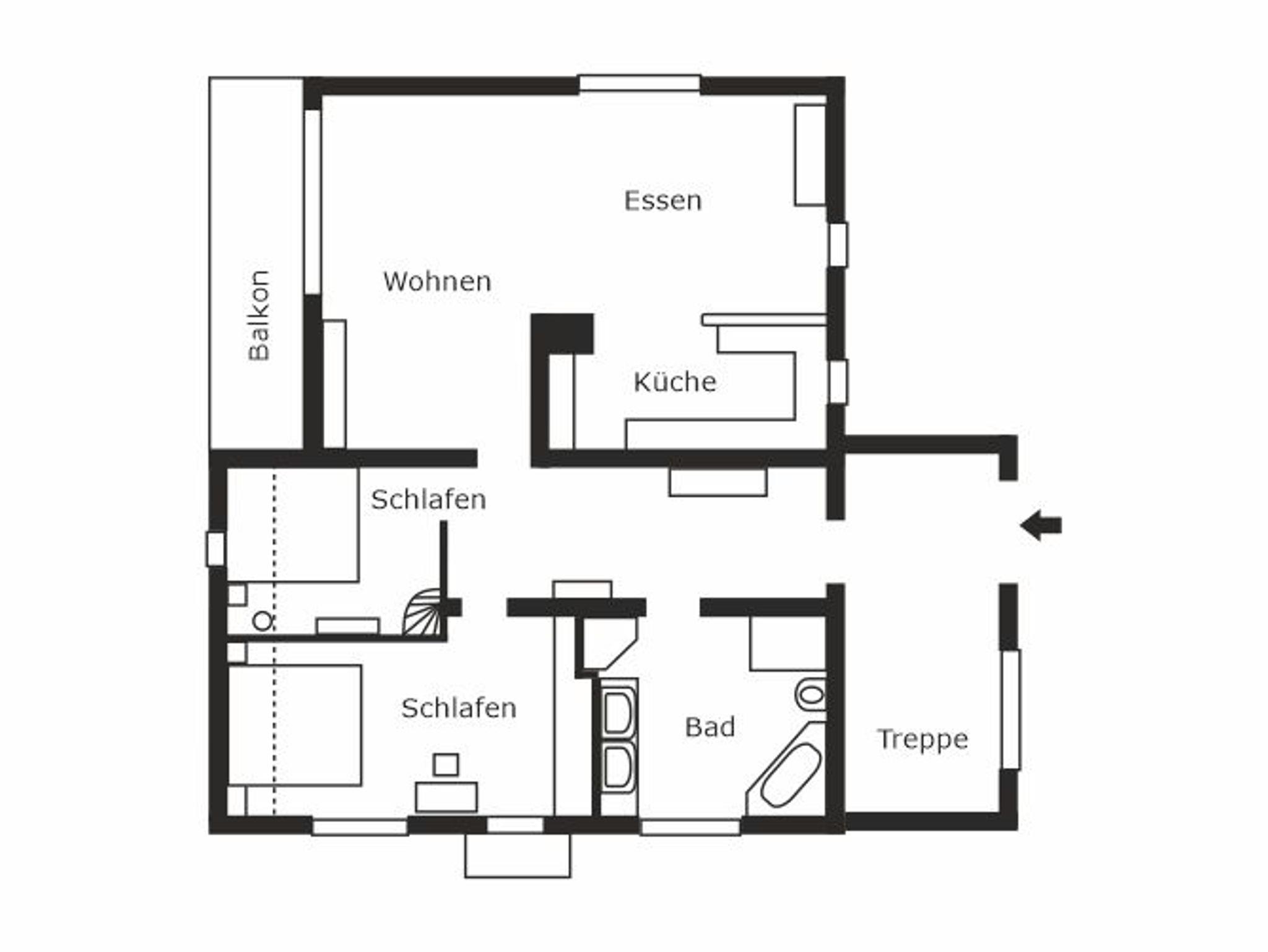 Die größere modern eingerichtete Ferienwohnung befindet sich im Obergeschoß des Wohnhauses und hat einen separaten Eingang. Sie verfügt über eine voll ausgestattete Küche, zwei Schlafbereiche, einen großen Speise- und Wohnbereich mit Balkon, TV, Radio und Telefon, ein geräumiges Bad mit Dusche, WC, Waschmaschine und Haartrockner, Fußbodenheizung und WLAN.